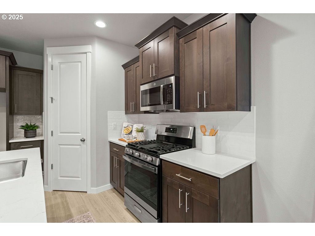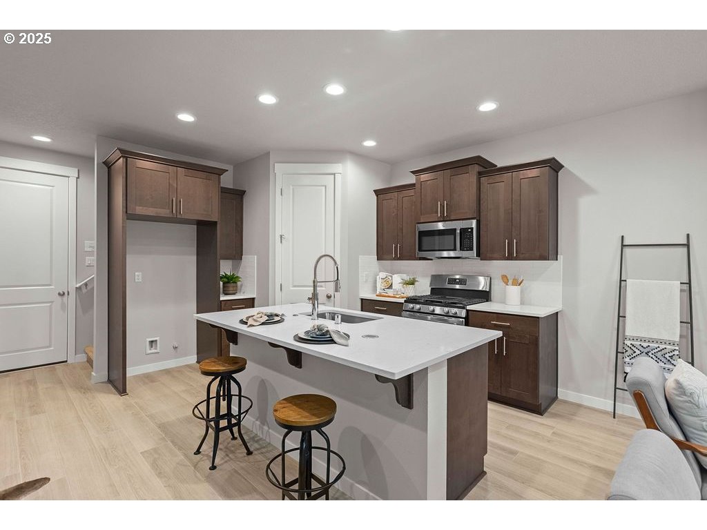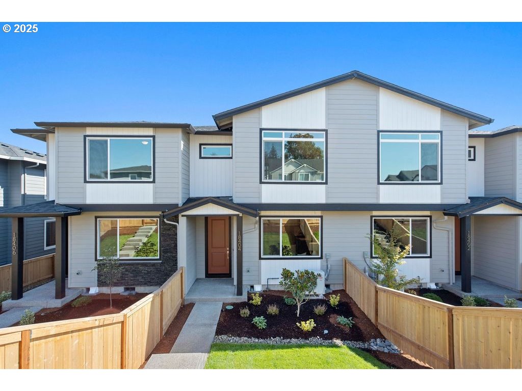Ramble Creek is a beautiful brand new community with parks, playgrounds, a dog park, mountain views and greenspaces. The 1626 Floor Plan has 3 bedrooms and 2.5 bathrooms and a 2-car garage with an alley load driveway. This is a low-maintenance way of life because the HOA mows the lawn in your fully fenced yard. This plan has a great layout, the kitchen features a large corner pantry, eat-in island, gas range, stainless steel appliances, dining nook, beautiful trim work, A/C, impressive 9-foot ceilings and 8-foot doors on main level, plus full-height mirrors in bathrooms. Upgrades included it the price: quartz countertops, full tile backsplash and laminate flooring throughout main floor. Photos are actual photos of this townhome for sale. Set your GPS to 4519 NE 183rd Street Vancouver, WA 98686 and check in at the model home for your tour!