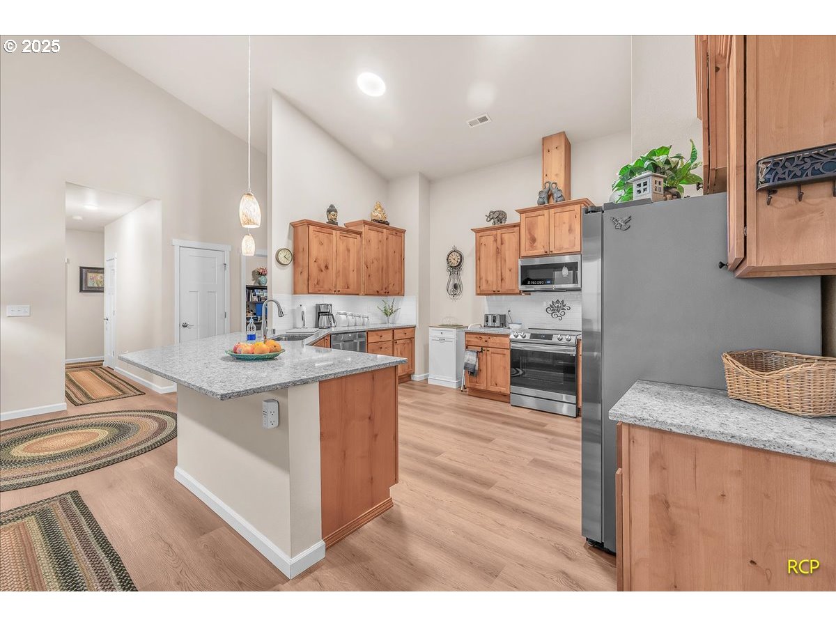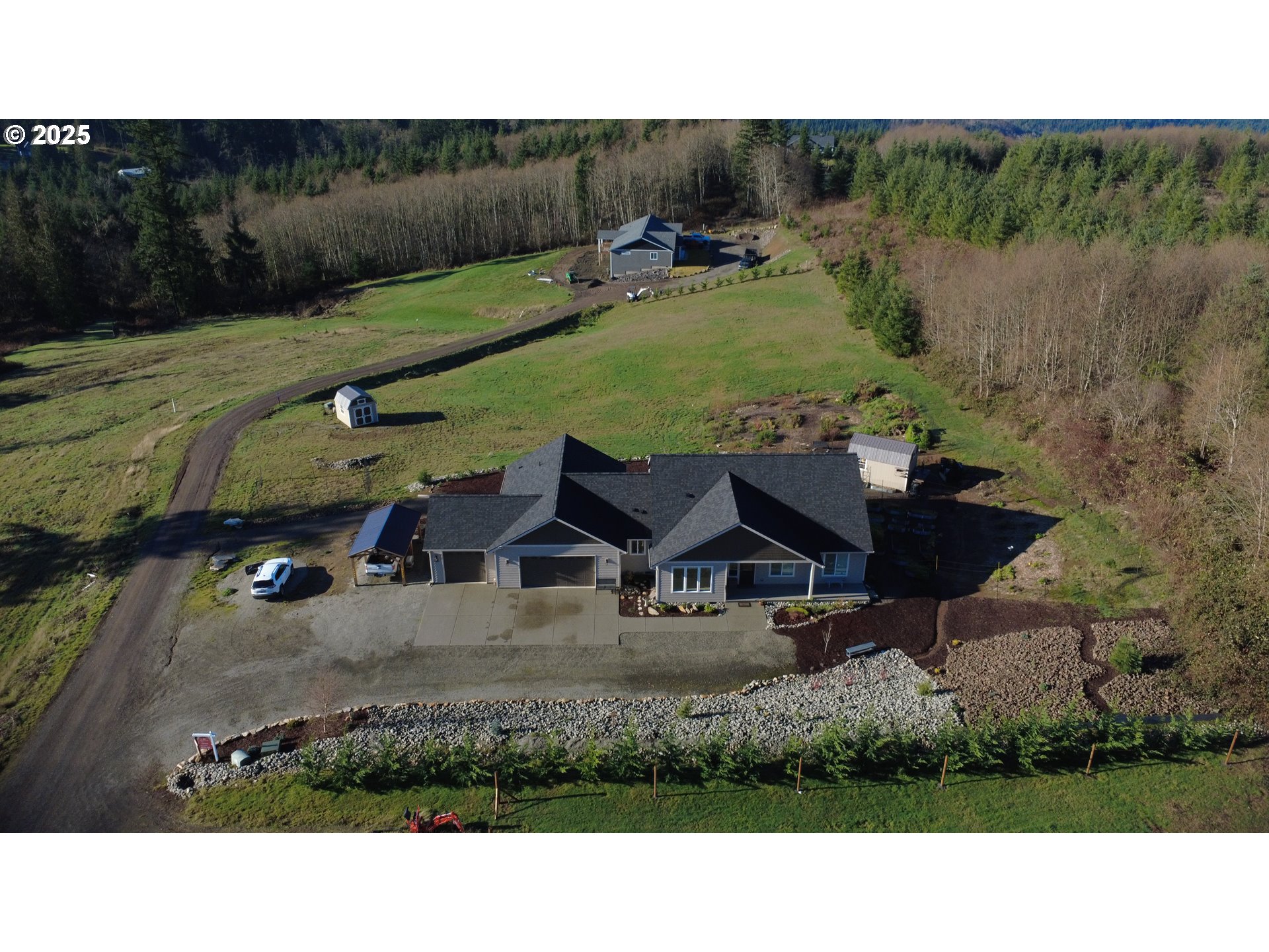 This gently lived-in 2022 custom home stands out for its craftsmanship, thoughtful layout, and beautifully landscaped 2-acre setting with full yard drainage—a rare blend of quality and comfort. Enter into a vaulted great room with territorial views framed by oversized Milgard windows and engineered hardwoods installed by Cascade Flooring. The kitchen is designed for both cooking and gathering, featuring quartz countertops, a walk-in pantry, kraftmaid cabinetry and stainless-steel appliances. All appliances plus the washer and dryer are included for convenience.Two spacious primary suites anchor the home on opposite sides, each offering a walk-in closet and full bathroom, providing ideal separation for guests, multigenerational living, or privacy. A dedicated office with high-speed fiber optic internet supports modern remote work needs. Additional features include a 3-car garage, carport, and space for RV parking. Extra storage can be found with two large, lofted sheds.The grounds—cultivated by a former commercial nursery worker—are a true highlight: spring blooms ready to emerge, fruit trees, vegetable beds, and nearly 50 cypress and Leland trees adding beauty and structure. This property is fully turnkey, expertly built, and positioned to take advantage of today’s improved interest rates. A rare opportunity to own a newer home where quality and livability take center stage in Kalama Washington.