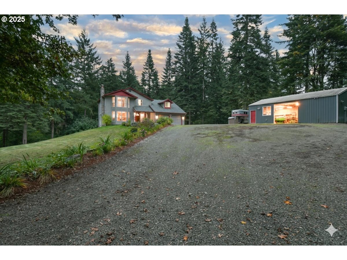 Beautiful Valley View home nestled among old grown trees on 5-acres. Located 10 minutes from Lewis River Rec area. Charming views from nearly every room. Cozy fireplace in the living room and wood stove in the family room. Stunning kitchen with a farmhouse sink, stainless steel appliances and eating bar. Primary + 3 more bedrooms and office area upstairs. 2582 sqft + 1104 sqft daylight basement. Outdoor features include spacious deck, RV parking, shop, greenhouse, chicken coop and storage shed. Several key upgrades in 2022, including the installation of a new water heater; Mitsubishi Hyper-Heat system by Intek Corp.; and security gates.