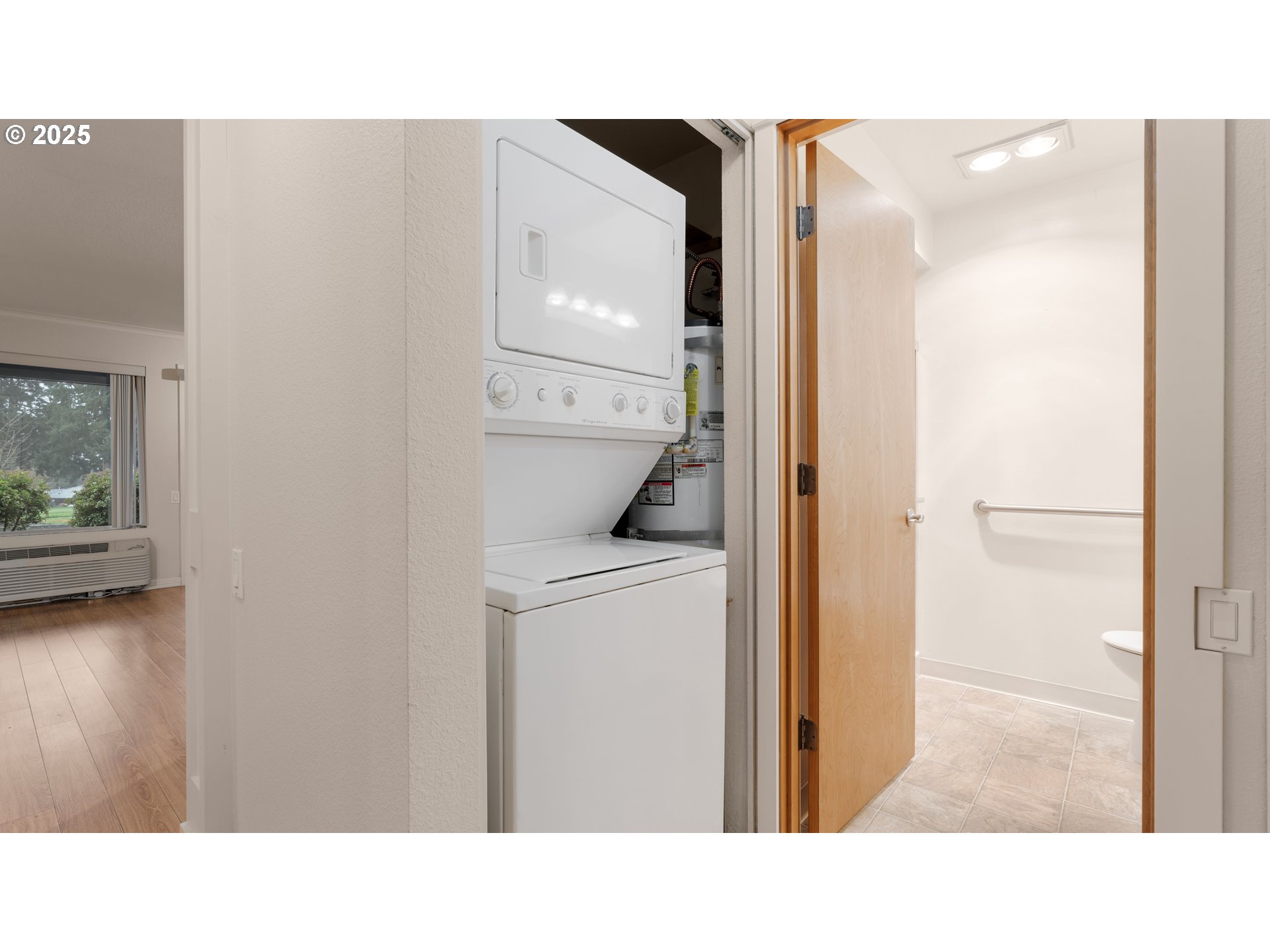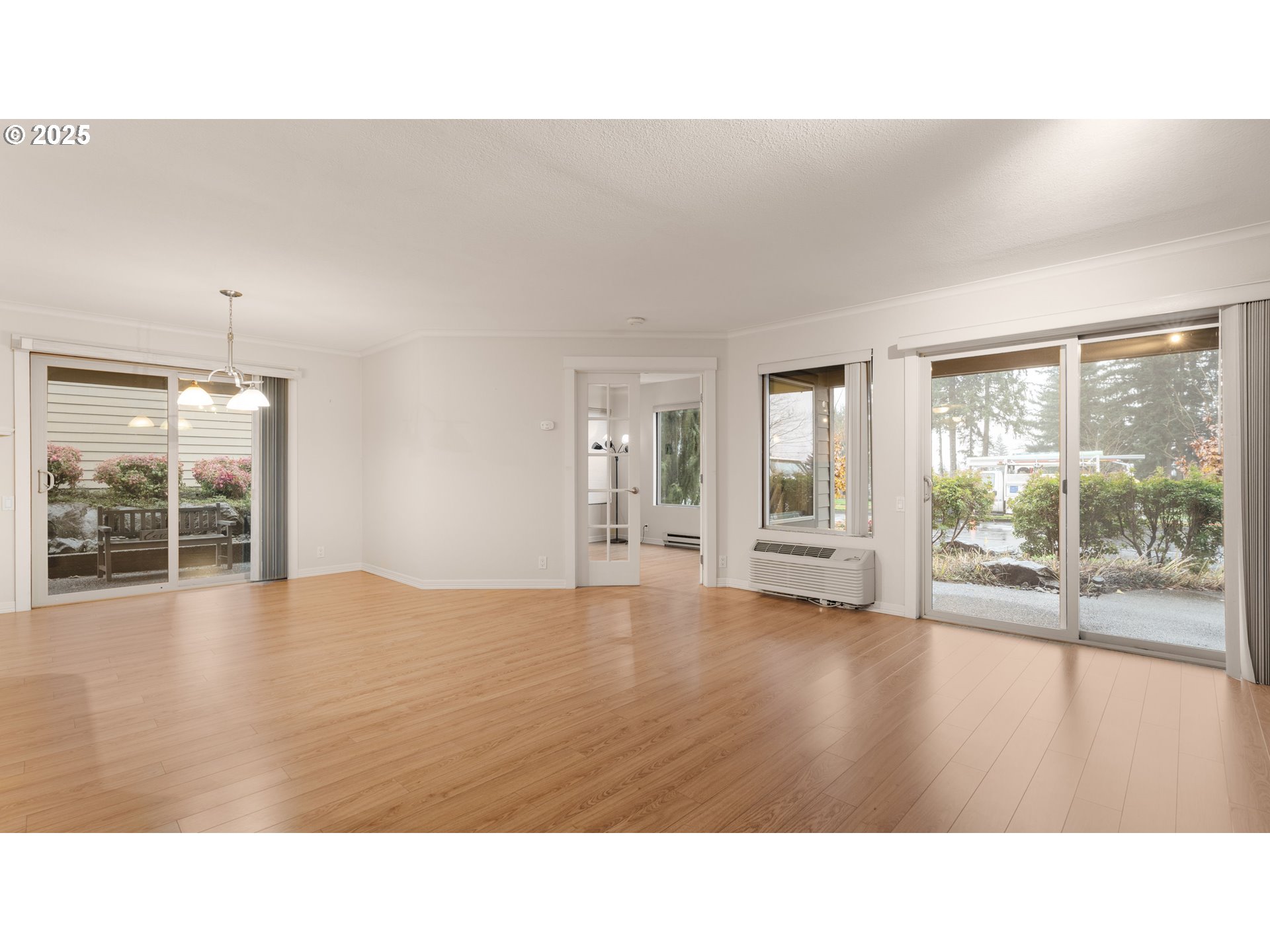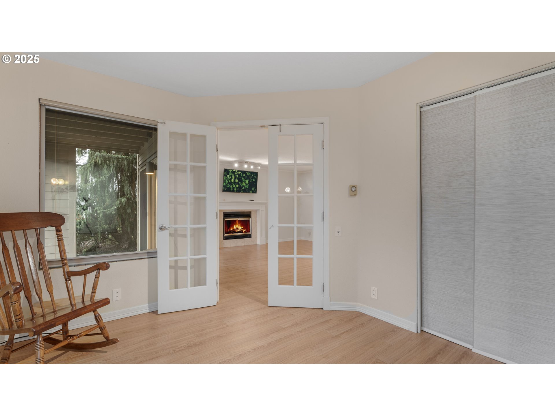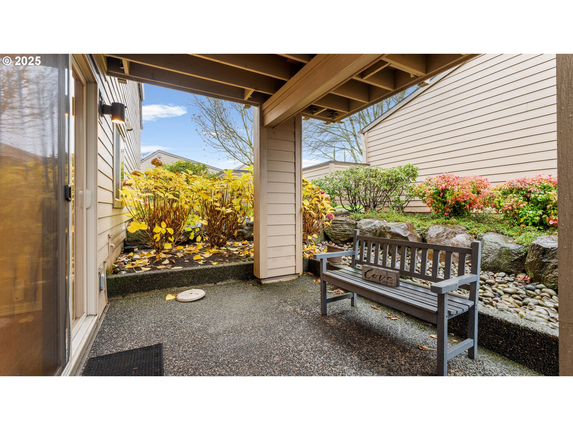 Enjoy a beautiful view of the 7th green from this updated ground-level unit, offering rare street access with no stairs. The kitchen features stainless steel appliances including the refrigerator, plus a tiled backsplash, pantry, and convenient eating bar. The open great room stands out with laminate oak flooring, a cozy gas fireplace, and a sleek wall-mounted flat-screen TV. Two private covered patios extend your living space outdoors. The spacious primary suite includes generous closet space and a private bathroom. The second bedroom, with French doors, could easily serve as a den or home office. A second full bathroom offers a walk-in shower for added convenience. Additional highlights include an in-unit laundry area with washer and dryer, and an extra-deep detached one-car garage. This condo is situated in a vibrant 55+ planned community, offering an array of upscale amenities to elevate your lifestyle. Residents enjoy access to a golf course, a spacious clubhouse, a sauna, a swimming pool, billiards, ping-pong tables, an arts and crafts studio, a ballroom, a library, meeting rooms, and an event center. Conveniently located near grocery stores, restaurants, shopping, and 15 mins to PDX International airport. Experience the best of active adult living in this meticulously maintained community. Schedule your private tour today!