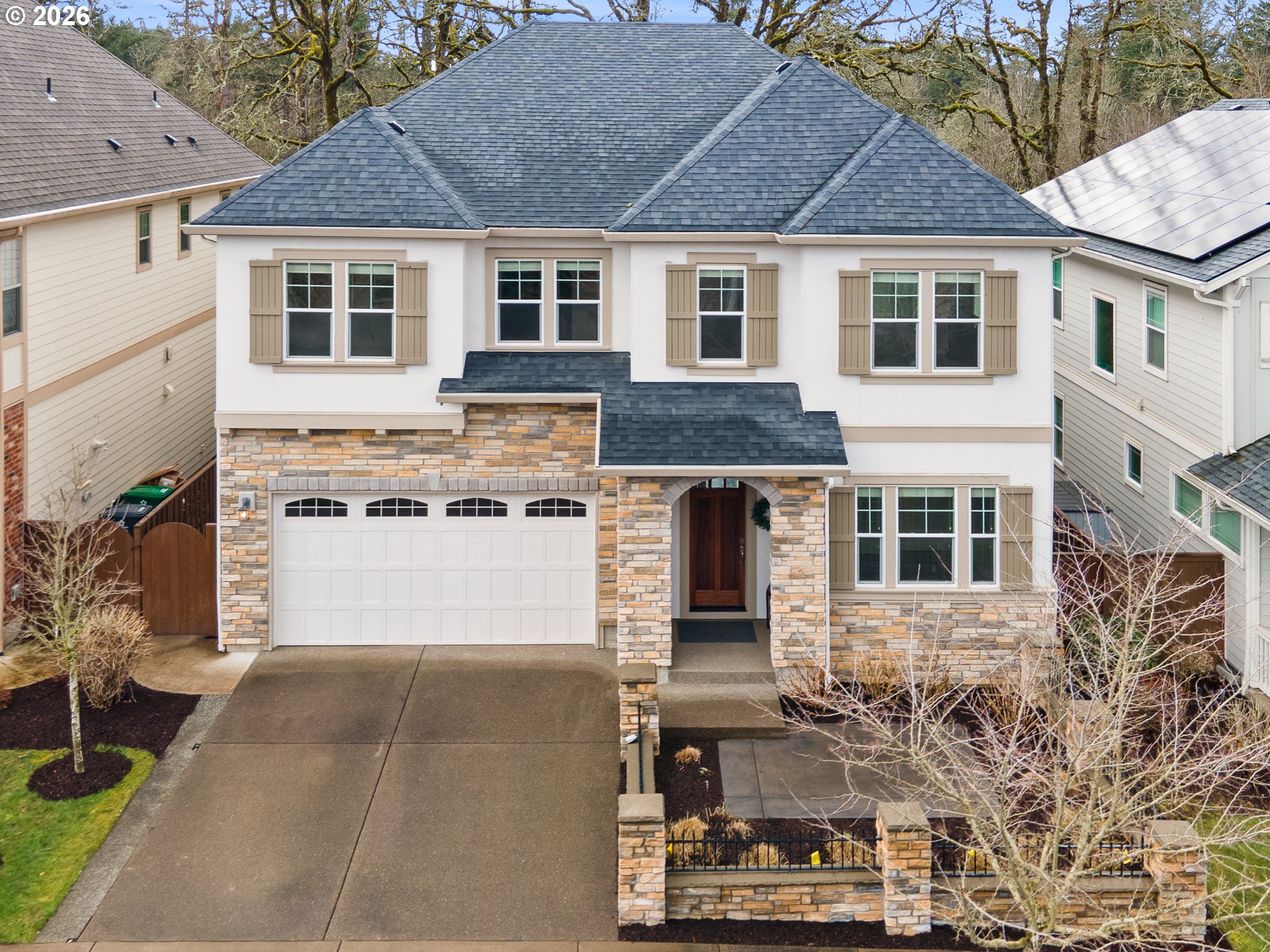 Welcome to the quiet, serene, southern end of Villebois. This beautiful home is nestled against the Graham Oaks Nature Park and has access to many trails, parks, summer-time farmers market and various pickleball courts. Large deck with built in seating around a firepit, overlooks forested area and creates an ideal setting for backyard entertaining. On the main level you'll find a formal dining space, large kitchen with oversized quartz island for entertaining, dedicated office space and half bath. Upstairs, there is a primary suite offering sweeping views of the forest behind the home, dual walk-in closets and large soaking tub. There are an additional three bedrooms, full bath, and bonus room upstairs. The upstairs is newly carpeted and hosts an upstairs laundry room with closet. Ample storage is available throughout the home. This gorgeous home is a must see!!