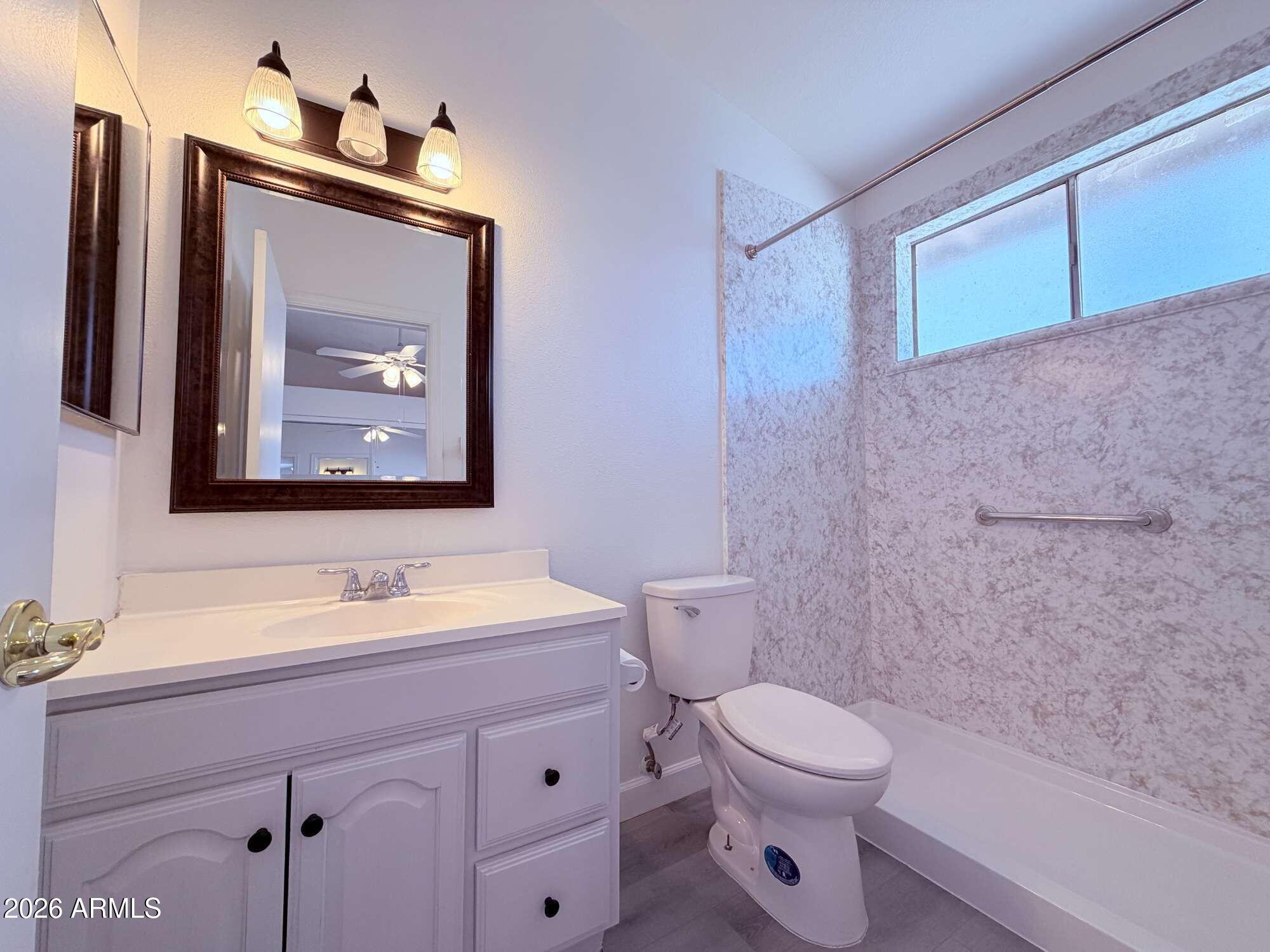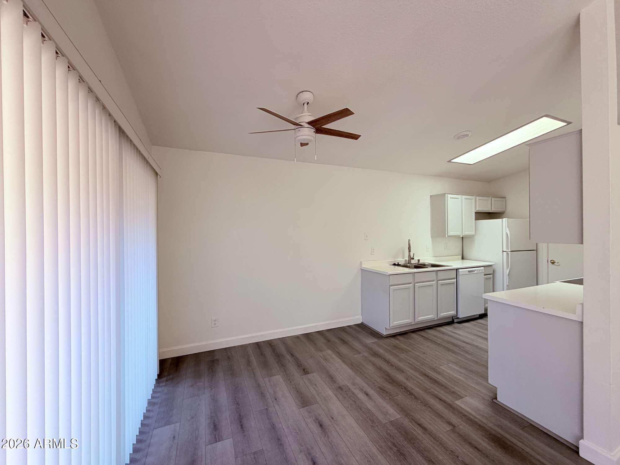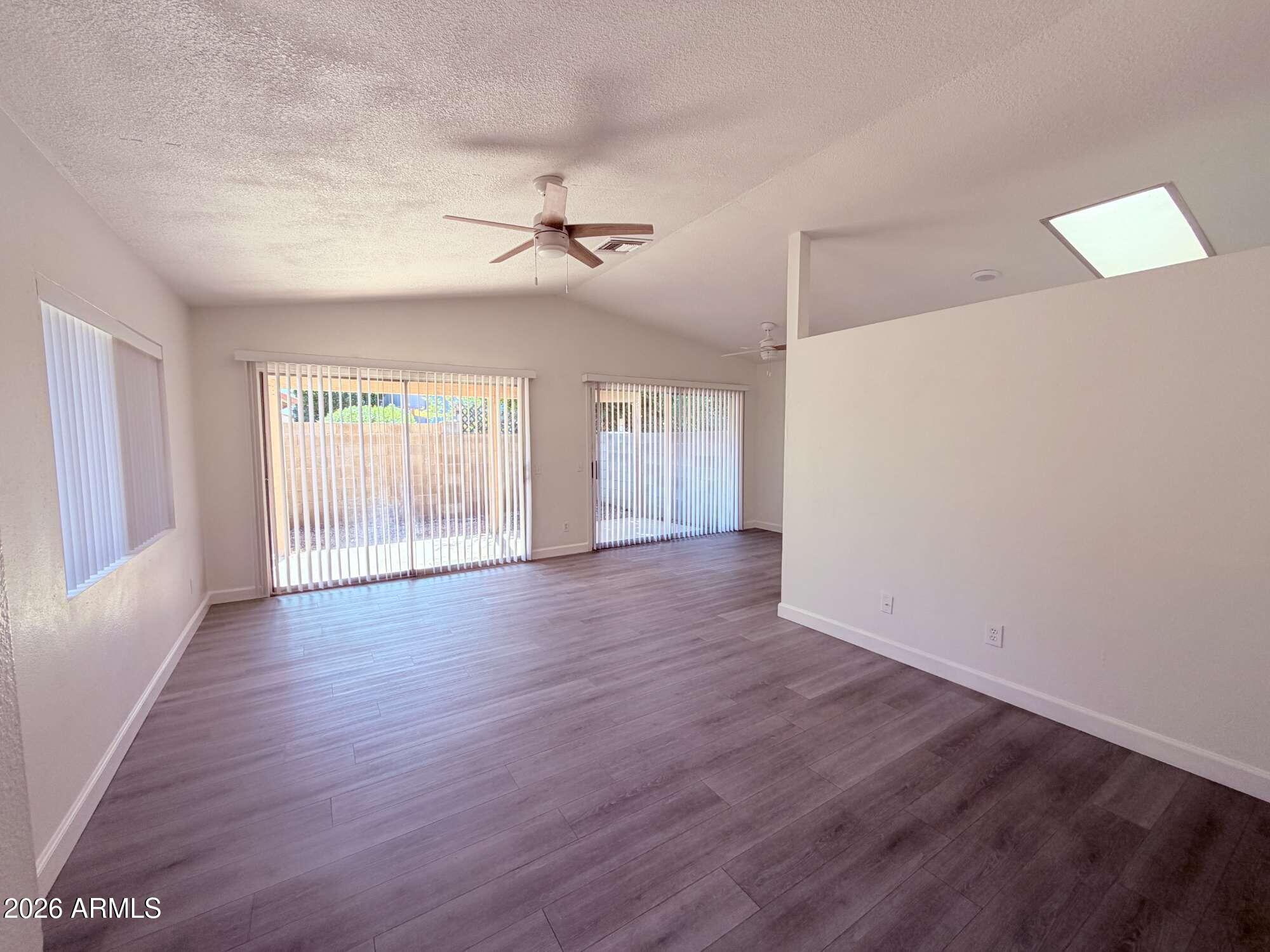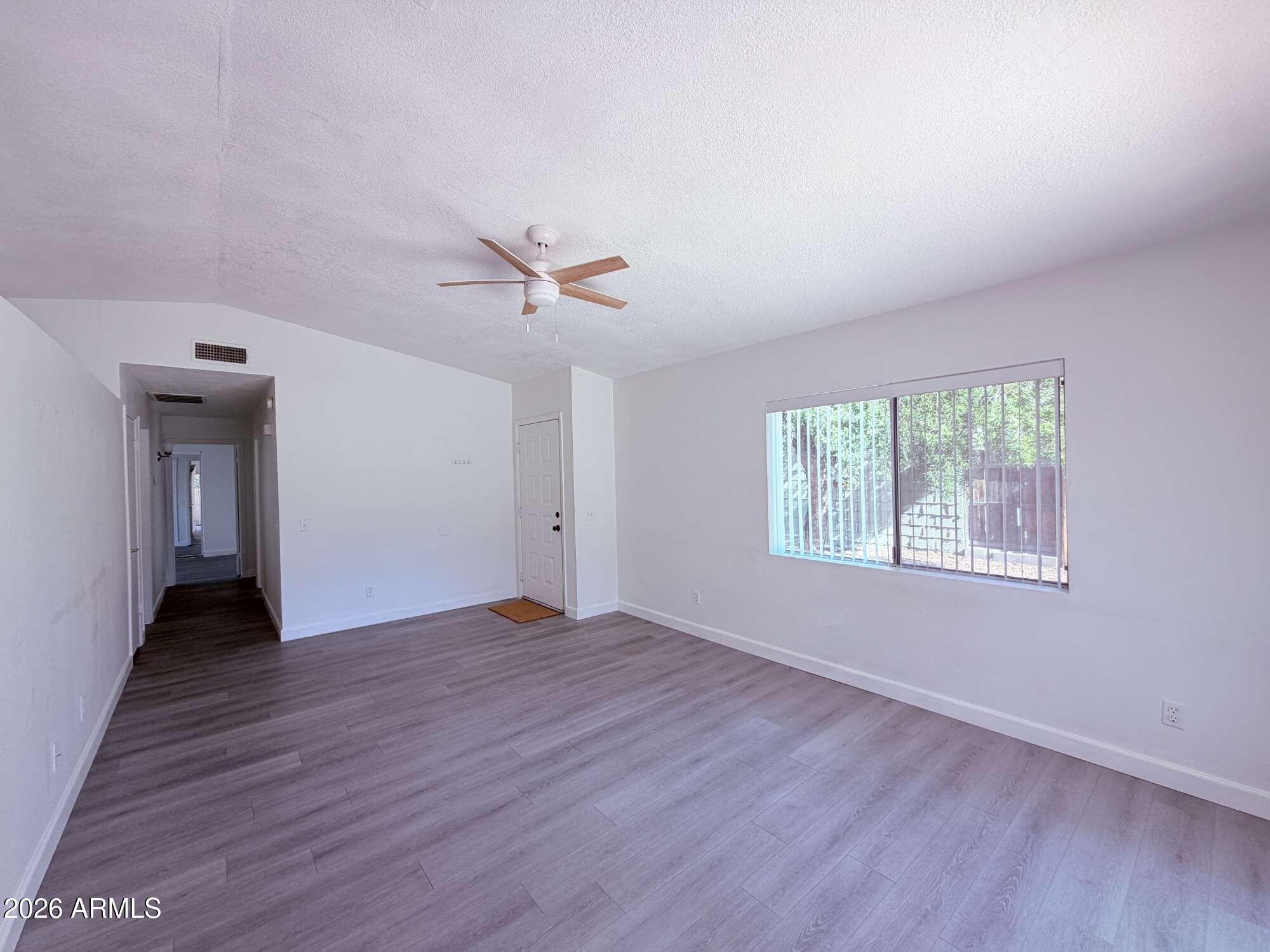Single story 3 bedroom, 2 bathroom home offering 985 sq ft in Chandler. Fresh updates include brand new bathrooms with new showers, toilets, and vanities, plus new flooring throughout with no carpet. The kitchen connects efficiently to the living area and includes a refrigerator. Washer and dryer are located in the garage and are included as is. A two car garage provides parking and storage. The front entry features a security gate, and the yard is designed for low maintenance. Conveniently located near shopping, dining, parks, and freeway access within approximately three miles.