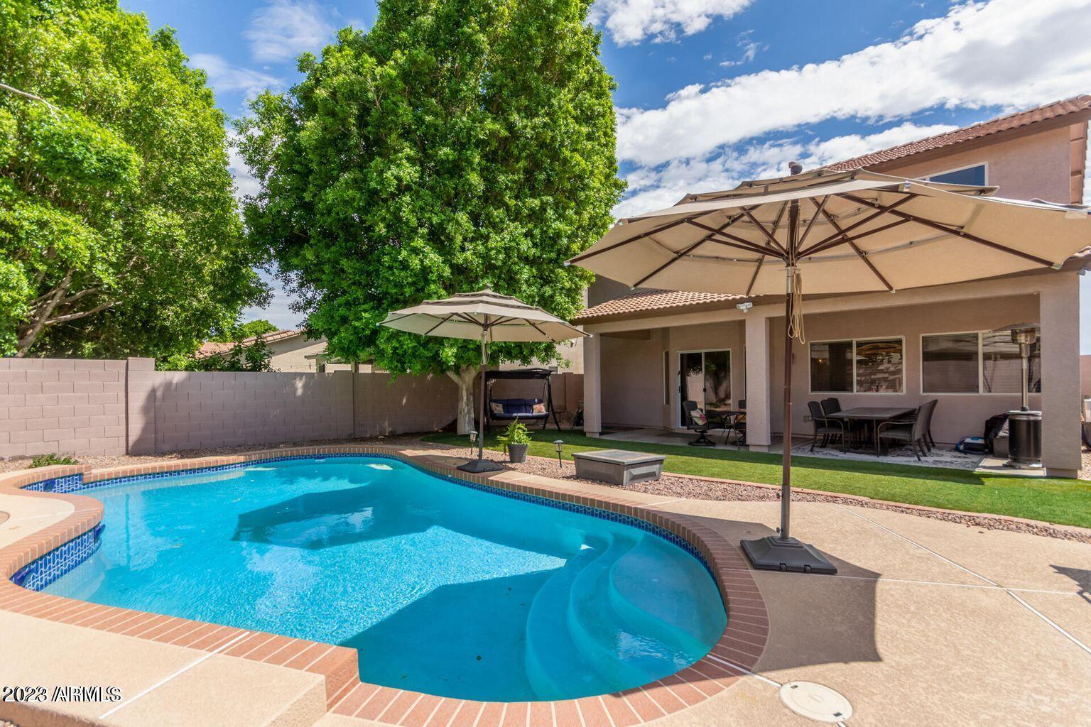 You're gonna love this rental! Amazing Goodyear location with access to all the amenities. Sparkling pool accented by lush turf is a beautiful view from your extended back patio. Inside you'll discover a welcoming and efficient interior filled with natural light, a freshened neutral palette, tile where you need it and carpet in all the right places. The eat-in kitchen is fully equipped with SS appliances, upgraded countertops, plenty of cabinet space, additional pantry storage, recessed & pendant lighting, a breakfast bar, & tile backsplash. Posh double door entry to the main bedroom to your private retreat. Community offers hiking, biking, gym, pools, trails, sport courts, parks, schools and so much more!