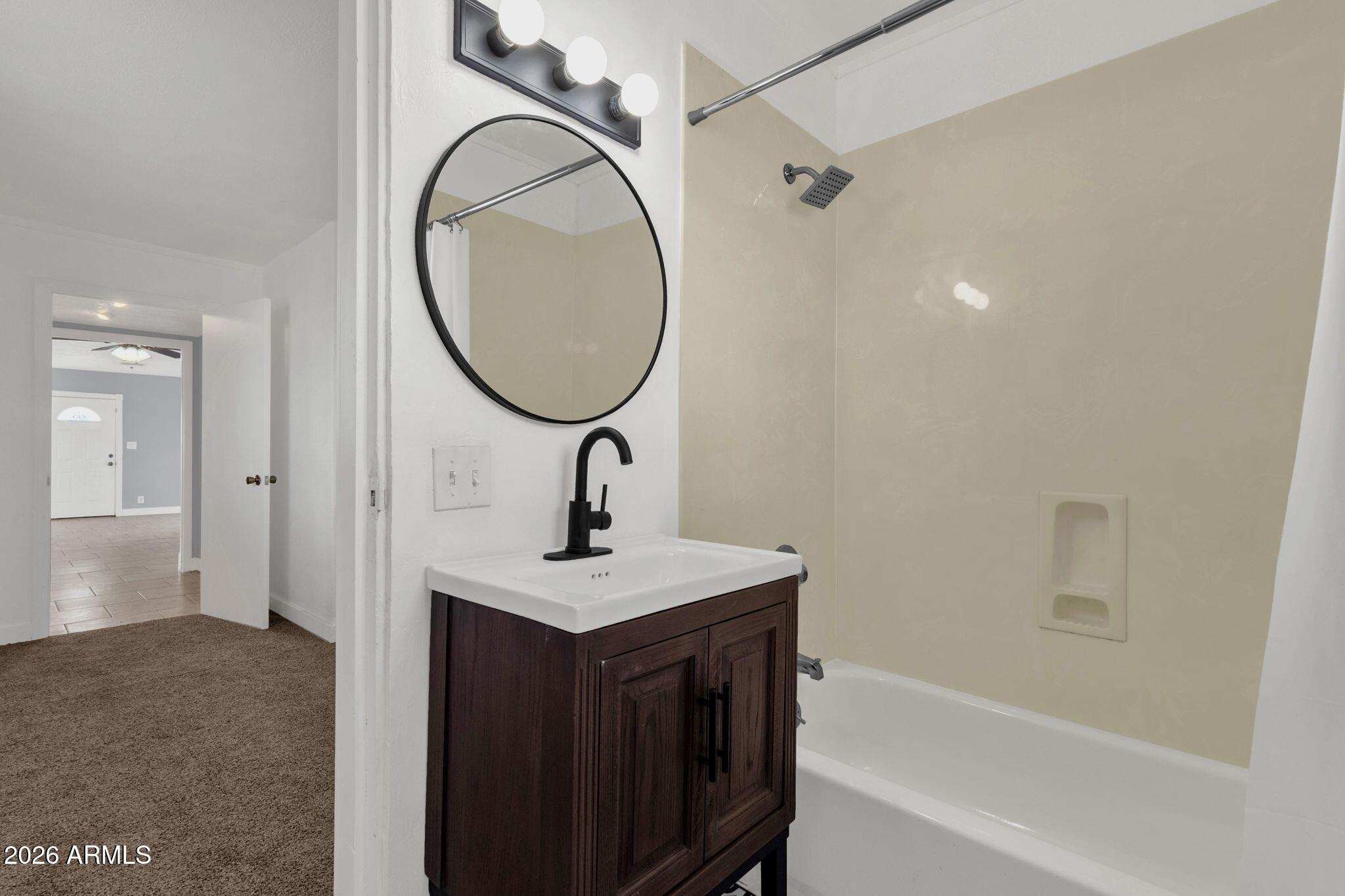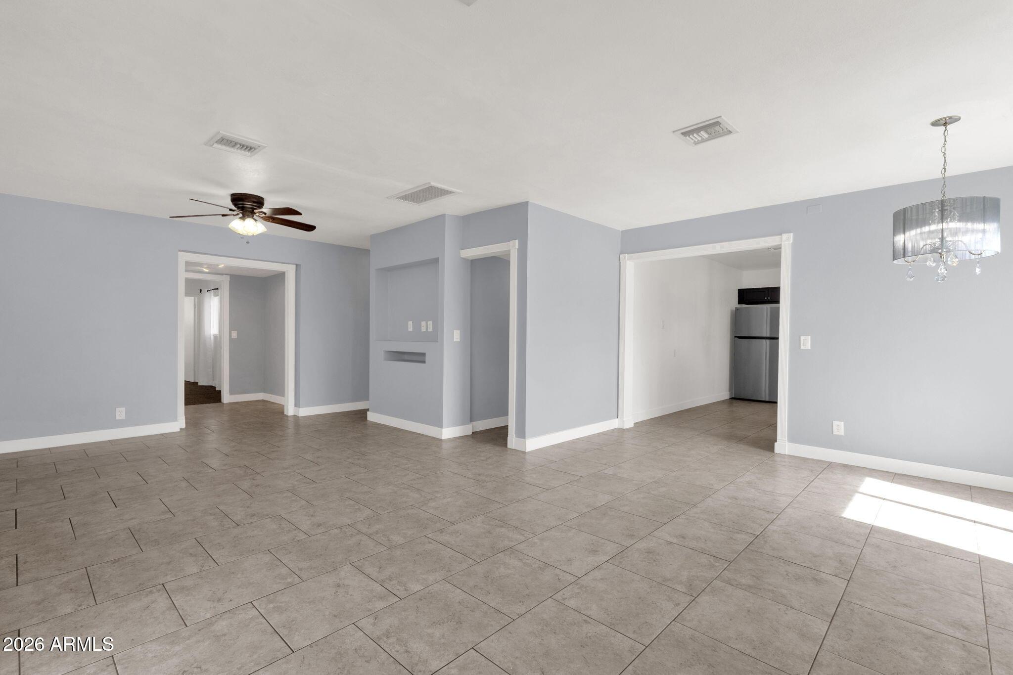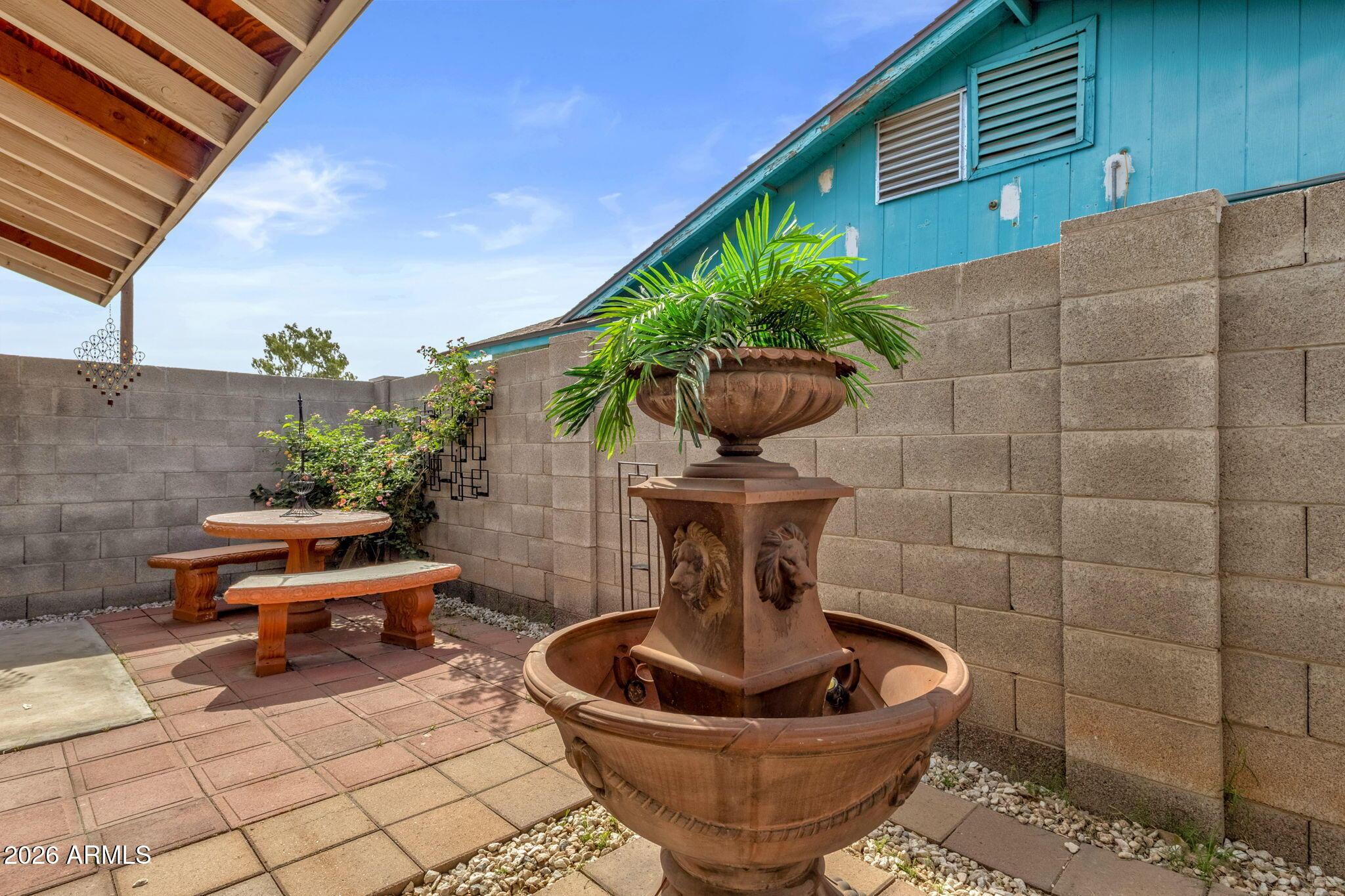 Spacious remodeled 4-bedroom, 2-bath home with private-entry bedroom, RV gate, and oversized lot in Phoenix. Fresh interior and exterior paint provide a clean, updated look throughout. The bright open living area features large-format tile flooring, neutral tones, ceiling fans, and abundant natural light. French doors open to a private side patio courtyard with paver flooring and decorative fountain feature, creating an additional outdoor seating and entertaining space. The updated kitchen offers granite-style countertops, dark shaker cabinetry, stainless steel refrigerator, gas range with vent hood, double-basin sink with window views, generous prep space, and ample storage. A dedicated dining area connects seamlessly to the kitchen and living space for flexible everyday use. The primary bedroom includes plush carpeting, ceiling fan, and mirrored closet doors. Secondary bedrooms feature updated flooring, ceiling fans, and natural light. One bedroom includes private exterior access and its own patio entry, providing flexibility for guests, workspace, or multi-use living.