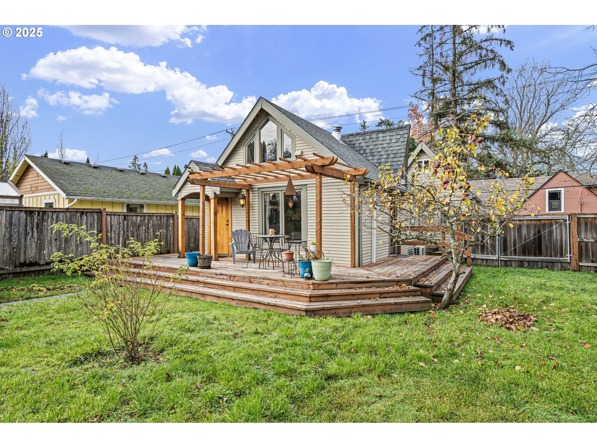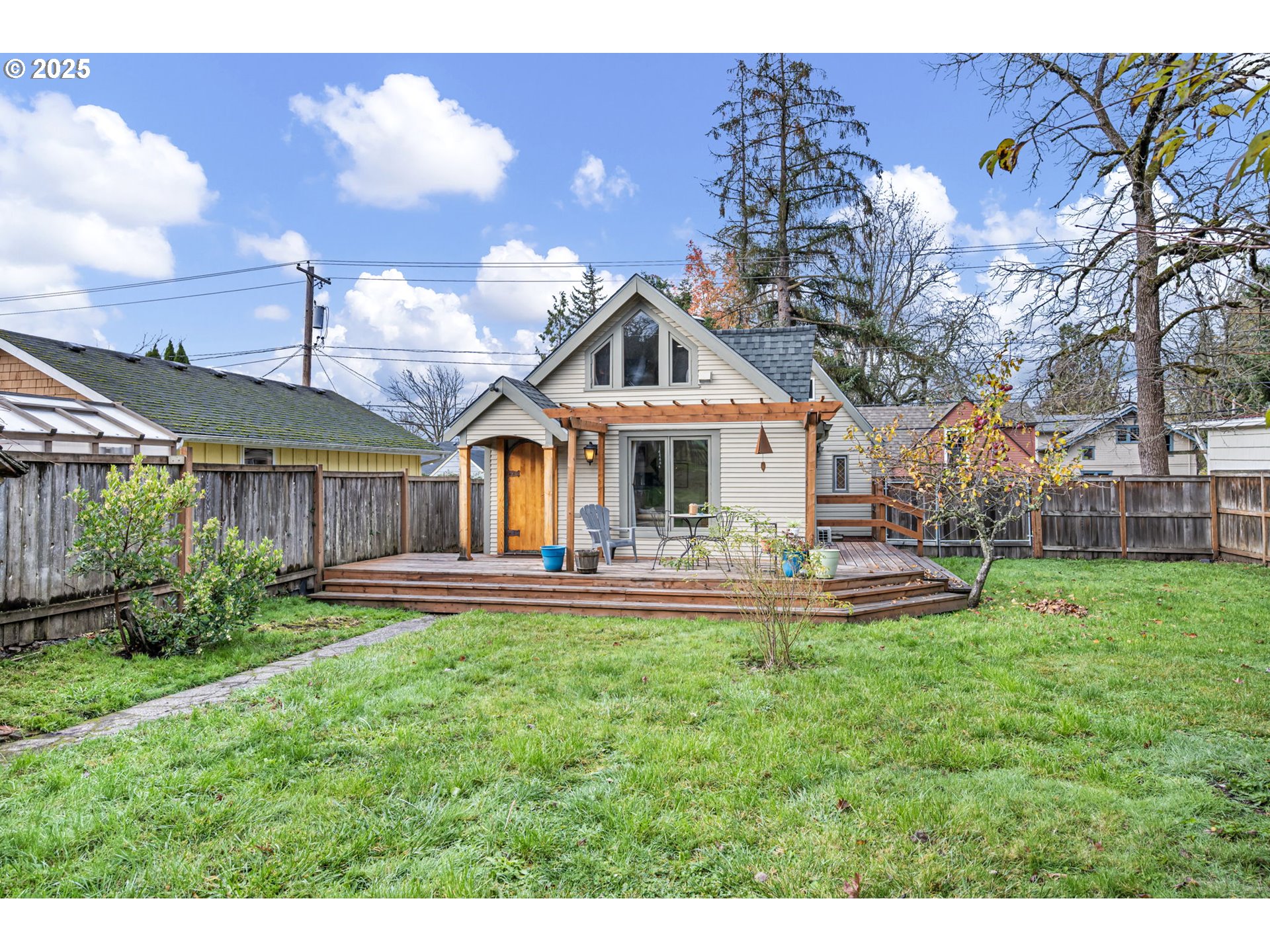 Absolutely charming University-area home with a separate studio loft apartment! This beautifully remodeled property has been thoughtfully updated throughout while preserving all the character and warmth of its era. As you enter through the front gate and follow the concrete path, you’ll be welcomed by a spacious yard with mature apple trees and a newer wraparound deck that enhances outdoor living on two sides of the home. Step inside through the distinctive round-top door and you’ll immediately notice the original fir floors—refinished and glowing with history. The main living area is bright and spacious, designed to make the most of every square foot with multiple entry points. The kitchen is a true highlight, featuring imported terracotta tile flooring, brand-new hickory cabinets, and stainless steel appliances. The updated bathroom offers tile flooring, a modern shower/tub combo, and a stylish vanity. Follow the spiral staircase to a versatile loft area—perfect for an office or cozy reading nook—and the upstairs bedroom, filled with natural light from double-pane windows. A stunning stained-glass window above the staircase adds a unique artistic focal point. The second unit is a fully independent studio loft apartment that has operated successfully as an Airbnb since 2017, generating approximately $70,000 over the past three years. It includes its own kitchenette, bathroom, living area, and bedroom, with new photos coming 12/17. With dedicated parking and a private entrance off Orchard Alley, this space can remain completely separate from the main home—ideal for rental income, guests, or multigenerational living. Both units have individual meters and have been thoughtfully updated and well maintained. This is a rare opportunity to own a charming home near the U of O with built-in income potential on your terms. Low taxes. A must-see!