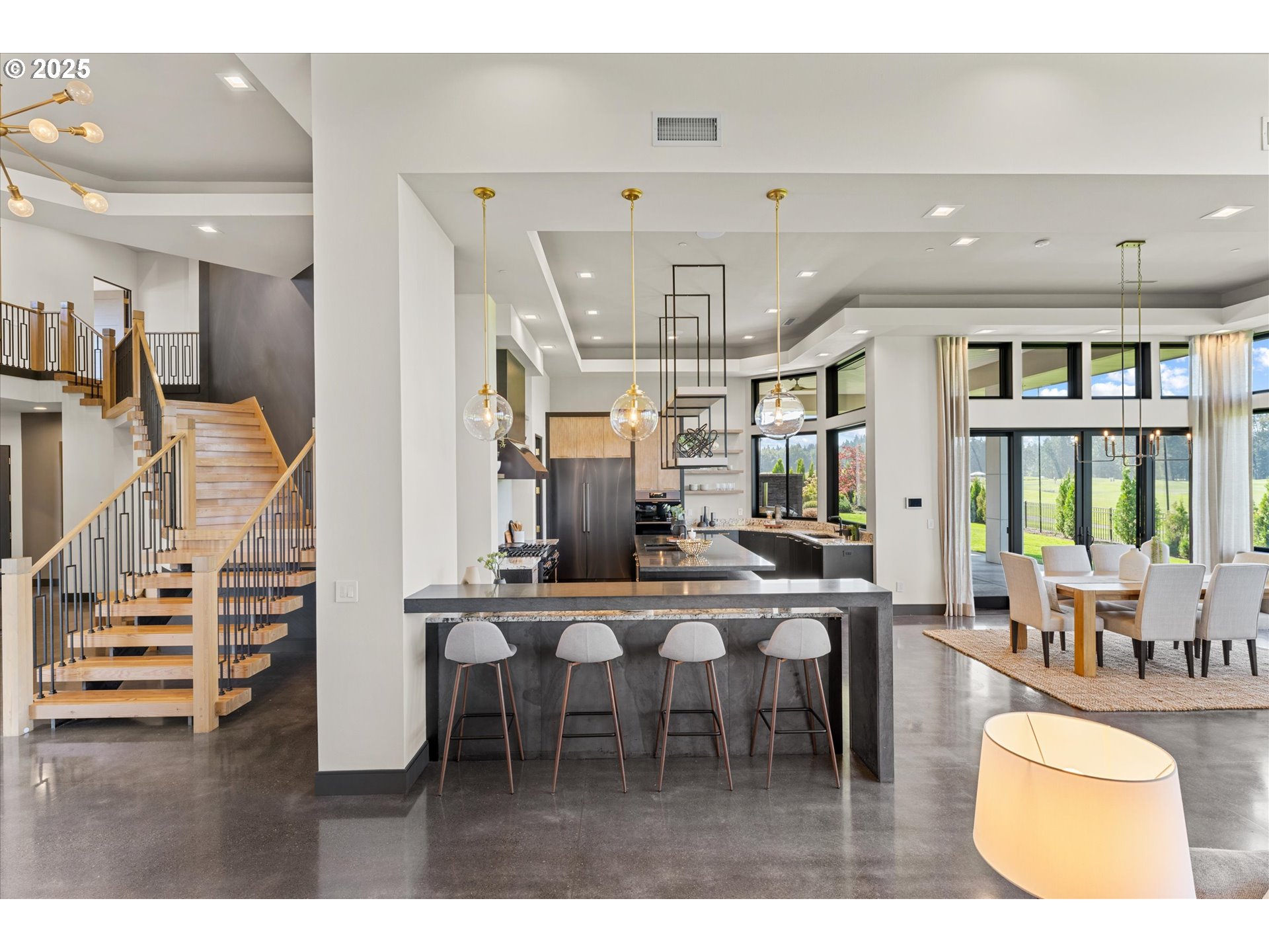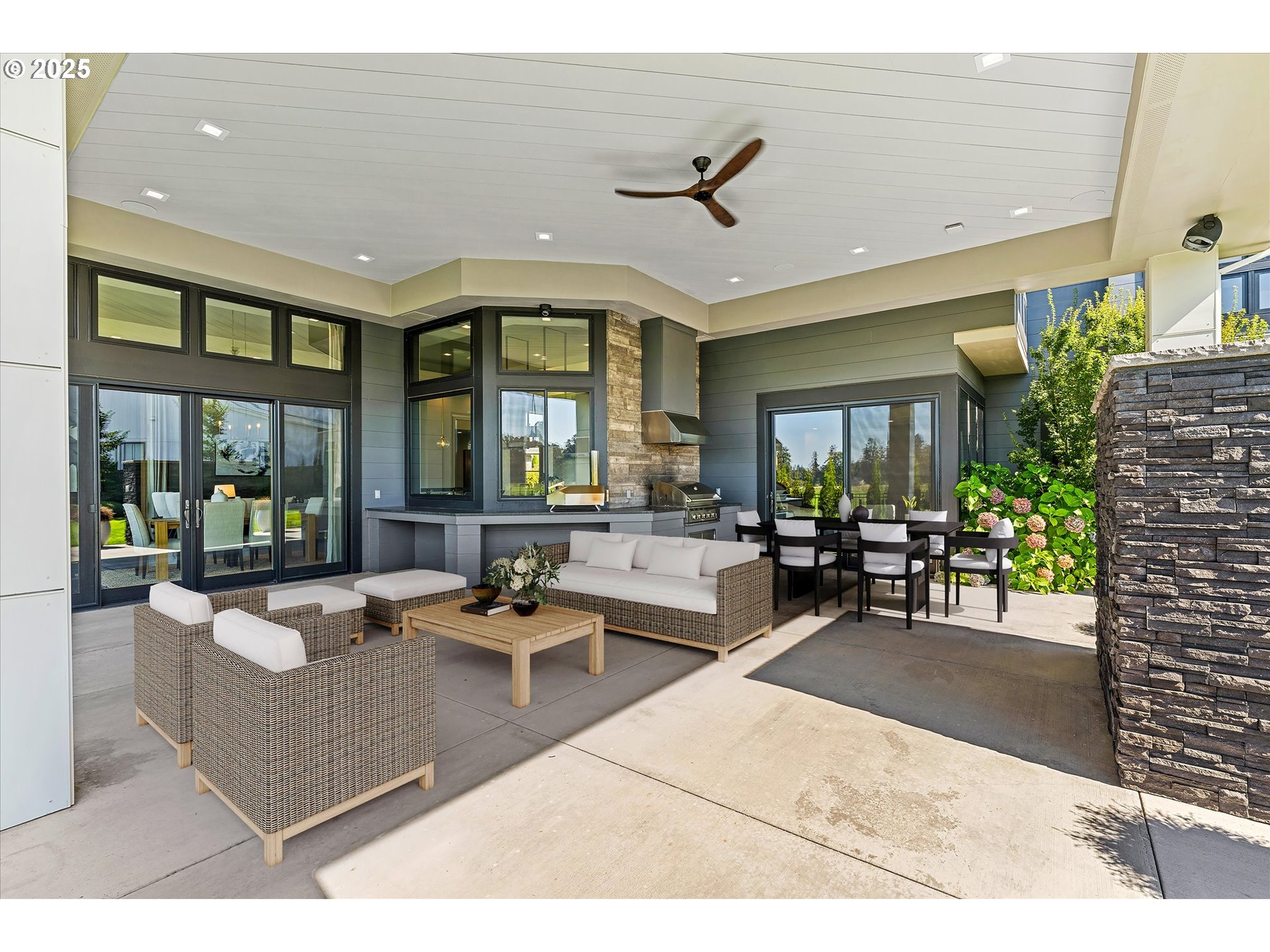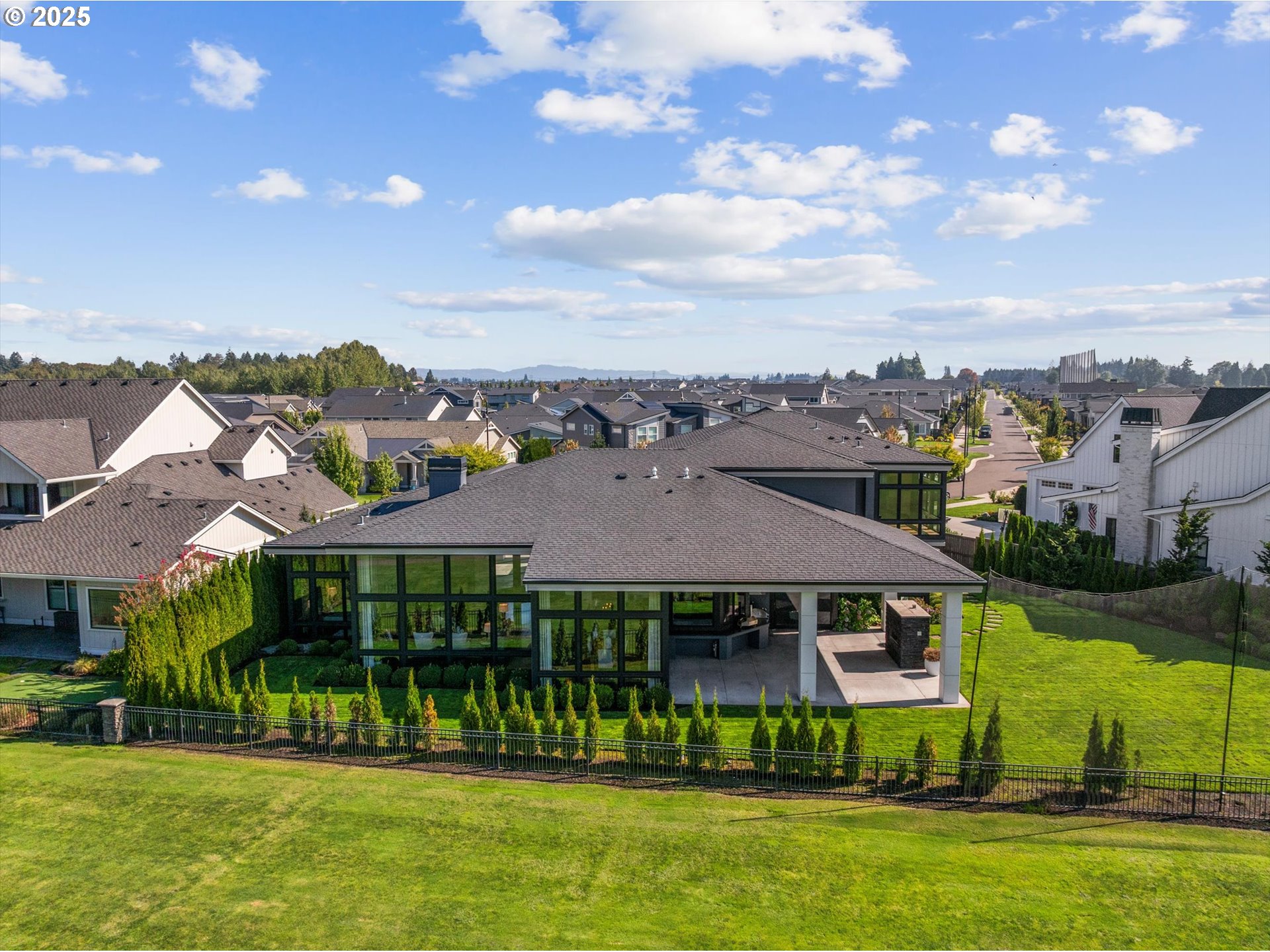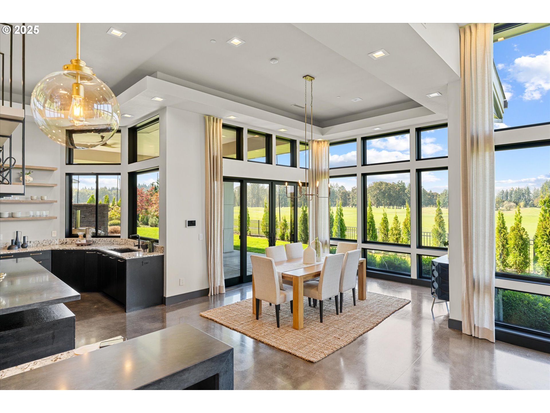A custom Street of Dreams estate on The Reserve Golf Course, 5652 SE McInnis Street showcases modern design and exceptional craftsmanship throughout. Inspired by Frank Lloyd Wright, the home blends sleek architectural lines with natural materials for a timeless and inviting feel.The main floor features Lochnivar heated concrete floors and floor-to-ceiling windows with remote shades and draperies that frame stunning golf course views year-round. The open kitchen, dining, and living areas flow seamlessly into the covered outdoor patio with a gas fireplace and built-in DCS grill with range hood, perfect for both casual and formal gatherings. Highlights include vaulted ceilings, a frameless corner fireplace, and natural stone counters at the kitchen island and bar. The main level also offers a guest suite, office with built-ins, half bath, gym with A/C and French doors to the lawn, and the primary suite with French doors to the backyard, a soaking tub with views, a walk-in shower, and an extraordinary walk-in closet.Upstairs, a floating staircase leads to a loft with a custom reading nook, dual desk spaces, and built-ins, plus two additional bedroom suites with walk-in closets. The bonus room, complete with wet bar, full bath, and custom shelving, is ideal for a media room, additional bedroom, or hangout space.The front courtyard is framed by dramatic columns and serene water features, while the level backyard backs to the 12th fairway of The Reserve Vineyard & Golf Club. Just blocks away, enjoy neighborhood pool and clubhouse amenities. Conveniently located about 10 minutes from Nike and Intel. [Home Energy Score = 1. HES Report at https://rpt.greenbuildingregistry.com/hes/OR10212516]