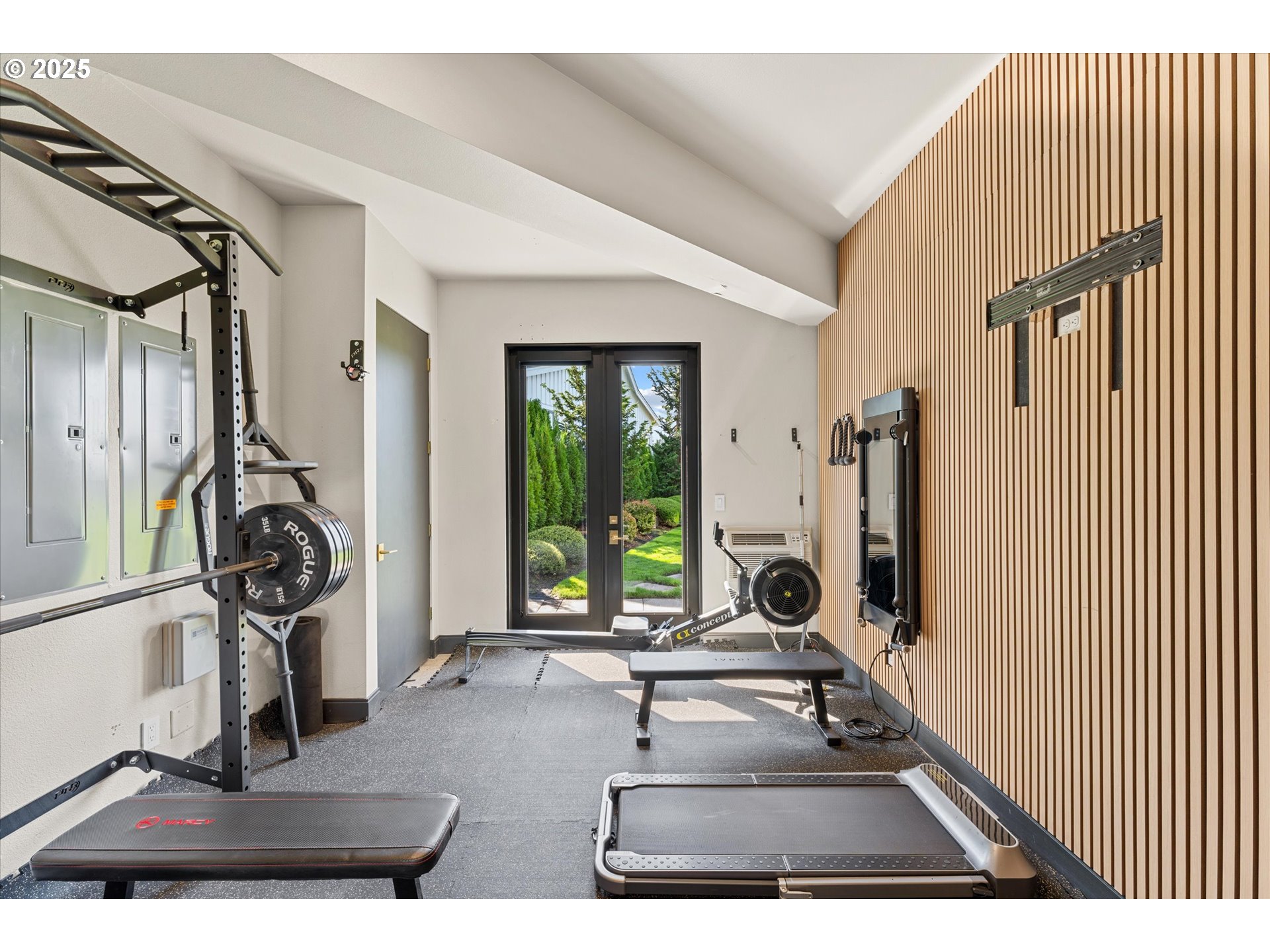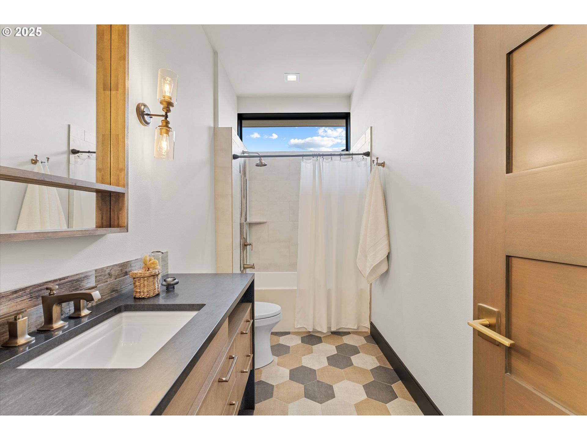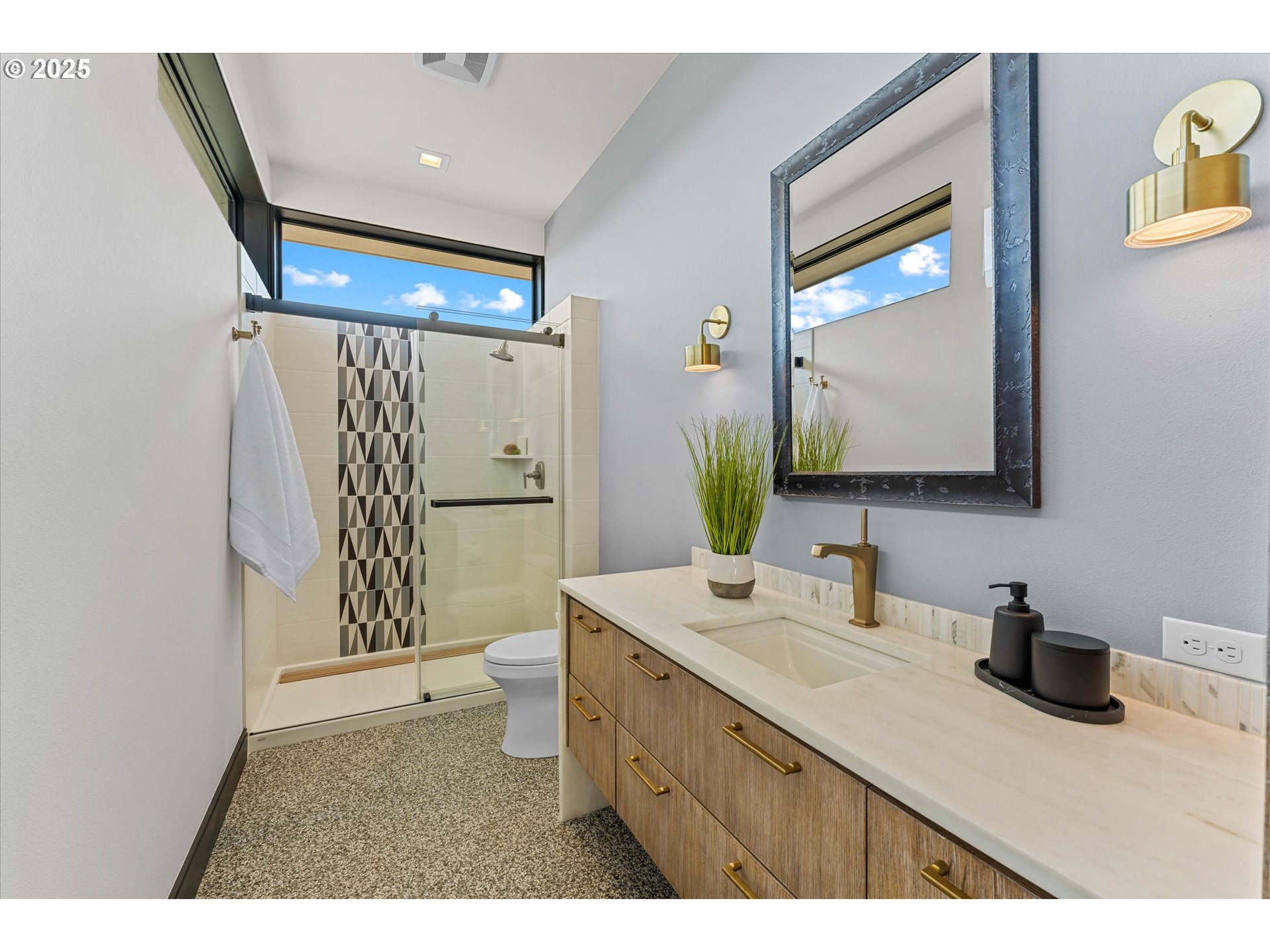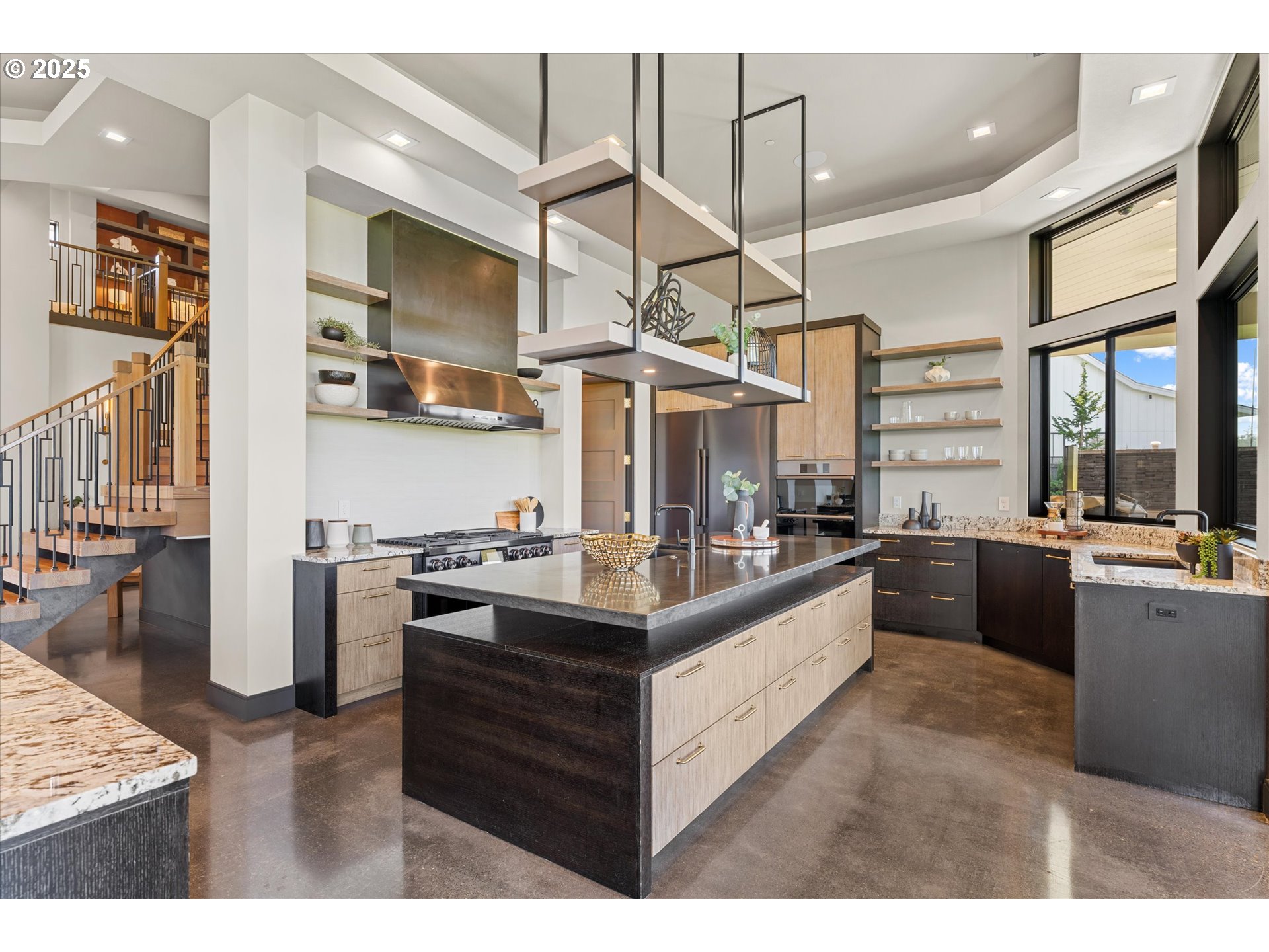 A custom Street of Dreams estate on The Reserve Golf Course, 5652 SE McInnis Street showcases modern design and exceptional craftsmanship throughout. Inspired by Frank Lloyd Wright, the home blends sleek architectural lines with natural materials for a timeless and inviting feel.The main floor features Lochnivar heated concrete floors and floor-to-ceiling windows with remote shades and draperies that frame stunning golf course views year-round. The open kitchen, dining, and living areas flow seamlessly into the covered outdoor patio with a gas fireplace and built-in DCS grill with range hood, perfect for both casual and formal gatherings. Highlights include vaulted ceilings, a frameless corner fireplace, and natural stone counters at the kitchen island and bar. The main level also offers a guest suite, office with built-ins, half bath, gym with A/C and French doors to the lawn, and the primary suite with French doors to the backyard, a soaking tub with views, a walk-in shower, and an extraordinary walk-in closet.Upstairs, a floating staircase leads to a loft with a custom reading nook, dual desk spaces, and built-ins, plus two additional bedroom suites with walk-in closets. The bonus room, complete with wet bar, full bath, and custom shelving, is ideal for a media room, additional bedroom, or hangout space.The front courtyard is framed by dramatic columns and serene water features, while the level backyard backs to the 12th fairway of The Reserve Vineyard & Golf Club. Just blocks away, enjoy neighborhood pool and clubhouse amenities. Conveniently located about 10 minutes from Nike and Intel. [Home Energy Score = 1. HES Report at https://rpt.greenbuildingregistry.com/hes/OR10212516]