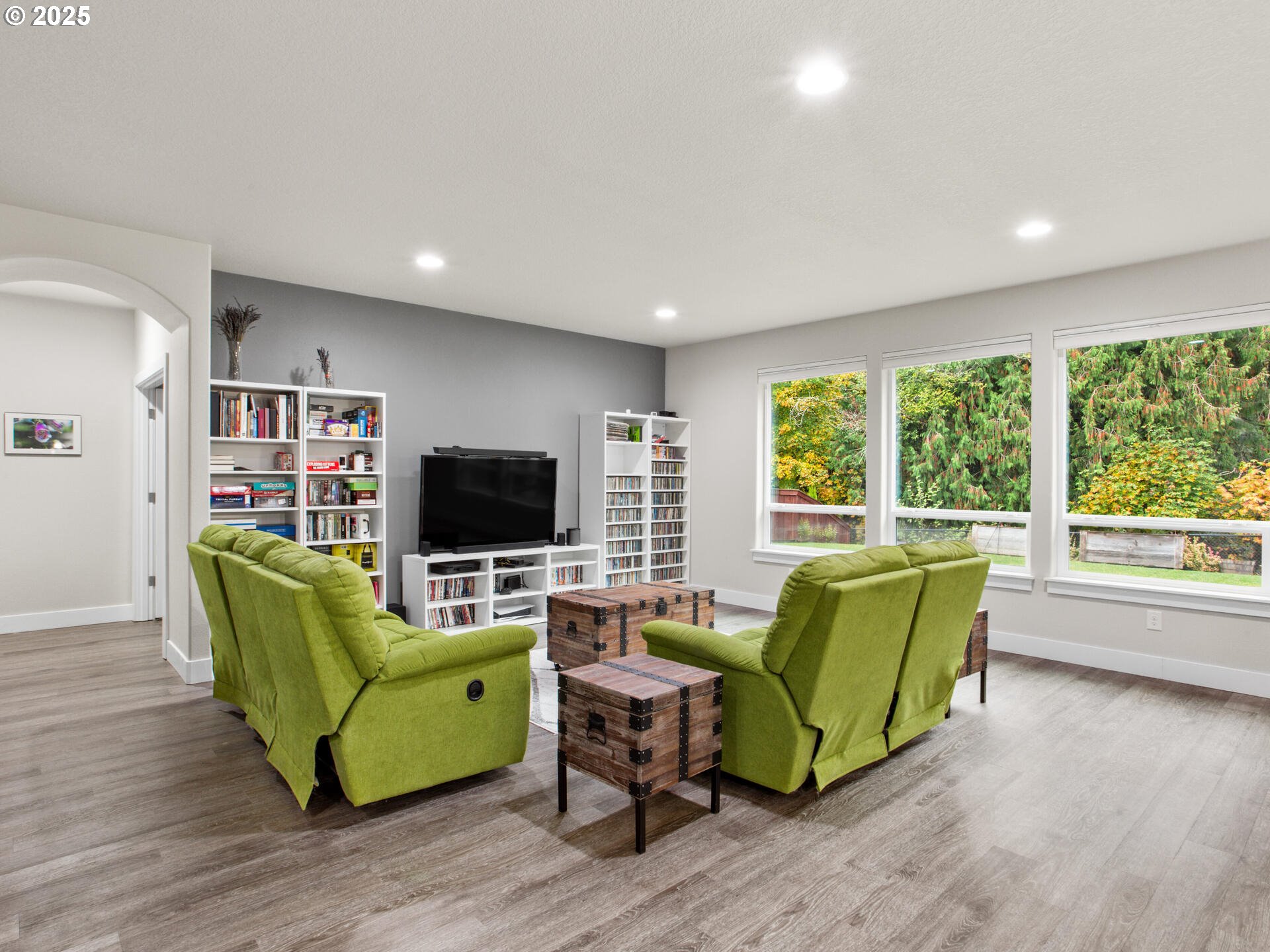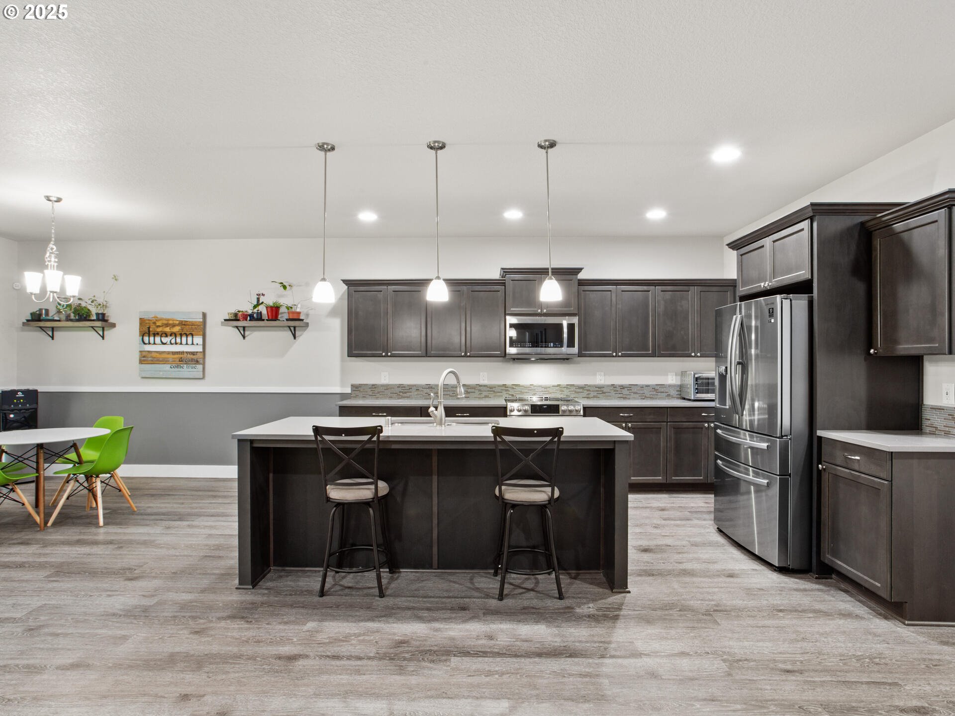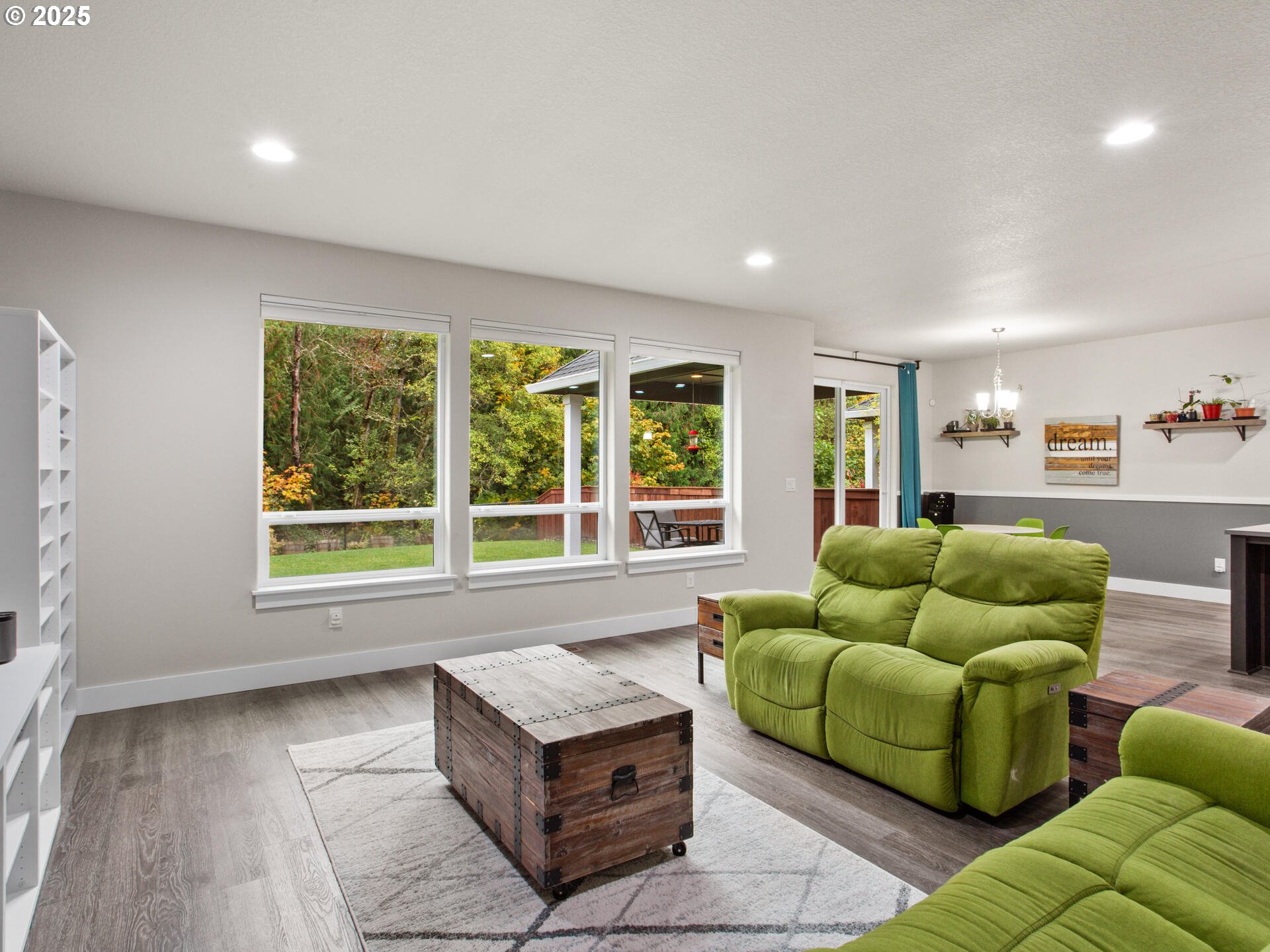Highly desirable Seven Wells Estates neighborhood. Perfectly situated on a level lot backing to greenspace. Multi-gen floorplan offers a private suite complete with kitchenette/living room combo, bedroom, full bath and separate entry. Kitchen features an expansive quartz slab island, 5-zone induction cooktop w/double ovens, lower cabinet pullouts & walk-in pantry. Upgraded LVP flooring throughout. Large windows accentuate scenic views as natural light pours into the home. Primary en-suite and laundry on main floor allows for single level living. Upper floor provides two additional bedrooms, full bathroom and family room. Oversized three car garage. Incredible outdoor space offers the entertainer's dream with a covered patio and flat, fully fenced backyard. Remarkable location grants easy access to trails, parks and Ridgefield amenities.