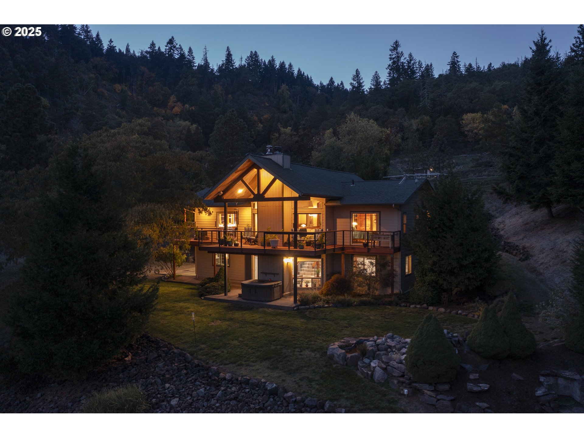 This property offers a truly beautiful and private setting with outstanding views. The home welcomes you with a grand entrance featuring a large rustic staircase. Both the scenic views and a river rock fireplace draw you into the living room, which boasts vaulted ceilings.The primary suite is a serene retreat, complete with sliding doors that open to a private deck, two walk-in closets, and an en-suite bathroom offering a separate tub, shower, and double vanity. The kitchen and dining room also feature sliding doors, providing seamless access to the main deck, perfect for entertaining or enjoying the outdoors.  Practical amenities include a double-car attached garage and an impressive 28 x 50 shop with a full bathroom and laundry hook-up. Additionally, there is a separate tool shed with a concrete floor and power. There are approximately 3-acres with an invisible fence system, ensuring pets can safely roam.  The property also features a fenced garden area with raised beds.