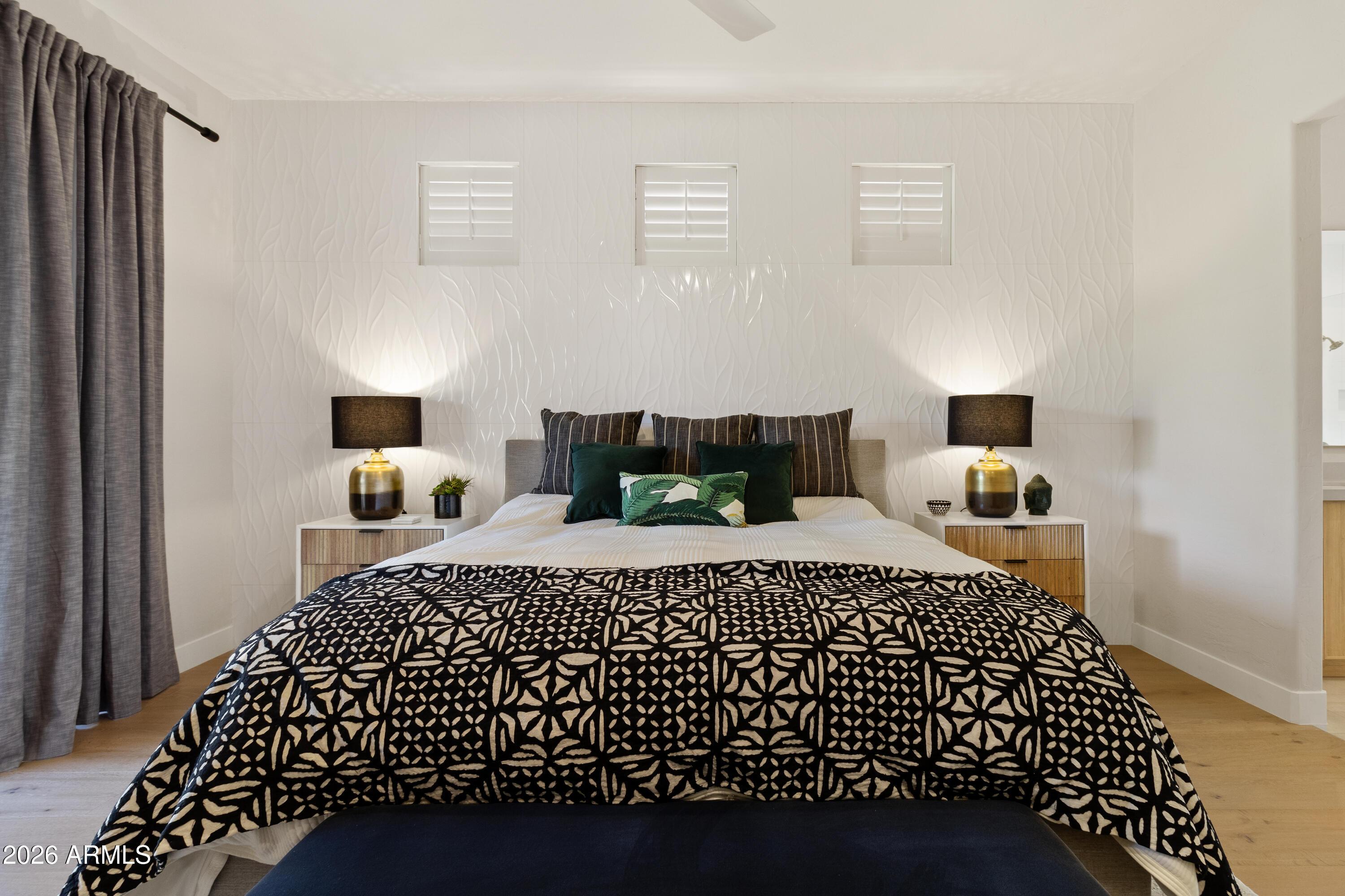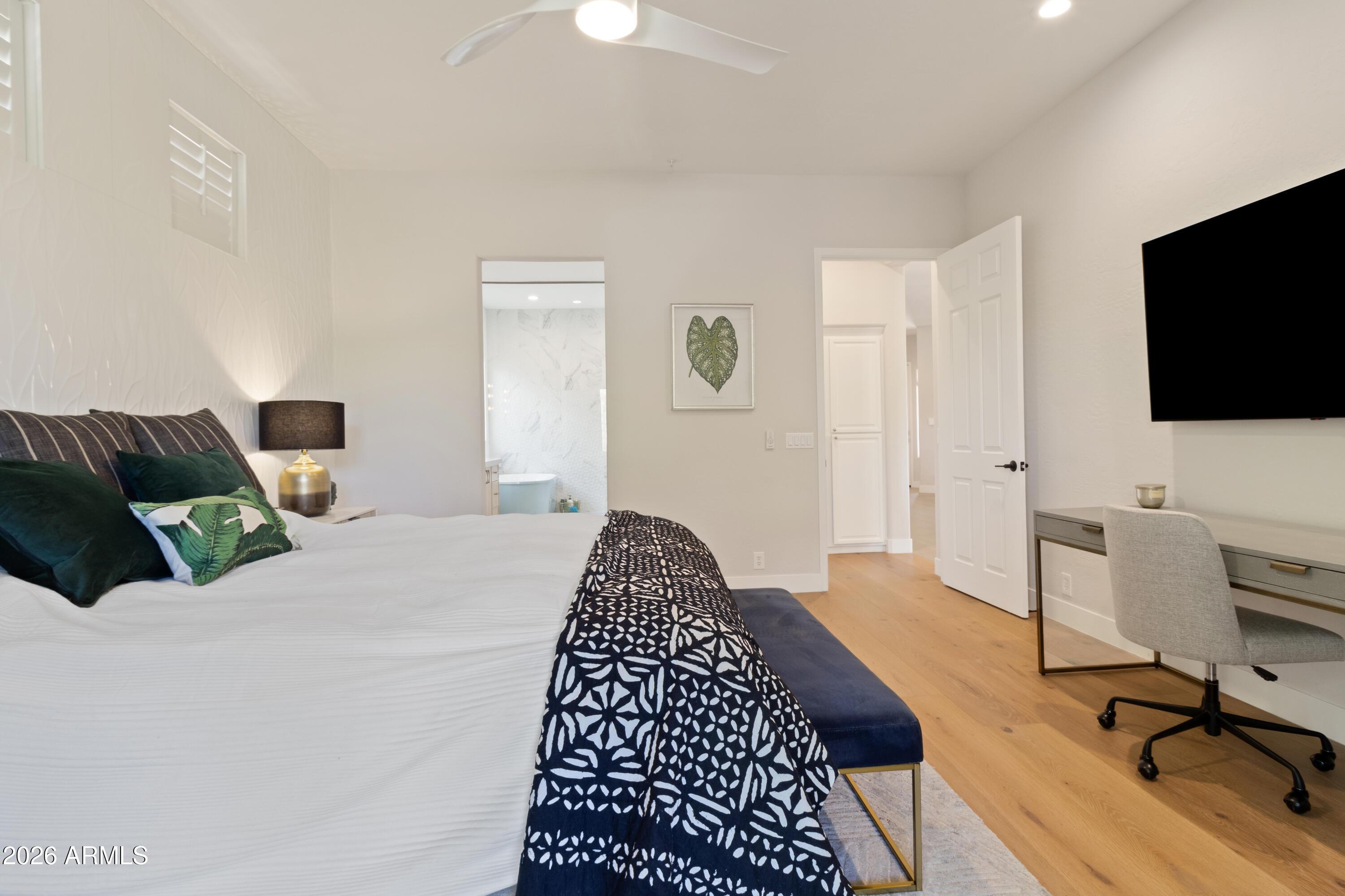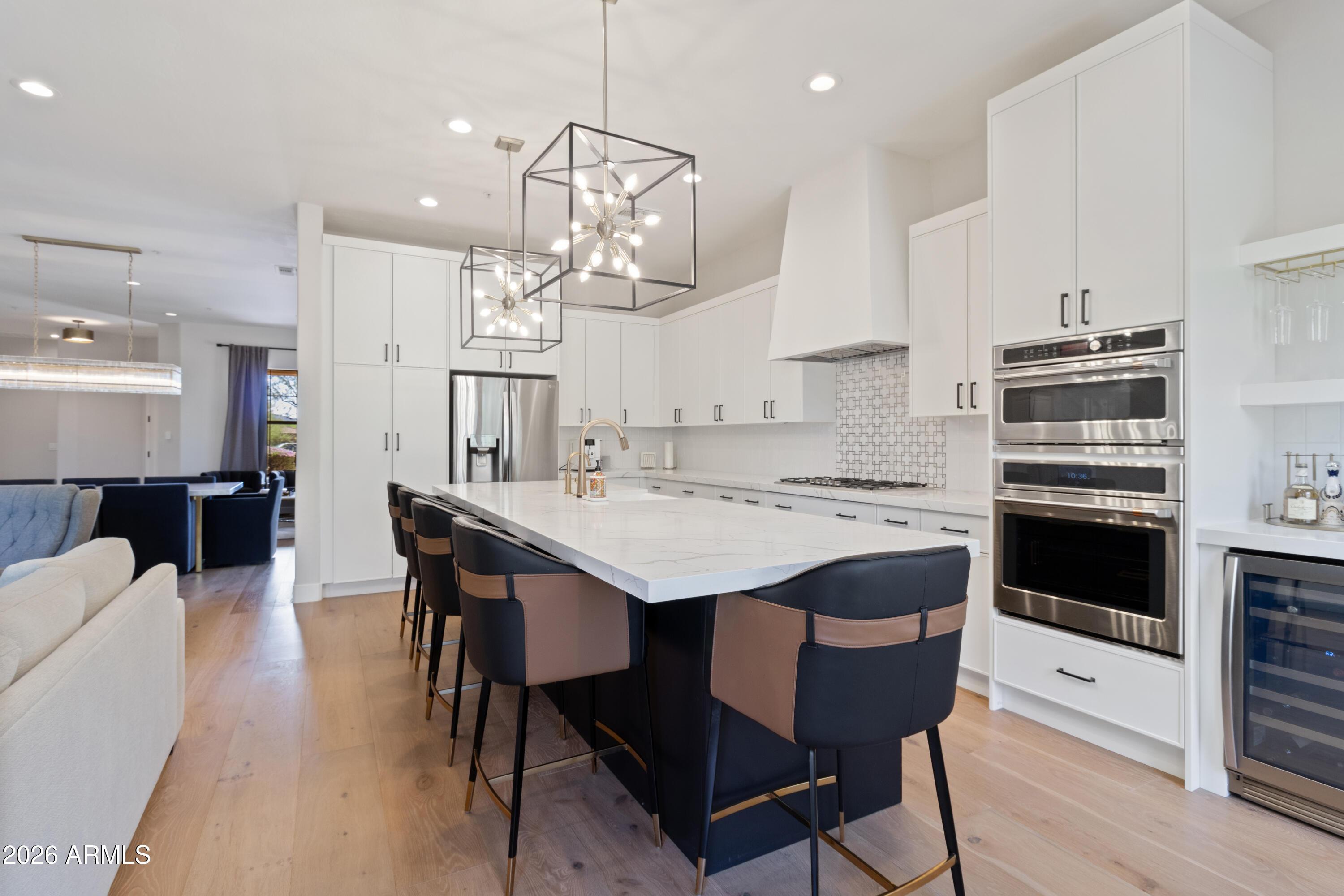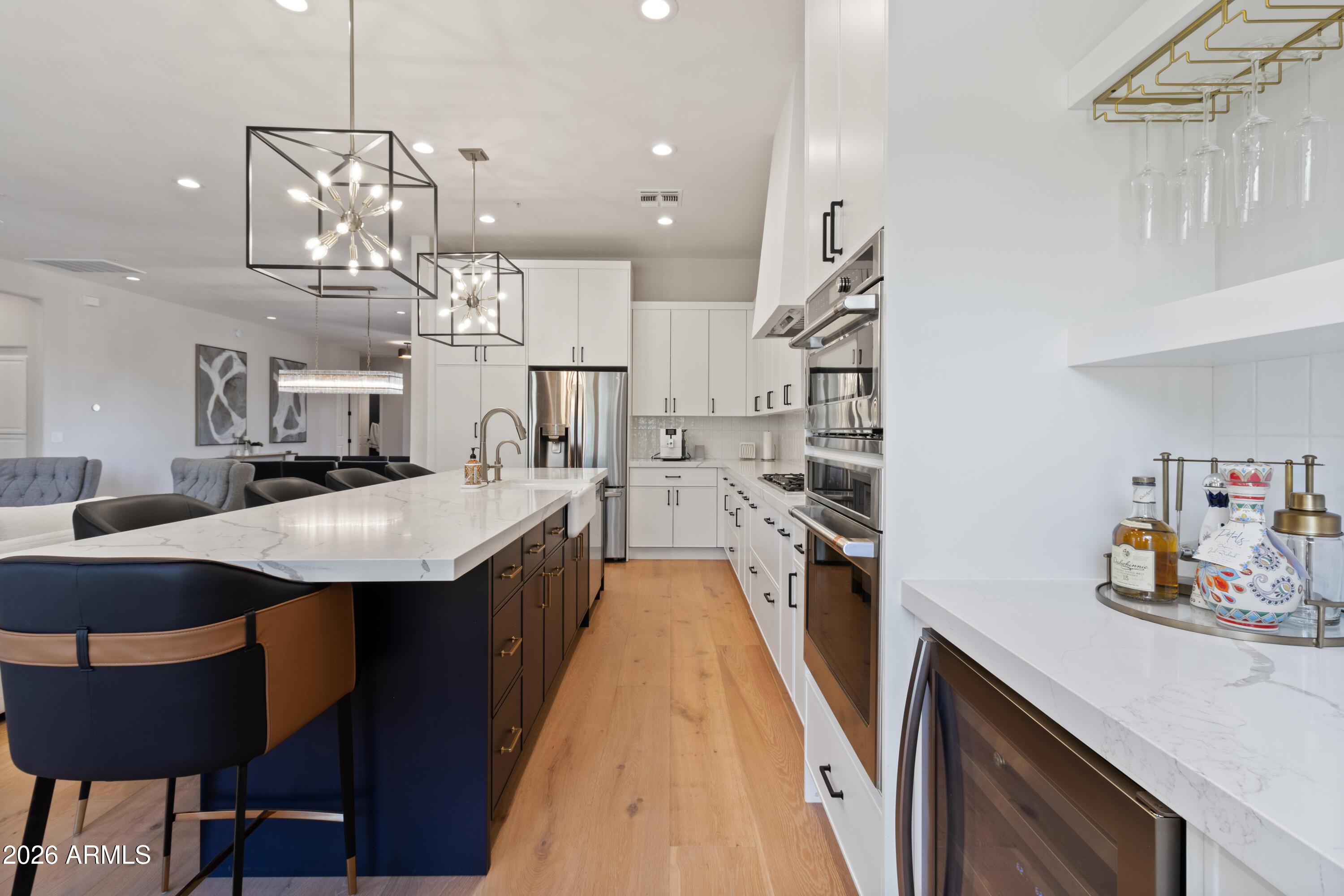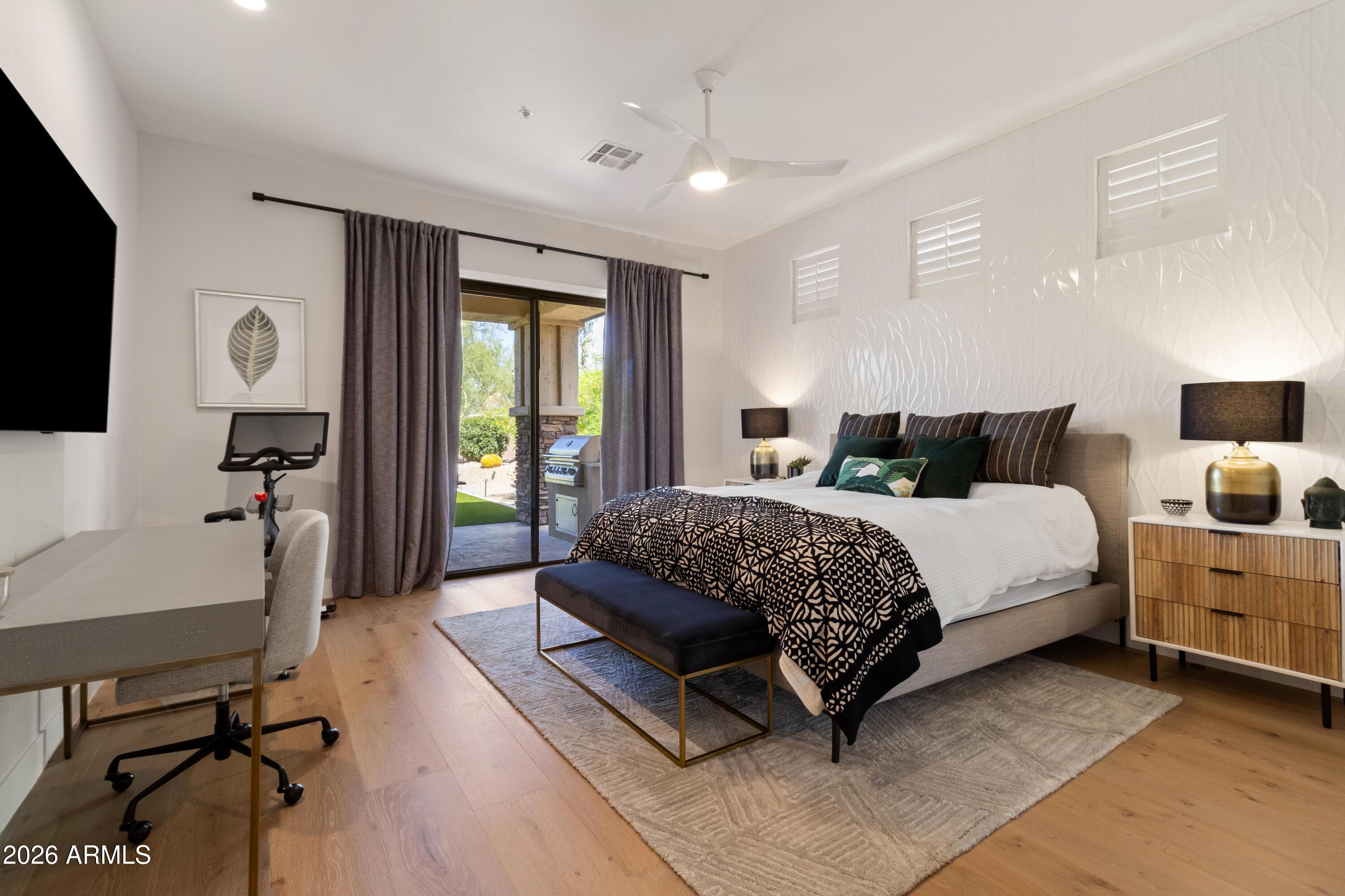 The open-concept floor plan features wood flooring, abundant natural light, and a spacious living area ideal for both relaxing and entertaining. The upgraded kitchen includes stainless steel appliances, a Jura ENA8 coffee machine, wine refrigerator, wet bar, and ample counter space. The kitchen flows seamlessly into the family room with direct access to the private backyard. The primary suite offers a comfortable retreat and includes a Peloton bike. The renovated primary bathroom features a spa-style layout with a glass-enclosed shower and soaking tub Two additional bedrooms are fully furnished and thoughtfully designed for guests or additional occupants.