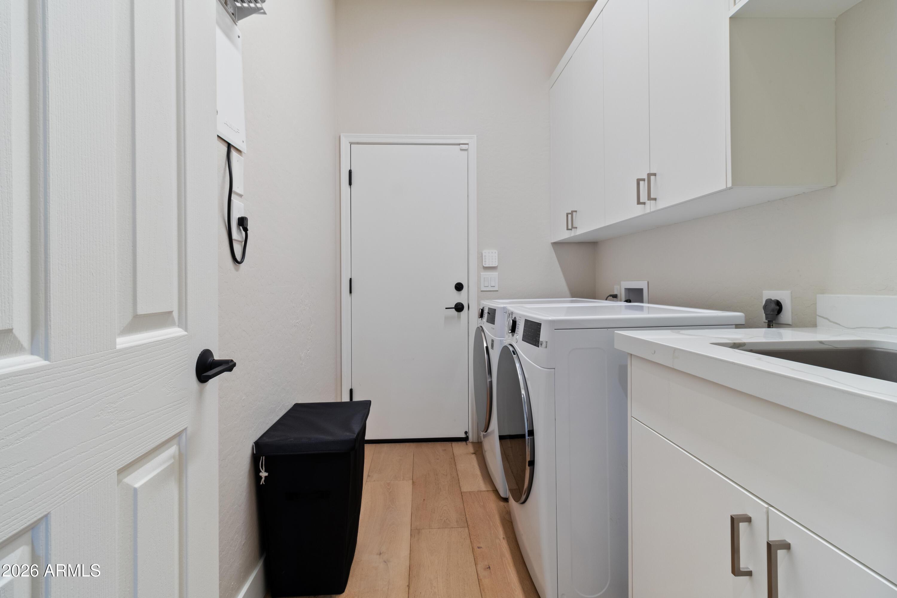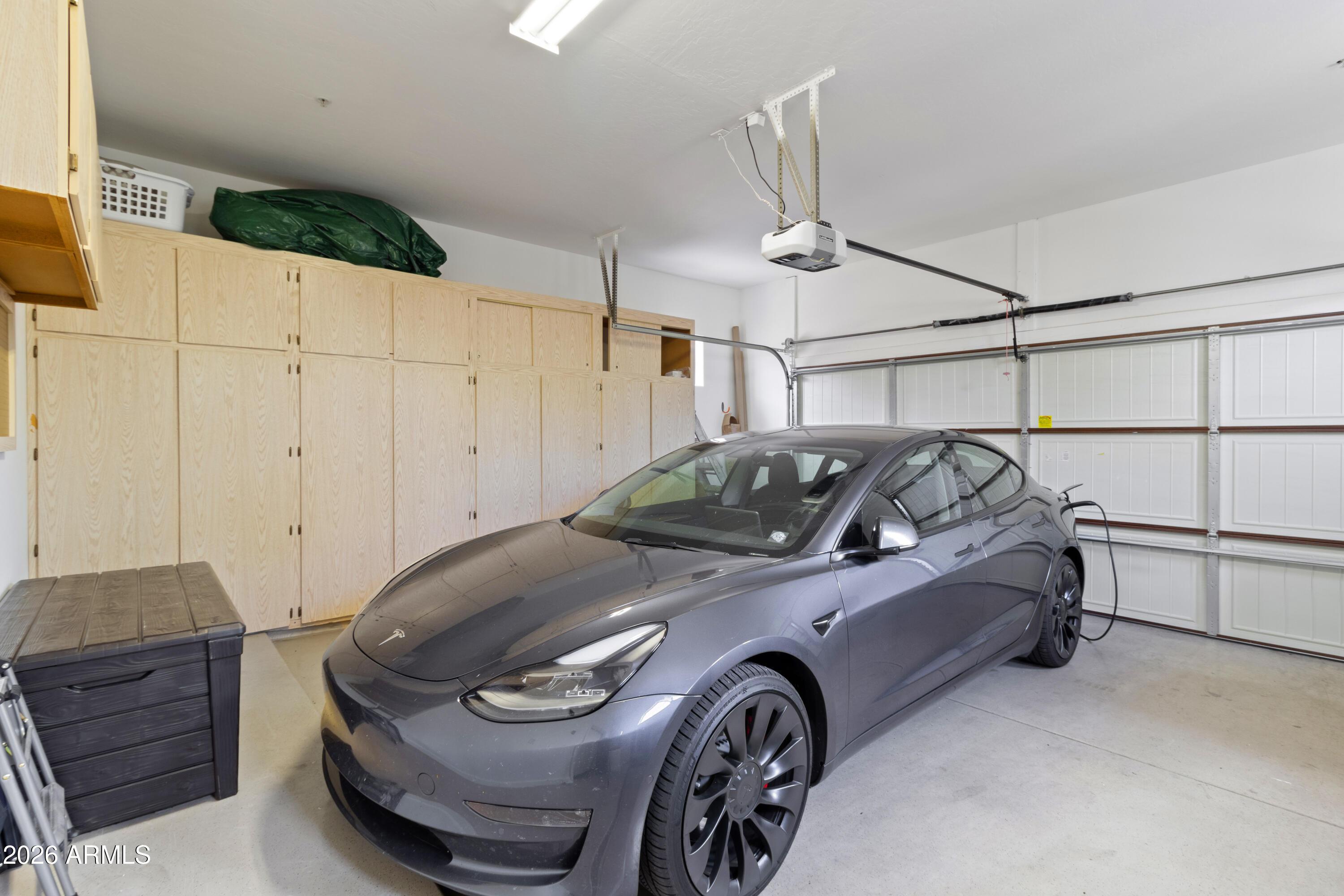 The backyard is professionally landscaped with desert plants, artificial turf, and a built-in grill - perfect for outdoor entertaining. The garage includes built-in storage cabinets and an EV charging station.