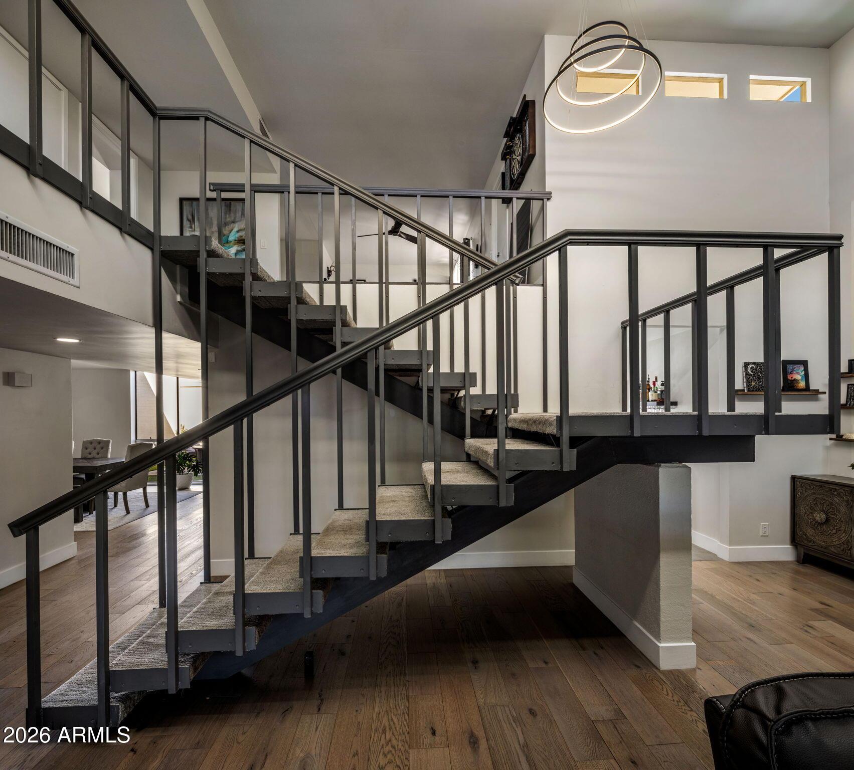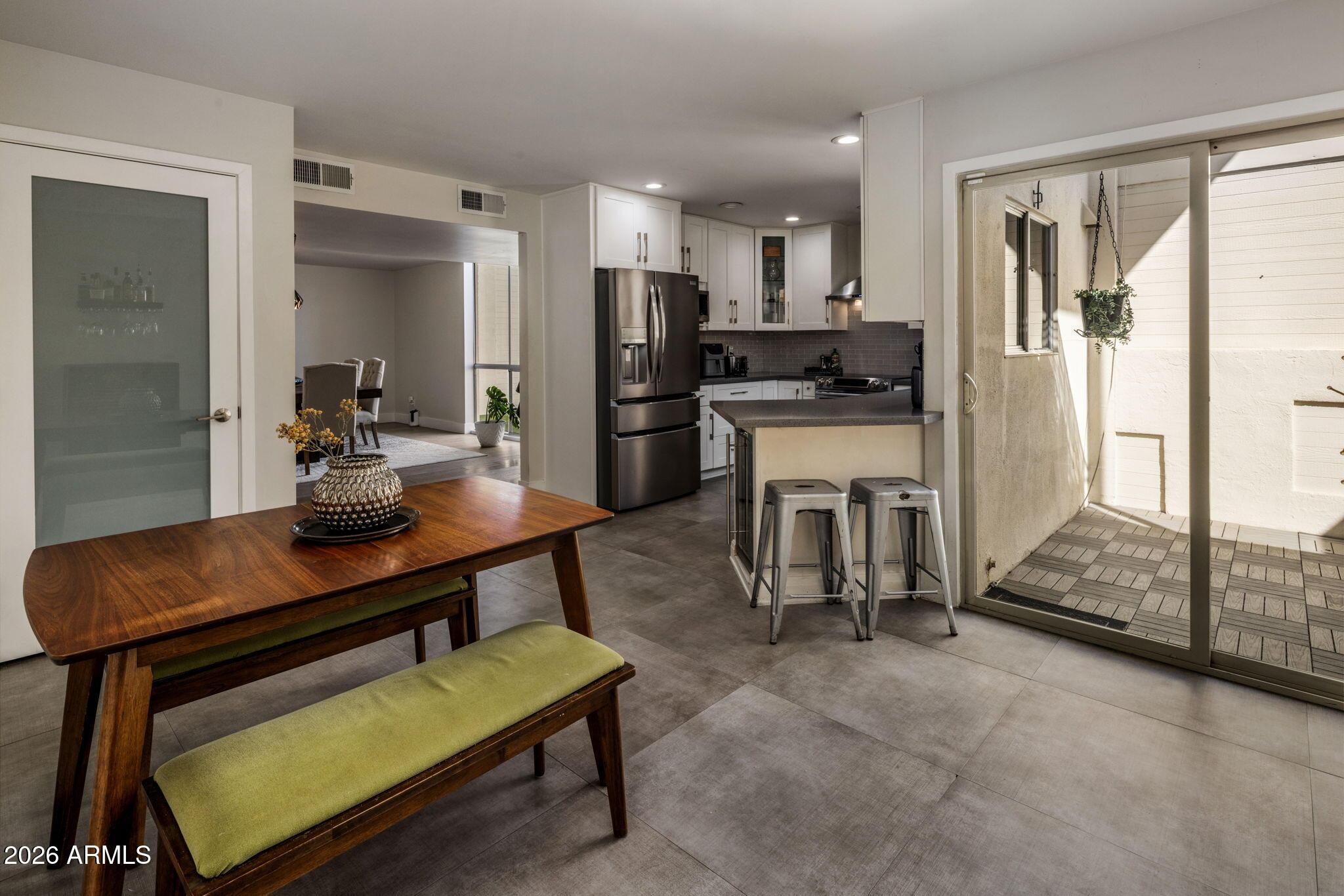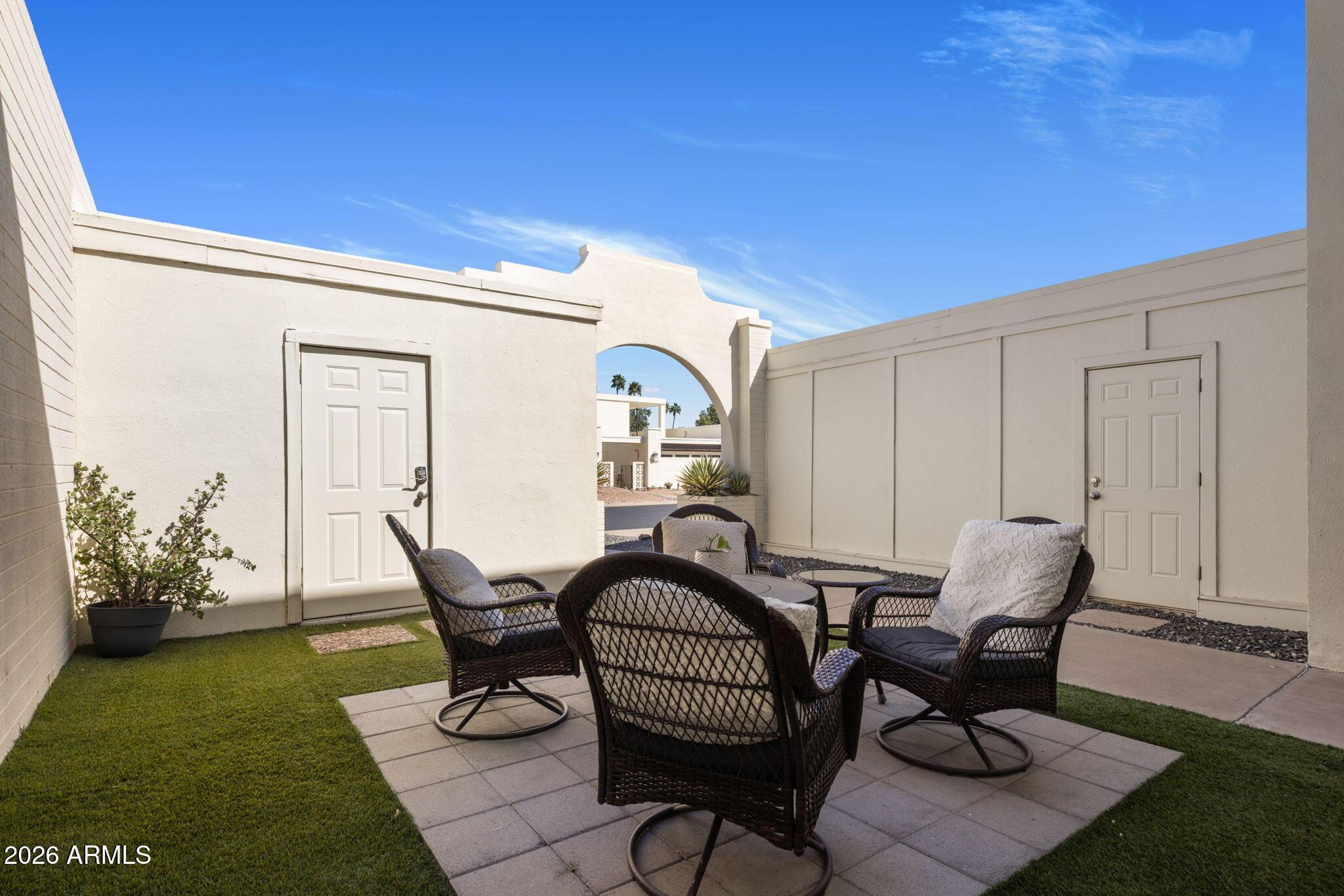 Architectural living meets effortless Scottsdale lifestyle in this rare fully furnished home designed by renowned architect E. T. Wright. This 3-bed, 2.5-bath home offers 3,010 sq ft of bright, open living with vaulted ceilings, hardwood floors, concrete-look ceramic tile, recessed lighting, & modern fixtures. The living space features a large sectional and lift-top coffee table, while the kitchen includes shaker cabinetry, subway tile, wine fridge, & island seating. The primary suite offers a walk-in closet and a spa like shower and private access to the patio. Sip morning coffee from the upstairs porch with mountain views or unwind in the roomy backyard. 2-car garage, storage sheds, Nuvo H2O system, and community pool & spa. Minutes to Old Town Scottsdale dining, shops & entertainment.