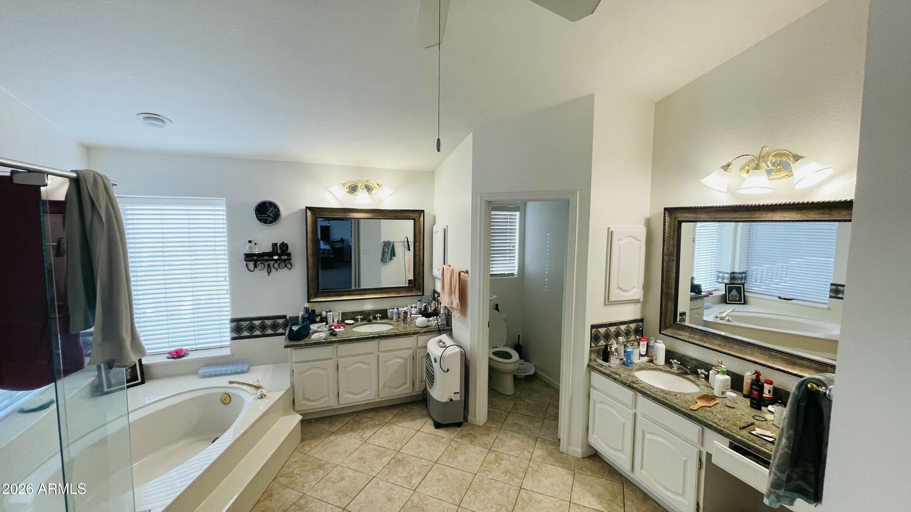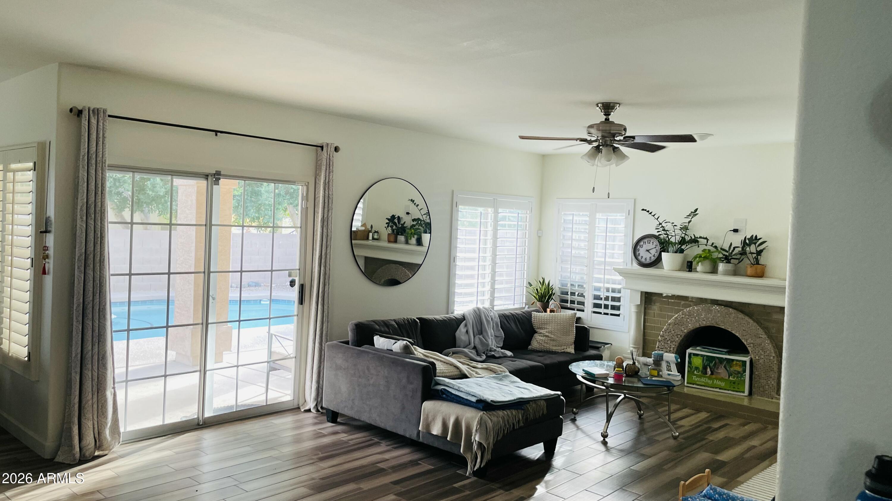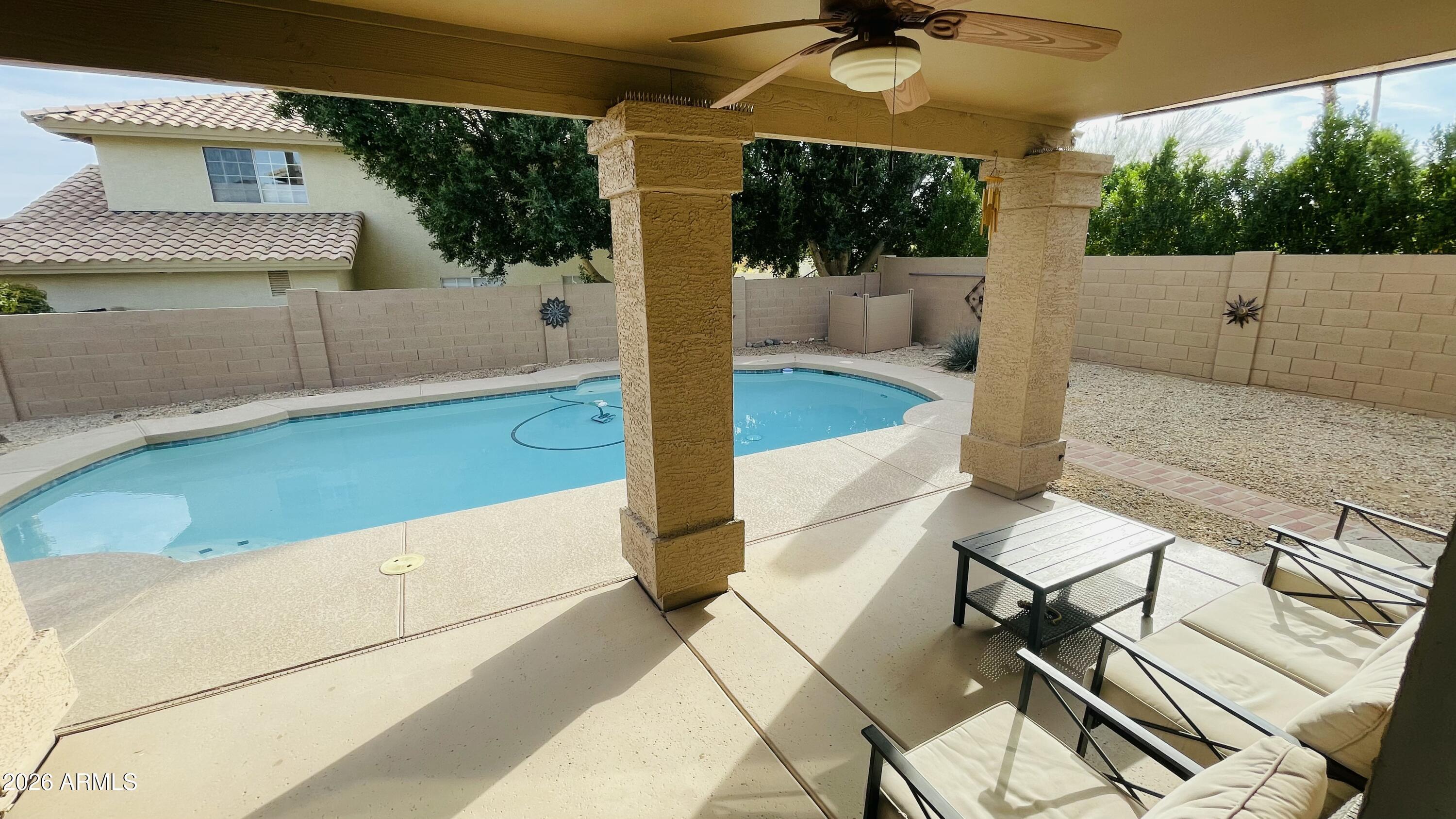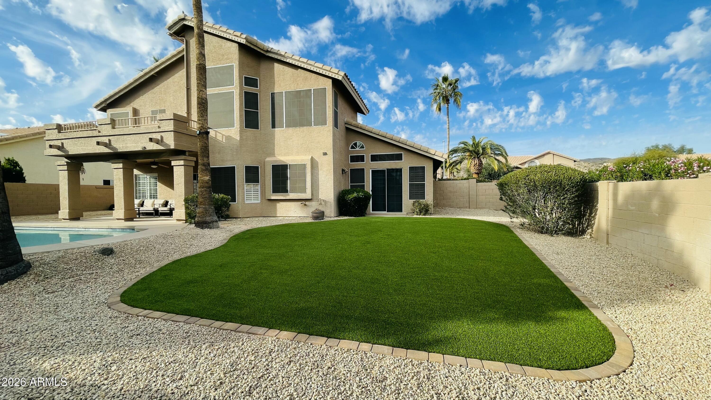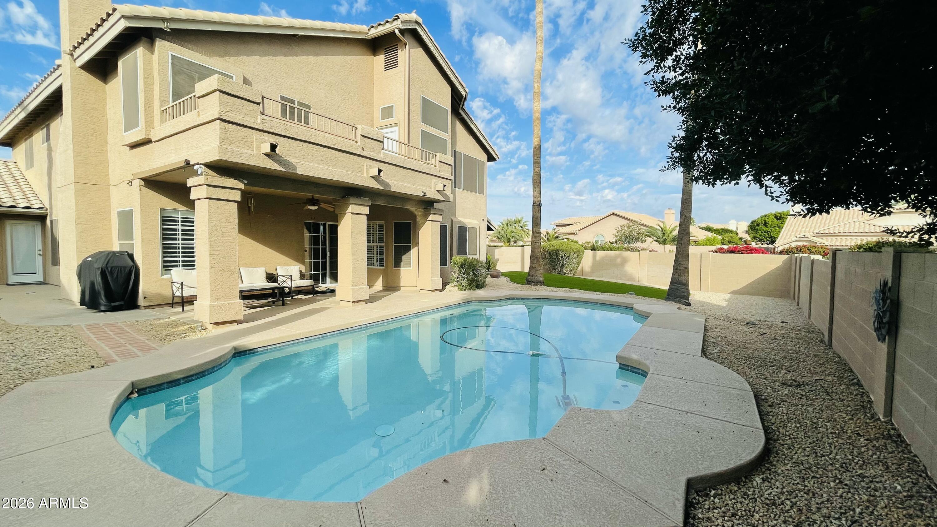 Beautiful Home in Canyon Springs featuring 5 bedrooms and 3 full bathrooms and a private pool. This corner-lot property features high ceilings, wood-look tile flooring, plantation shutters, and multiple living and dining areas. The family room includes a fireplace and wet bar. The kitchen offers granite countertops, stainless steel appliances, mosaic tile backsplash, ample cabinetry, and a breakfast nook with bay window. The upstairs primary suite includes a private balcony, walk-through closet, and en-suite bathroom with dual vanities, separate tub, and shower. Additional features include a 3-car garage, covered patio, central vacuum, water softener, and dual AC units installed in 2019. Storage Areas (Garage cabinet, outdoor shed) are not available for tenant use.