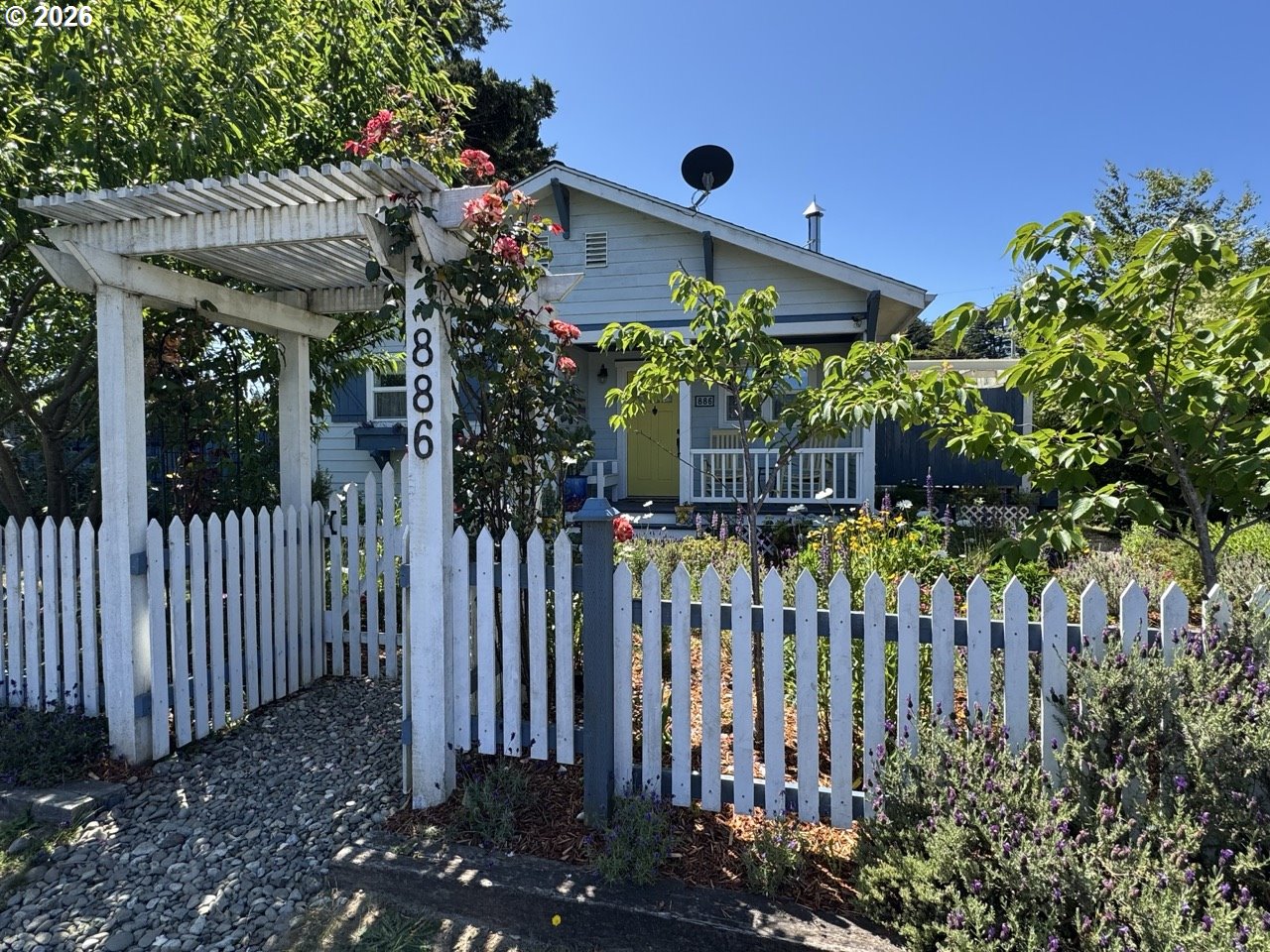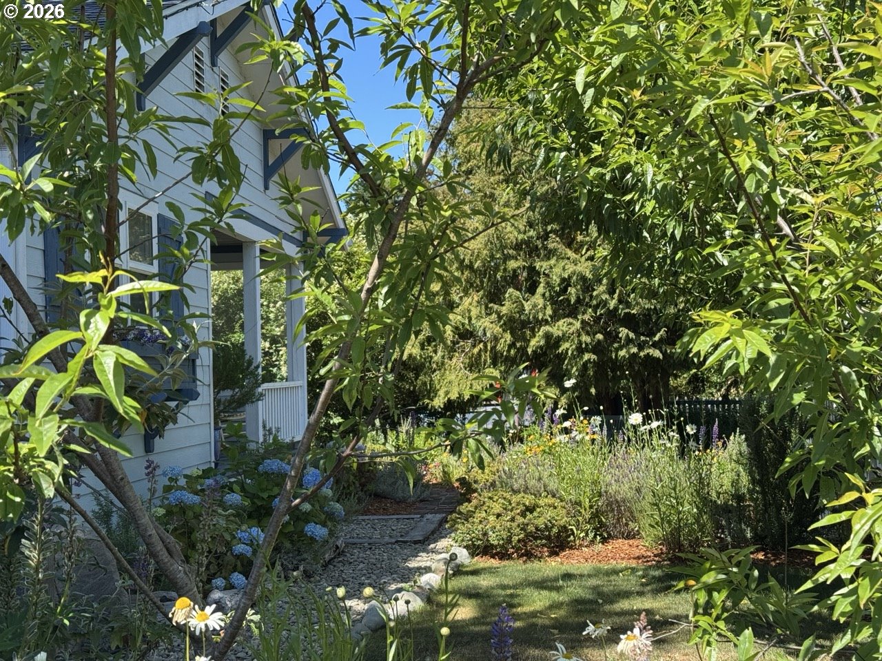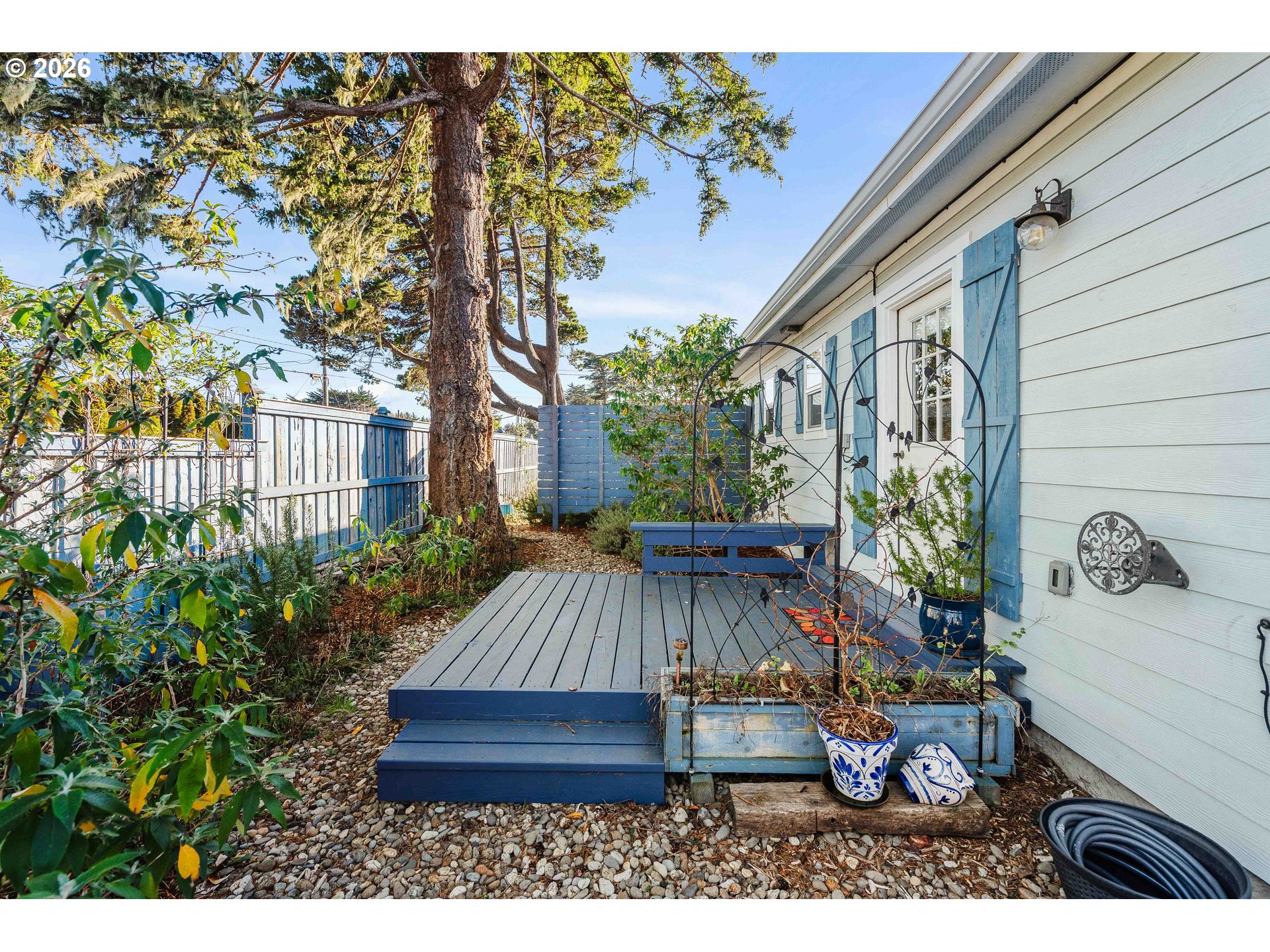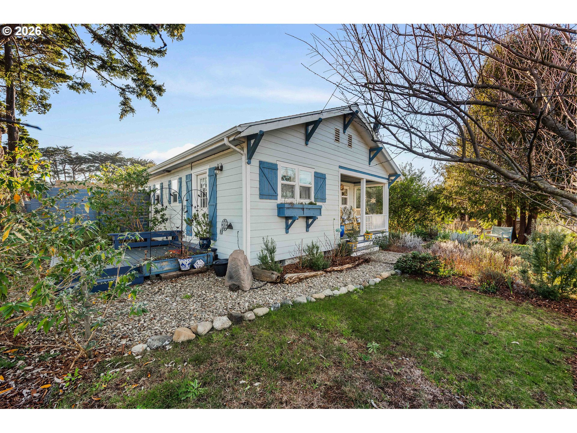Cottage-style charm meets newer construction in Bandon Heights. Built in 2020, this 2-bedroom, 2-bath home offers two ensuite bedrooms—each with its own private deck—plus a bright sunroom and three decks total for easy indoor/outdoor living. The living room opens through French doors to a wraparound deck that continues along the side and into the backyard, while the primary suite features French doors to its own deck retreat.Inside, you’ll find warm tongue-and-groove stained pine details, a kitchen with a detached butcher-block island (included), built-in oven, cooktop with hood, and plumbing/wiring in place for a dishwasher. A handy utility room includes a sink and stackable washer/dryer (included). Both bathrooms feature radiant-heated tile floors and tiled tub surrounds. Bedrooms include built-ins for efficient closet/storage space.Outside is a sunny, fenced yard with alley access and gate, a newer sprinkler system, covered front porch, garden shed/outbuilding, and mature plantings that add serious curb appeal—flowering Japanese cherry trees along the front, climbing “Tropical Lightning” roses over the arbor, and three pear trees (including two Asian pears). New gutters installed in 2022.Enjoy coastal living in Bandon, Oregon—just up the road from Old Town Bandon shops, dining, and the boat marina, with nearby sandy beaches and all the best of the Southern Oregon Coast.