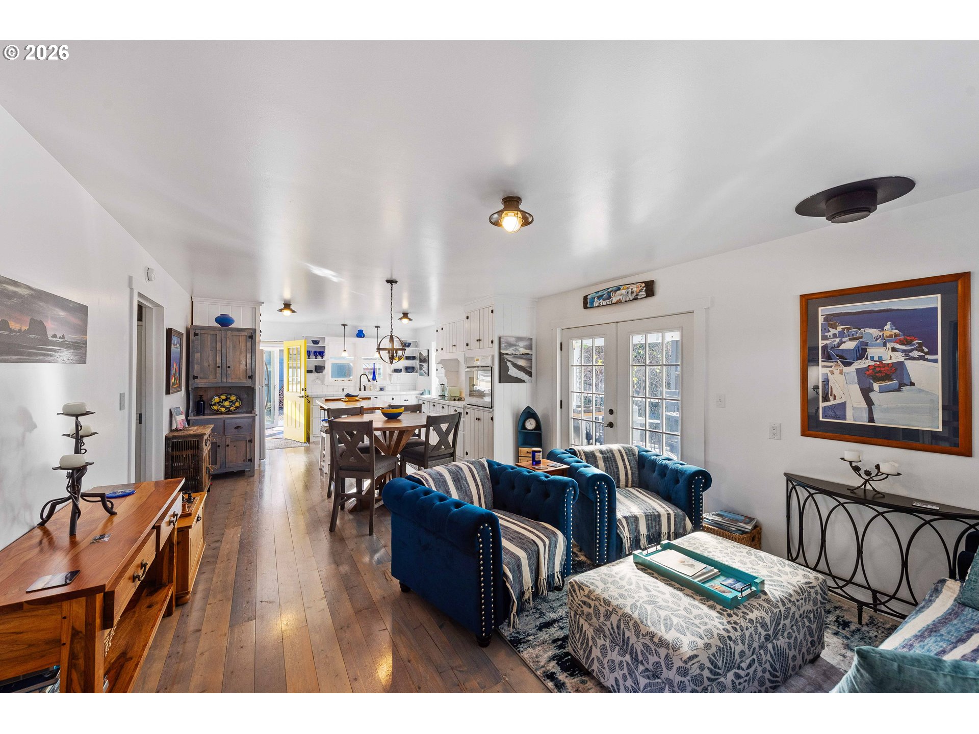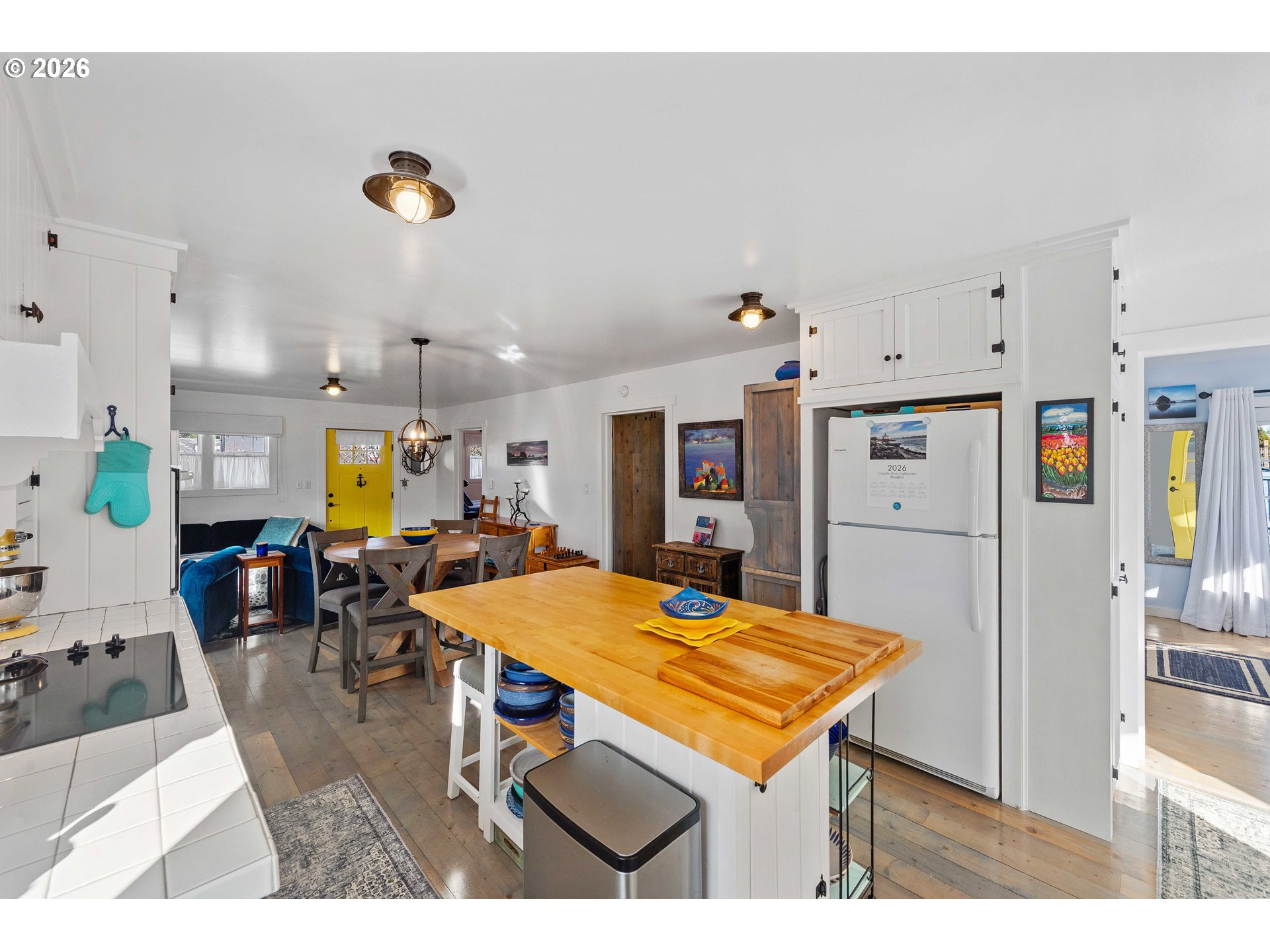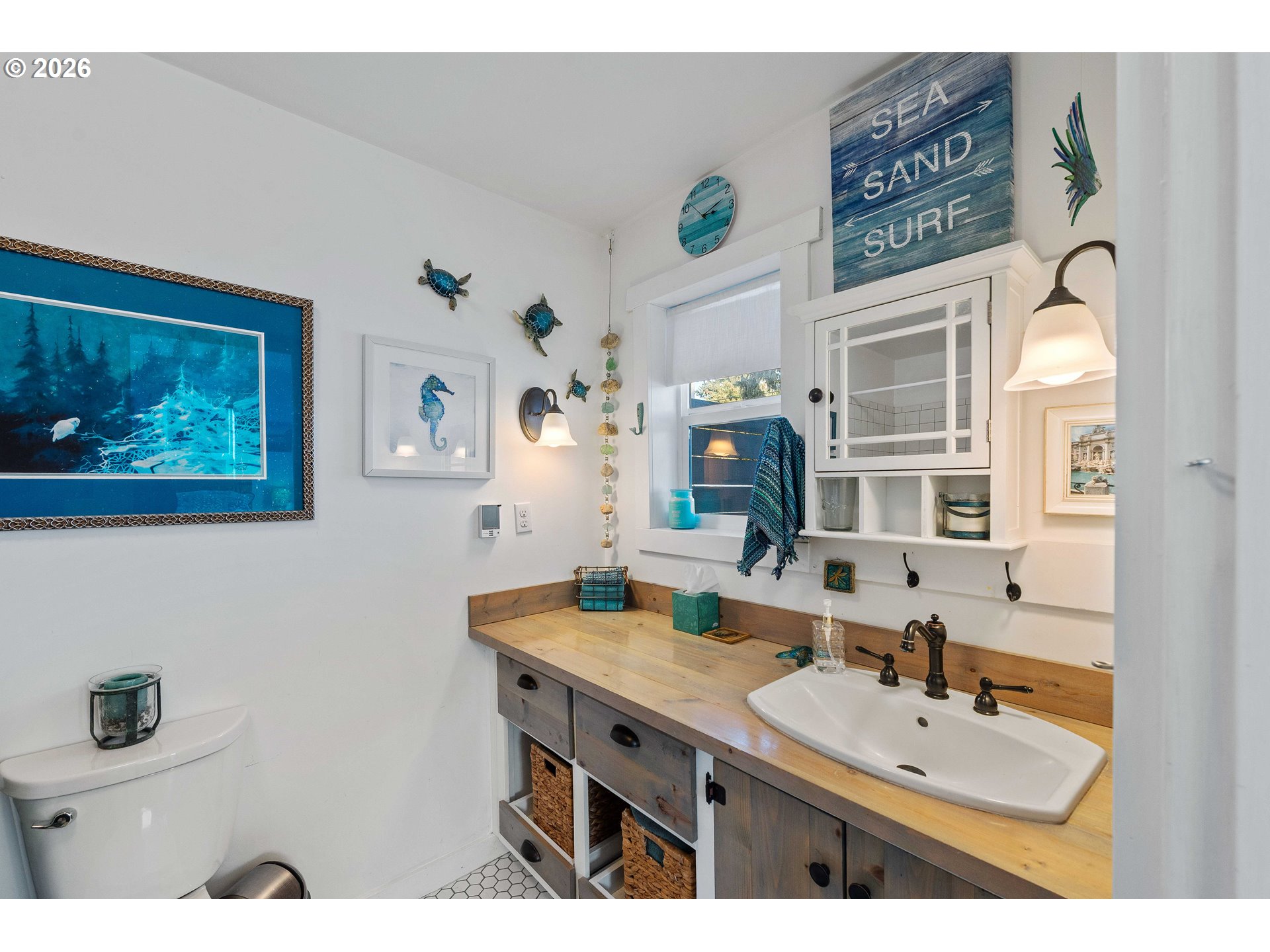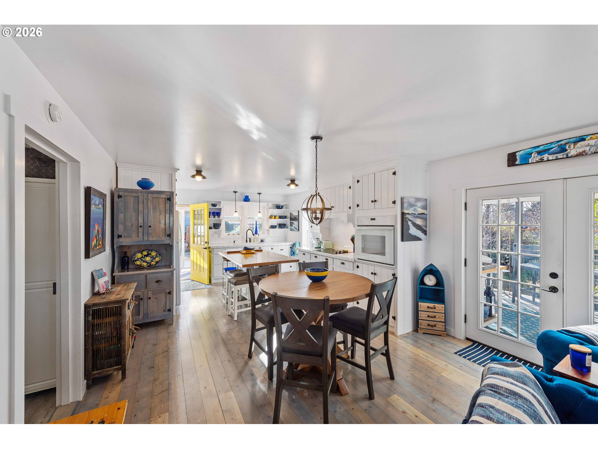 Cottage-style charm meets newer construction in Bandon Heights. Built in 2020, this 2-bedroom, 2-bath home offers two ensuite bedrooms—each with its own private deck—plus a bright sunroom and three decks total for easy indoor/outdoor living. The living room opens through French doors to a wraparound deck that continues along the side and into the backyard, while the primary suite features French doors to its own deck retreat.Inside, you’ll find warm tongue-and-groove stained pine details, a kitchen with a detached butcher-block island (included), built-in oven, cooktop with hood, and plumbing/wiring in place for a dishwasher. A handy utility room includes a sink and stackable washer/dryer (included). Both bathrooms feature radiant-heated tile floors and tiled tub surrounds. Bedrooms include built-ins for efficient closet/storage space.Outside is a sunny, fenced yard with alley access and gate, a newer sprinkler system, covered front porch, garden shed/outbuilding, and mature plantings that add serious curb appeal—flowering Japanese cherry trees along the front, climbing “Tropical Lightning” roses over the arbor, and three pear trees (including two Asian pears). New gutters installed in 2022.Enjoy coastal living in Bandon, Oregon—just up the road from Old Town Bandon shops, dining, and the boat marina, with nearby sandy beaches and all the best of the Southern Oregon Coast.