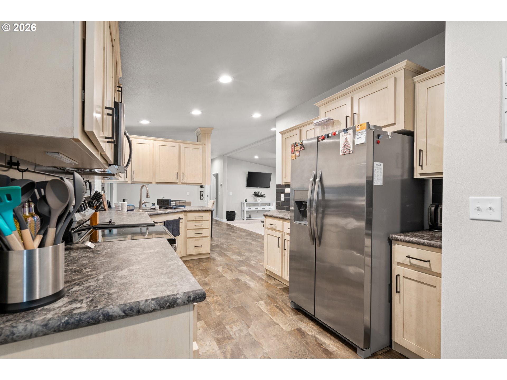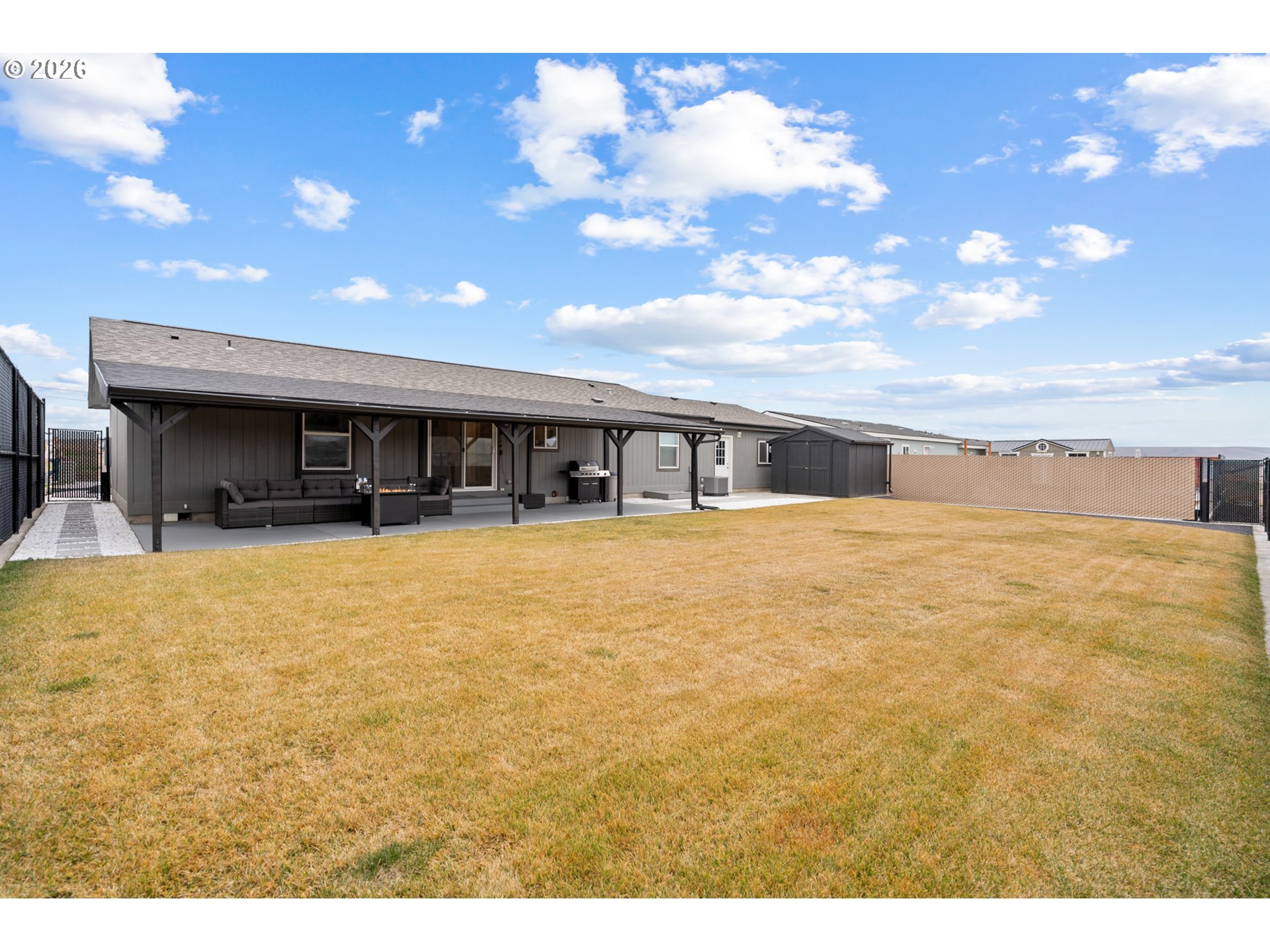 Welcome to this beautiful 2023 manufactured home, offering 1,296 sq ft of thoughtfully designed living space in immaculate, like-new condition. This 3-bedroom, 2-bath home is truly move-in ready and shows pride of ownership throughout. The spacious primary suite is privately located on the opposite side of the home from the two additional bedrooms, creating an ideal layout for comfort and privacy. The floor plan flows seamlessly into a clean, bright kitchen featuring stainless steel appliances, ample cabinetry, and an inviting space for everyday living and entertaining.Enjoy low-maintenance living with a xeriscaped front yard and a fully fenced backyard that’s been professionally landscaped, complete with underground sprinklers and a storage shed. Outdoor living is a dream with a large covered back patio, perfect for relaxing or hosting guests, along with a covered front porch for added curb appeal. New gutters add to the home’s already well-cared-for exterior.This super clean, well-maintained home offers the feel of new construction with all the upgrades already in place—don’t miss this opportunity!