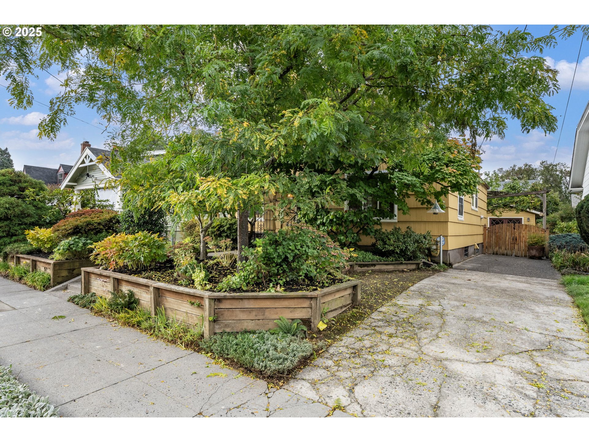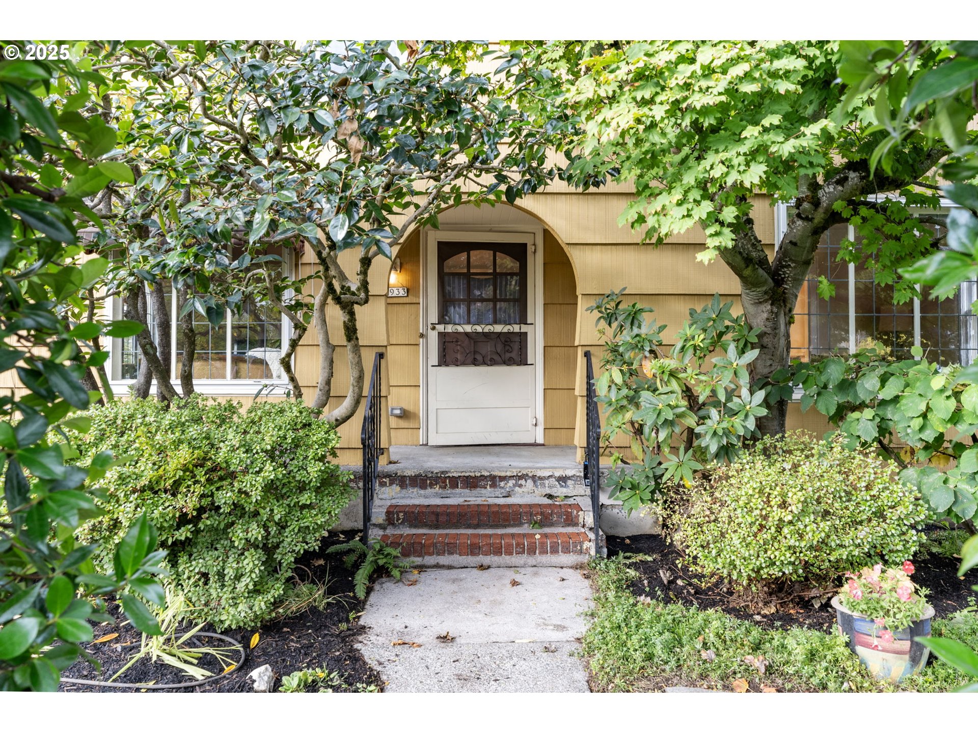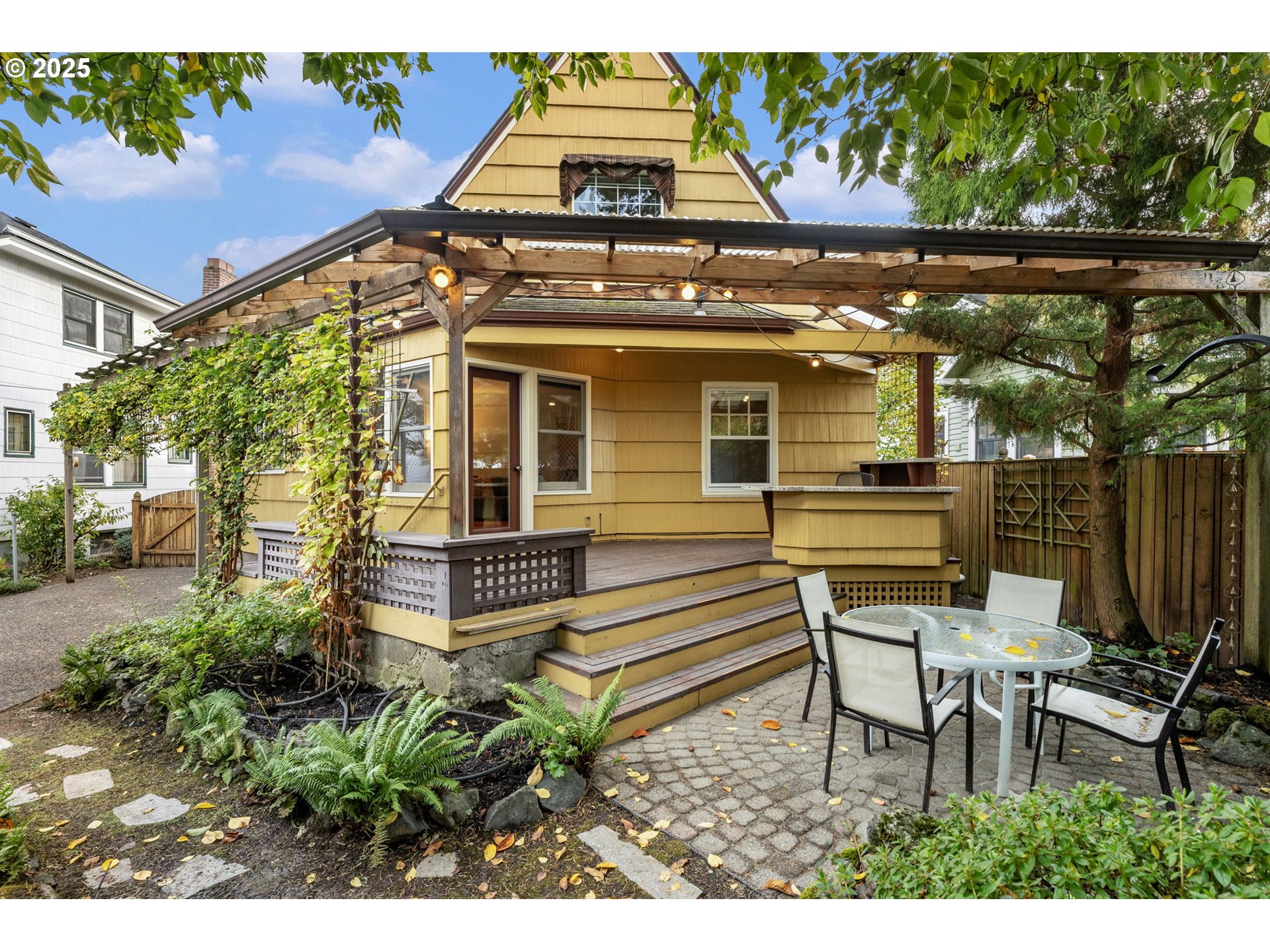 Nestled in sought after Colonial Heights, this enchanting English style home offers timeless charm and modern updates in a storybook setting. A whimsical garden archway welcomes you into a private entry, where lush greenery surrounds the home and provides serene views from within. Lovingly maintained, this home showcases rich period details including original mahogany millwork, leaded glass windows, coved archways, a wood burning fireplace and extensive hardwood flooring. The grand living and dining rooms are ideal for entertaining, featuring generous proportions and a stunning original built-in. The thoughtfully remodeled kitchen (2024) blends classic character with modern convenience, offering new cabinetry, countertops, appliances, and beautifully refinished fir floors. A sunlit breakfast nook with wainscoting and tile flooring is perfect for casual dining, framed by a wall of windows that invite the outdoors in. A rare main-floor family room opens to a spacious covered deck, creating a seamless transition to year-round outdoor living. The main level also includes a bedroom and full bath—ideal for guests or aging in place. Upstairs, a coveted three-bedroom layout includes a spacious primary suite with vaulted wood-lined ceilings and skylights. Storage abounds with deep closets, a full basement with high ceilings, and a detached garage ready for hobbies or recreation. The backyard is a gardener’s paradise - ultra-private and beautifully landscaped with mature plantings, flowering shrubs, shade trees, and a charming vine-covered trellis over a paver patio. Entertain guests at the outdoor bar with granite countertops or unwind under the stars in this peaceful backyard retreat. Located on a quiet, tree-lined street in the heart of Colonial Heights, this home offers easy access to the vibrant shops, restaurants, and cafes of Division and Hawthorne. One of Portland’s most desirable neighborhoods with outstanding schools. [Home Energy Score = 1. HES Report at https://rpt.greenbuildingregistry.com/hes/OR10242140]