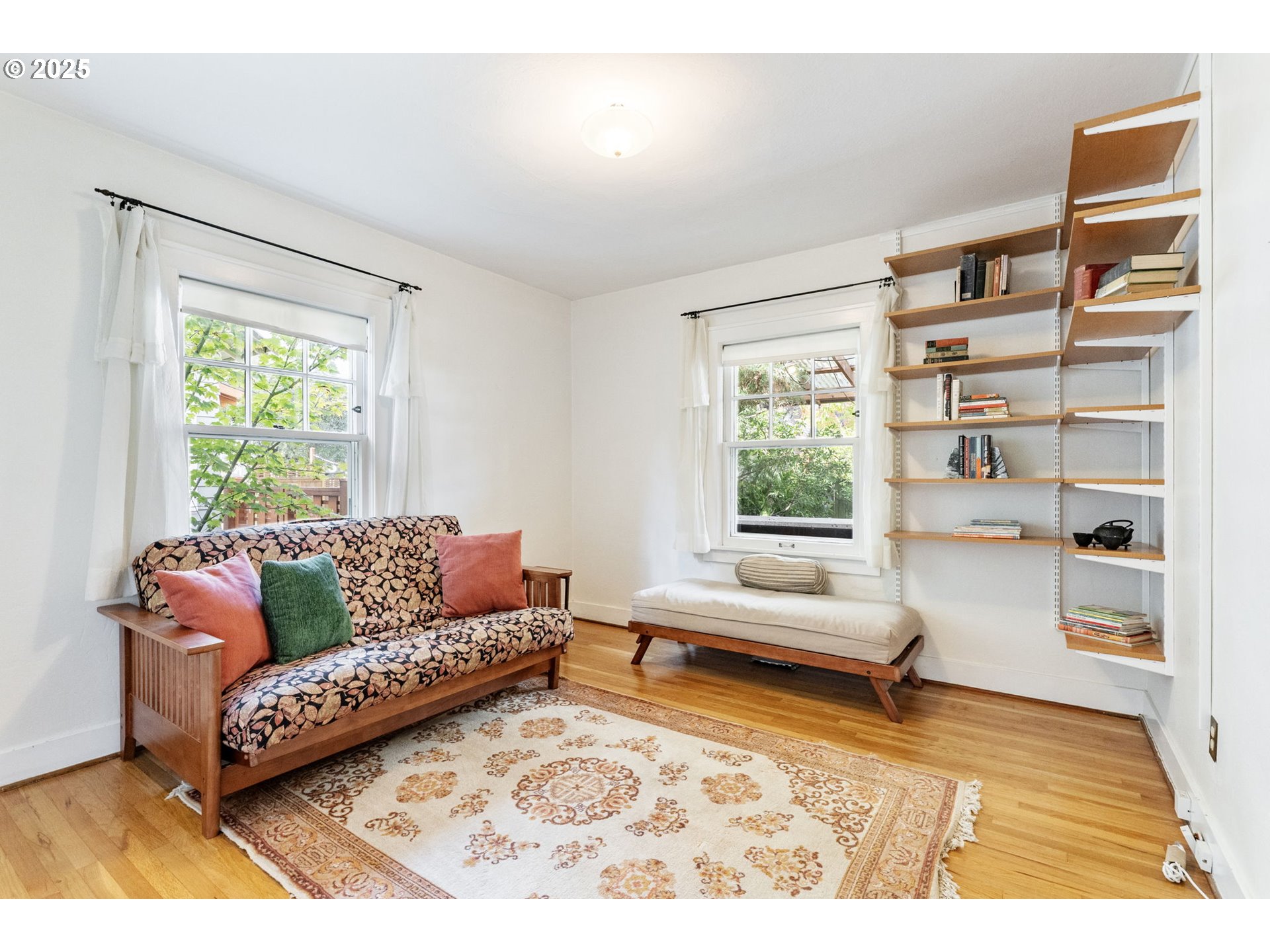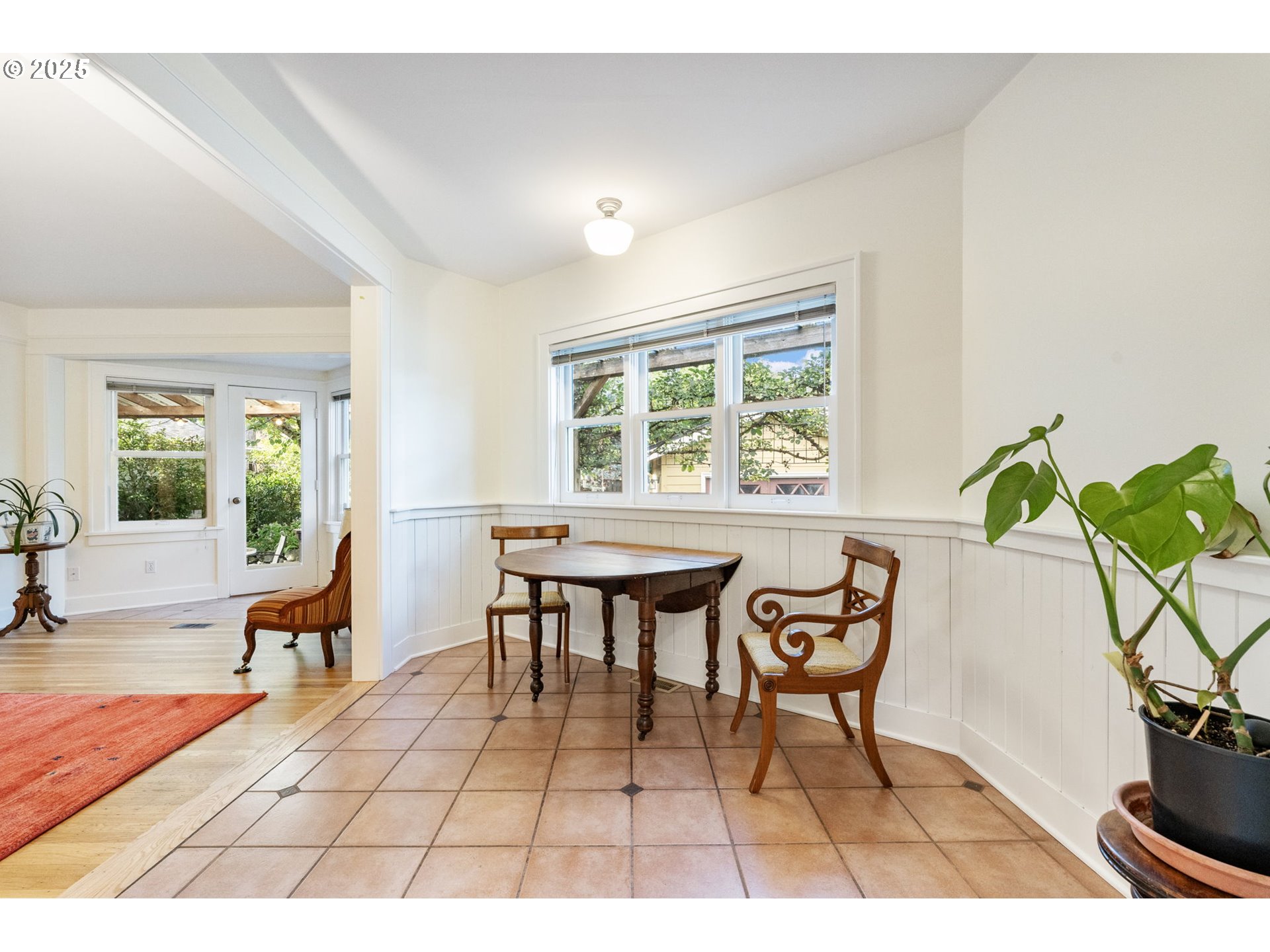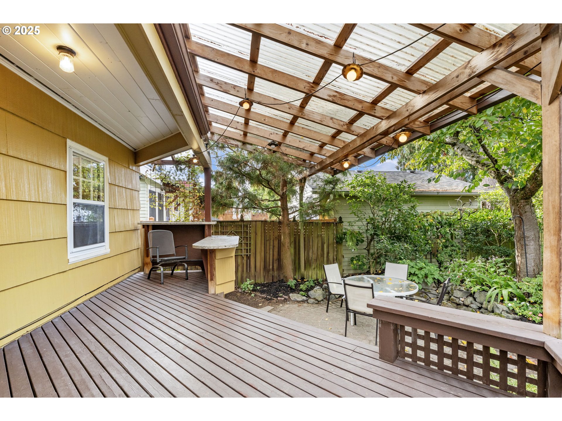 Nestled in sought after Colonial Heights, this enchanting English style home offers timeless charm and modern updates in a storybook setting. A whimsical garden archway welcomes you into a private entry, where lush greenery surrounds the home and provides serene views from within. Lovingly maintained, this home showcases rich period details including original mahogany millwork, leaded glass windows, coved archways, a wood burning fireplace and extensive hardwood flooring. The grand living and dining rooms are ideal for entertaining, featuring generous proportions and a stunning original built-in. The thoughtfully remodeled kitchen (2024) blends classic character with modern convenience, offering new cabinetry, countertops, appliances, and beautifully refinished fir floors. A sunlit breakfast nook with wainscoting and tile flooring is perfect for casual dining, framed by a wall of windows that invite the outdoors in. A rare main-floor family room opens to a spacious covered deck, creating a seamless transition to year-round outdoor living. The main level also includes a bedroom and full bath—ideal for guests or aging in place. Upstairs, a coveted three-bedroom layout includes a spacious primary suite with vaulted wood-lined ceilings and skylights. Storage abounds with deep closets, a full basement with high ceilings, and a detached garage ready for hobbies or recreation. The backyard is a gardener’s paradise - ultra-private and beautifully landscaped with mature plantings, flowering shrubs, shade trees, and a charming vine-covered trellis over a paver patio. Entertain guests at the outdoor bar with granite countertops or unwind under the stars in this peaceful backyard retreat. Located on a quiet, tree-lined street in the heart of Colonial Heights, this home offers easy access to the vibrant shops, restaurants, and cafes of Division and Hawthorne. One of Portland’s most desirable neighborhoods with outstanding schools. [Home Energy Score = 1. HES Report at https://rpt.greenbuildingregistry.com/hes/OR10242140]
