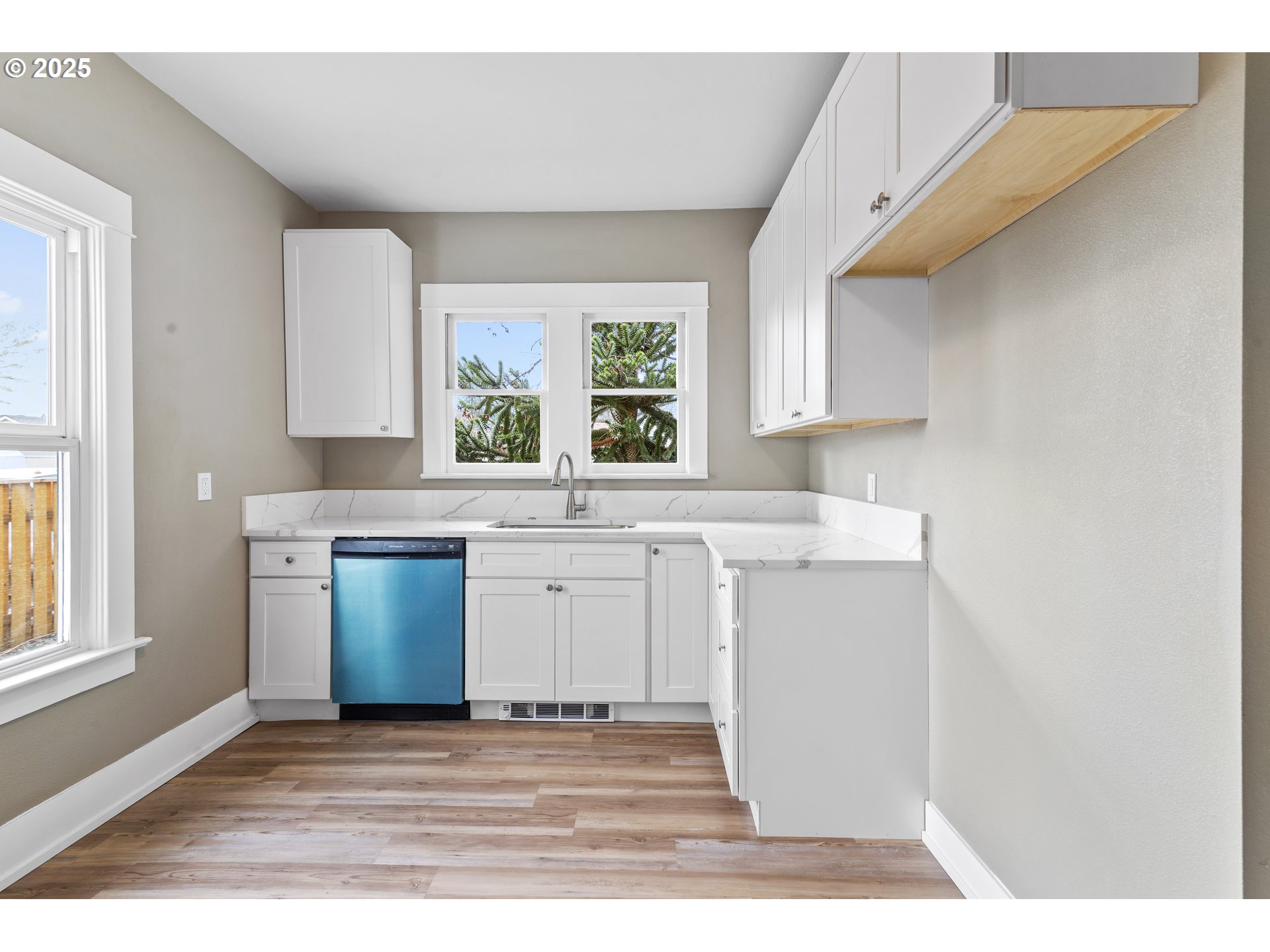 This beautifully remodeled home offers a modern lifestyle in a highly convenient SE Portland location. The new kitchen features sleek cabinets, stunning white quartz countertops, perfect for culinary enthusiasts and gatherings. The lower level has been thoughtfully finished to include a spacious family room, ideal for movie nights or entertaining. This versatile space can also serve as a home office or guest room, offering flexibility to suit your needs. A contemporary new bathroom enhances comfort and style with modern fixtures. Each bedroom is generously sized, providing ample space for relaxation and personal expression. Vinyl windows throughout the home ensure excellent insulation, keeping the house cool in summer and warm in winter. The fully insulated home improves energy efficiency and comfort year-round. Sitting on a corner lot, the property offers potential for off-street parking and adds to its curb appeal. The front covered porch is perfect for morning coffee or unwinding after a busy day. The backyard includes a concrete patio, ideal for outdoor barbecues and gatherings. Located in a prime SE Portland neighborhood, this home offers unparalleled convenience with easy access to stores, restaurants, and amenities. Quick freeway access makes commuting to downtown Portland or exploring the scenic Pacific Northwest effortless. This is a move-in-ready home, more than just a house—it's an opportunity to enjoy a modern, comfortable lifestyle in a sought-after area. Priced to sell, it provides incredible value for anyone seeking a stylish, ready-to-go starter home. Schedule your viewing today and imagine how this house could become your new home!