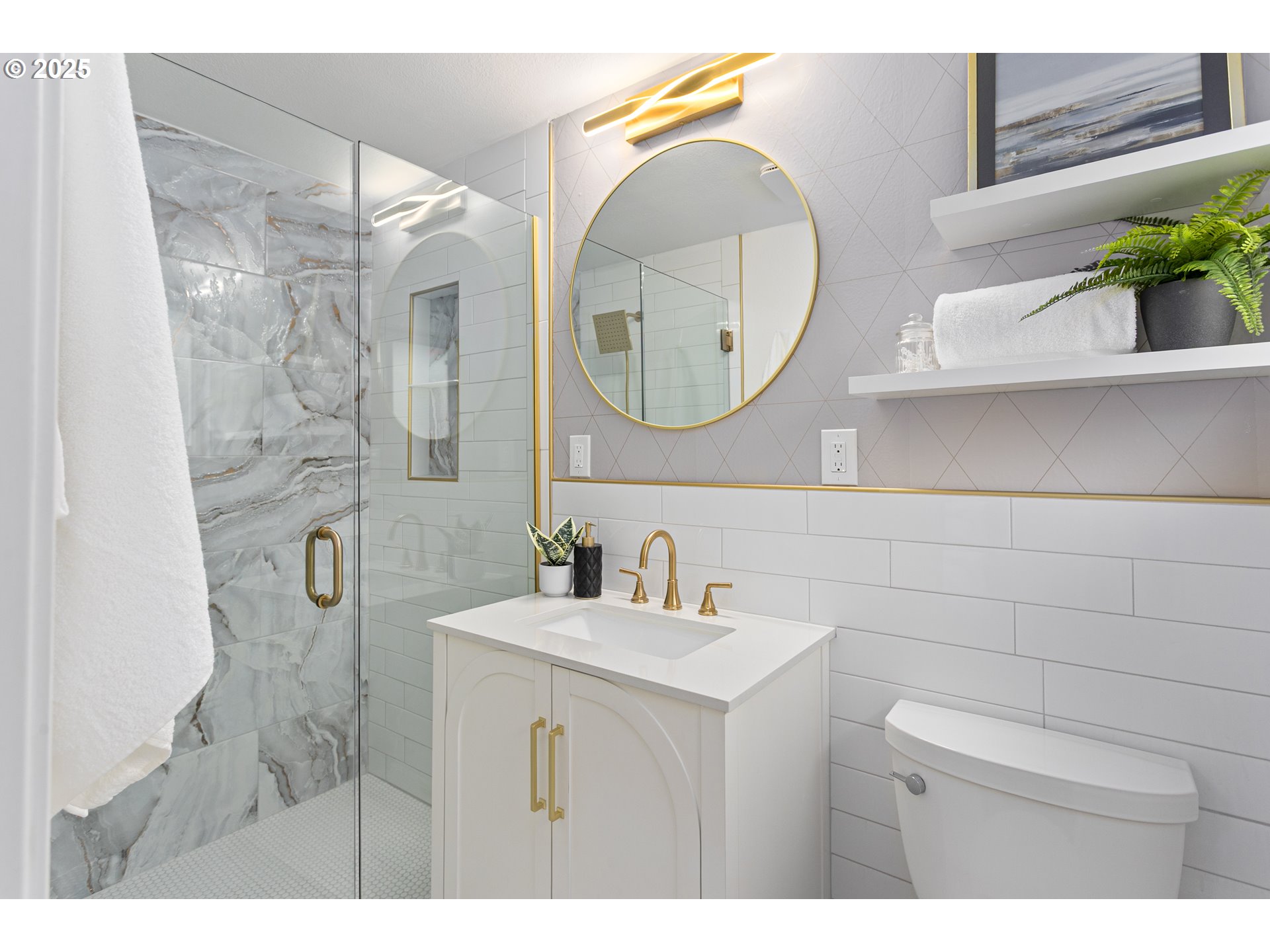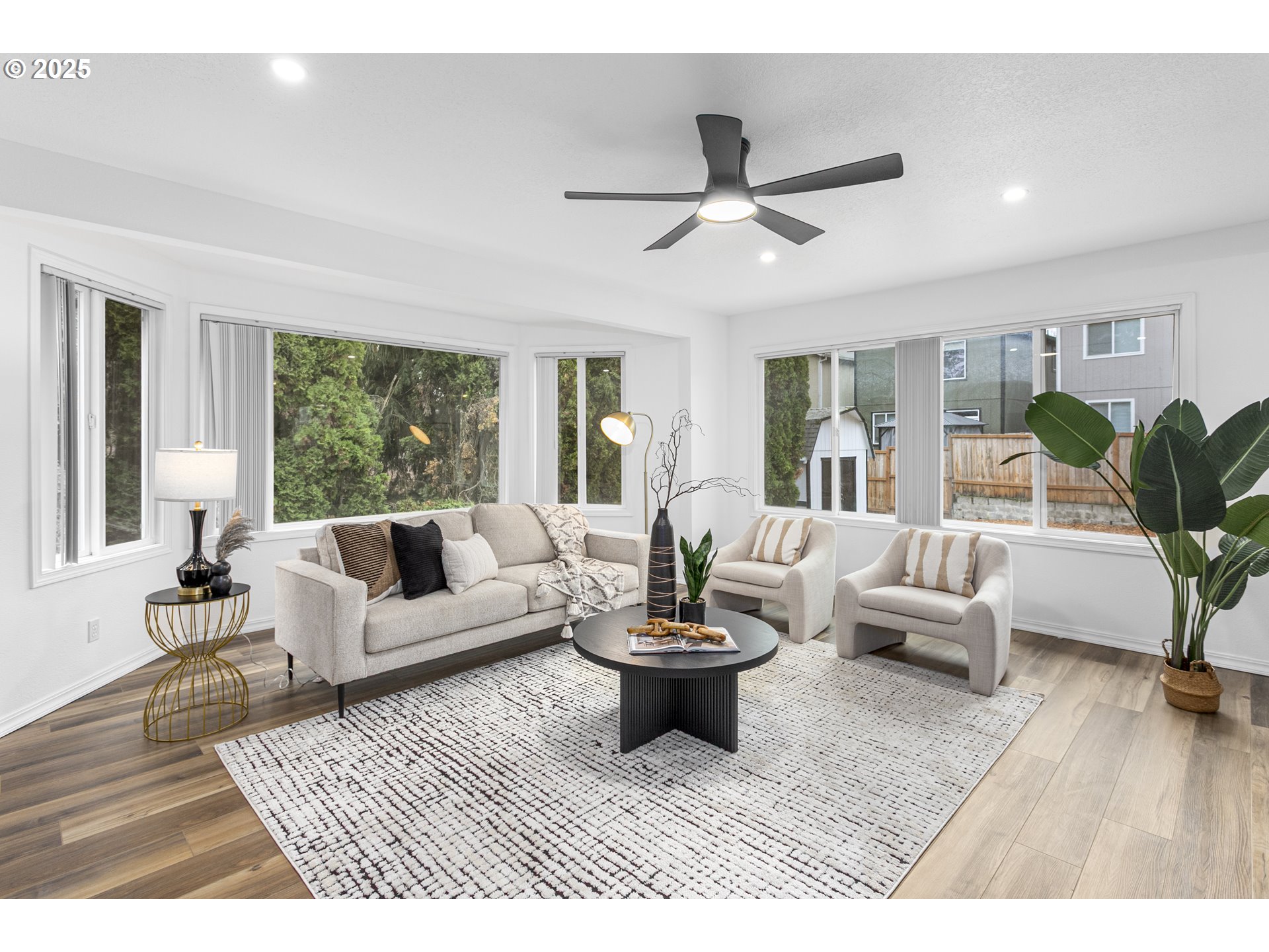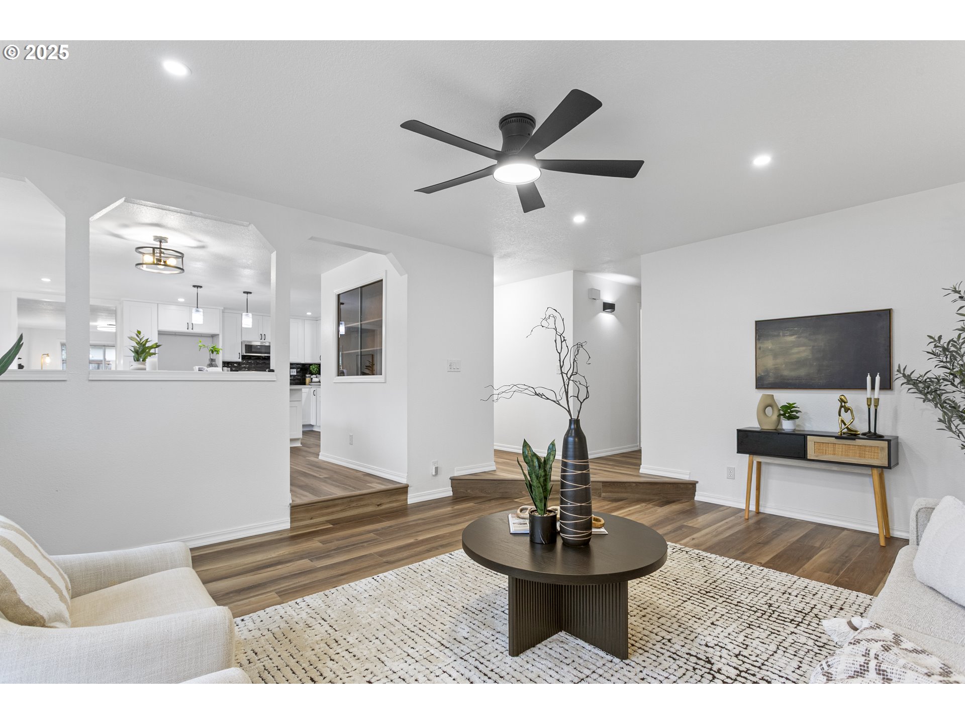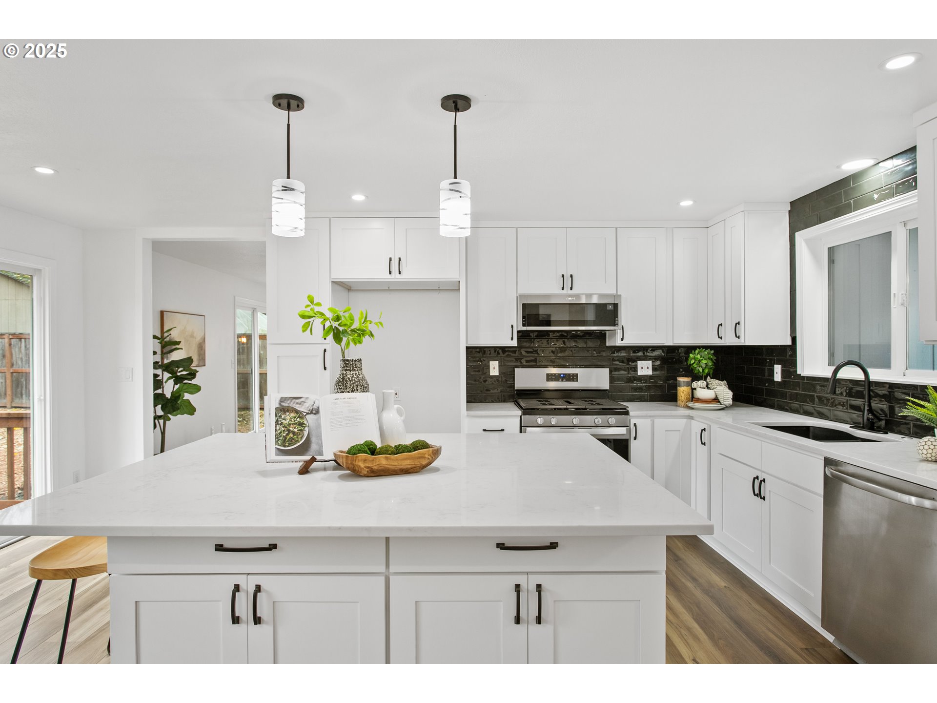 Step inside this beautifully renewed 3-bedroom, 2-bathroom home where modern design is paired with warm, comfortable living. Abundant windows brighten every room, highlighting the fresh finishes and creating an inviting, airy feel throughout. The main level features wide-plank luxury vinyl flooring, adding both durability and style as it connects the living, dining, and kitchen spaces seamlessly. At the center of the home is a kitchen designed to bring people together. The oversized island with sleek 3mm quartz countertops offers plenty of space for meals, conversations, and everyday routines. Clean white cabinetry, matte black hardware, and a textured black tile backsplash give the space a polished, contemporary character that feels both fresh and timeless. The primary suite is a standout, featuring a custom accent wall and an elegant ensuite with warm gold fixtures, a marble-inspired shower, and a thoughtfully designed vanity. Two additional bedrooms offer flexibility for guests, work, or play, each updated with soft carpeting, modern lighting, and large windows. The second full bath boasts a dual-sink vanity and striking deep-blue tile that adds depth and personality. Out back, the spacious yard is ready for relaxation or gathering, complete with an inviting outdoor fire-pit that creates a comfortable spot for evenings under the open sky. Every space in this home has been refreshed with intention, offering a move-in-ready blend of function, style, and comfort. This isn’t just an updated home—it’s a welcoming place to settle in and make your own.