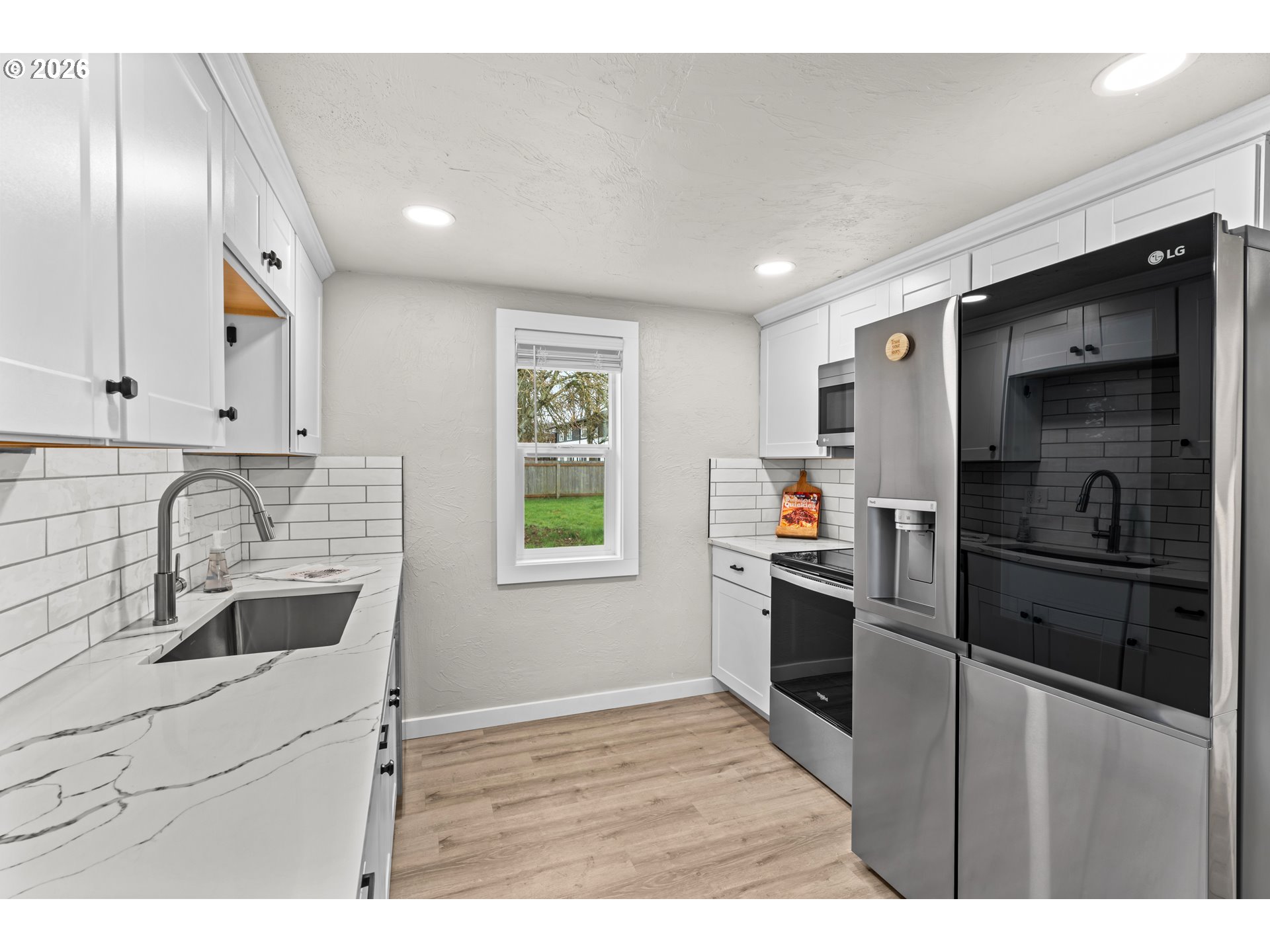 Welcome to this delightful, updated 3-bedroom, 1-bath bungalow nestled in the heart of Springfield, near services and easy access to the freeway. In 2023, this gem received a top-to-bottom revamp featuring shaker cabinets, modern stainless-steel appliances, luxury vinyl plank flooring, interior and exterior paint and stylish canned lighting and fixtures. The lustrous quartz kitchen countertops add to the modern ambiance, paralleled by new baseboards, interior doors, as well as a new driveway that further enhance the property. Keeping practicality in mind, a washer and dryer are included, ready for laundry days. The exterior complements the property with a brand-new sod in the front yard, and a sizable backyard featuring an outbuilding—perfect for outdoor family activities or gardening enthusiasts. Plenty of room to add a garage or carport and enough room for RV parking. Under the city's provision, there might be a possibility to add an ADU or partition lot, making this property highly versatile. Don't miss this move-in ready haven that marries style with functionality. Buyer to perform all due diligence.