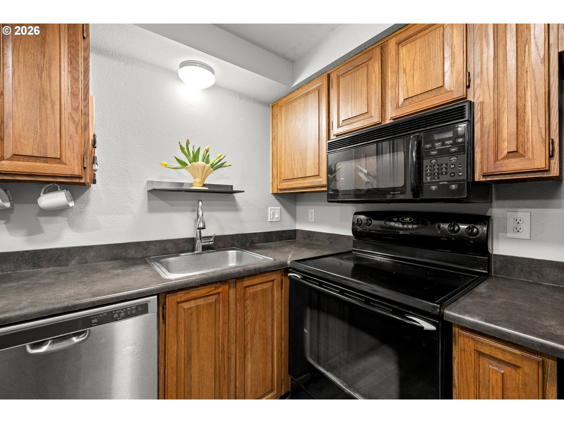 Charming End-Unit Townhome in Multnomah Village. Nestled among the trees in the heart of Multnomah Village, this inviting end-unit townhome offers spacious rooms filled with natural light from generously sized windows. Step outside and enjoy peaceful moments on the private patio perfect for relaxing or entertaining. Parking is easy with both a detached garage and an assigned parking spot. This prime location is near local favorites like Trader Joe’s at Garden Home, Gabriel Park, the Multnomah Art Center, and the scenic Woods Park Trail. The upper level features two spacious bedrooms, a shared full bath, and a linen closet. Main level offers an entry, living room with a wood burning fireplace and slider to patio, kitchen, dining area with eating bar, and a half bath with laundry. All appliances are included. New electrical panel, new two head mini-split heat pump in living room & primary bedroom, new deck and front steps. Seller to pay assessment balance at closing. HOA includes water, sewer, garbage, landscaping, exterior maintenance, insurance, and management. OPEN SATURDAY 2/7 1pm-3pm [Home Energy Score = 6. HES Report at https://rpt.greenbuildingregistry.com/hes/OR10097163]