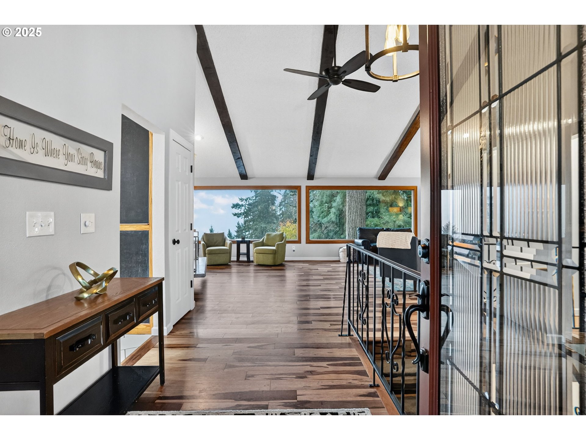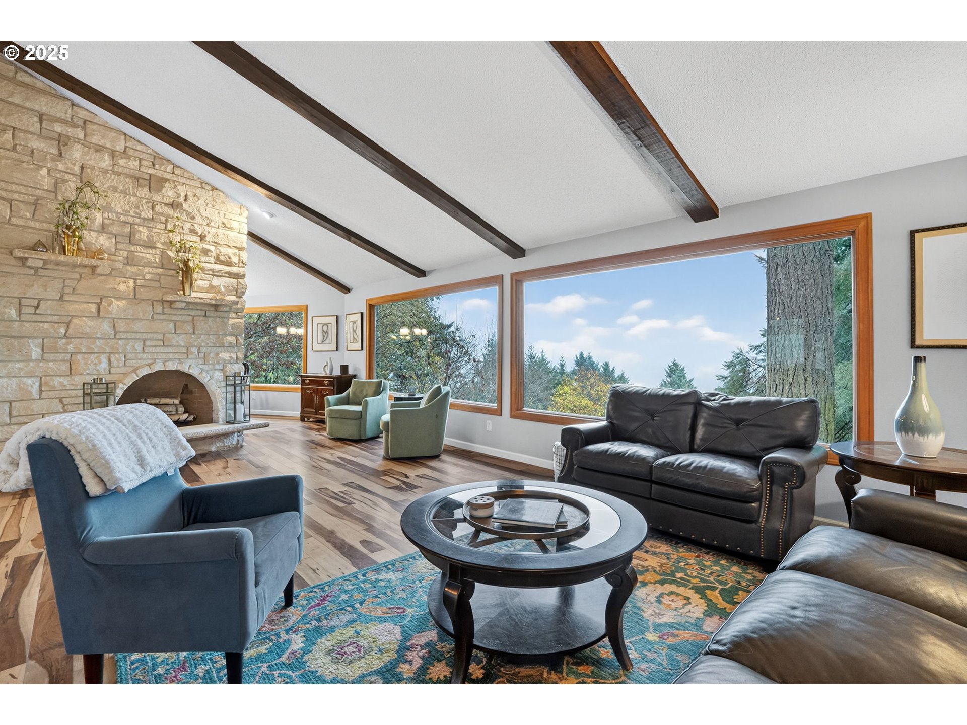 Secluded 2-acre wooded estate with breathtaking Mt. Hood views your private sanctuary awaits! This remodeled Mid-Century home blends timeless character with thoughtful, high-end updates. Step through the formal foyer into a light-filled living space with vaulted timber-beam ceilings, a wall of new Renewal by Andersen windows, and a cozy gas fireplace framed in white limestone. The open dining area flows effortlessly to the brand-new composite deck with metal railing perfect for morning coffee, summer BBQs, or a future hot tub overlooking the manicured yard and illuminated pergola. The chef’s kitchen features sleek Quartz counters, KitchenAid convection oven + microwave, Jenn-Air downdraft cooktop, refurbished indoor Majestic Char-Grill gas BBQ, and oversized pantry. The main floor hosts a spacious primary suite with remodeled bath and walk-in closet, plus an additional bedroom and updated full bath. The daylight basement offers flexible living with two more bedrooms (one with exterior access), full bath, office space, large laundry room, and an oversized family room with second gas fireplace in petrified wood and agate with a slider to the private backyard. A separate 424 sq ft ADU with 10-ft ceilings, kitchenette, gas furnace, ½ bath, and plumbing for shower + water heater offers endless potential for a home business, studio, guest suite, or rental. Fence property includes a security gate, RV parking with electric + sewer hook-ups, and approximately $150K in merchantable timber. The 2-acre parcel may be partitioned or subdivided (buyer to verify); acreage is buildable. Clackamas county property not within Gladstone city limits. Conveniently located minutes from River access, Gladstone’s shops, dining, and freeway access this rare estate offers serenity, versatility, and exceptional value. Welcome Home to 17542 Kirkwood Rd. Gladstone, OR 97027