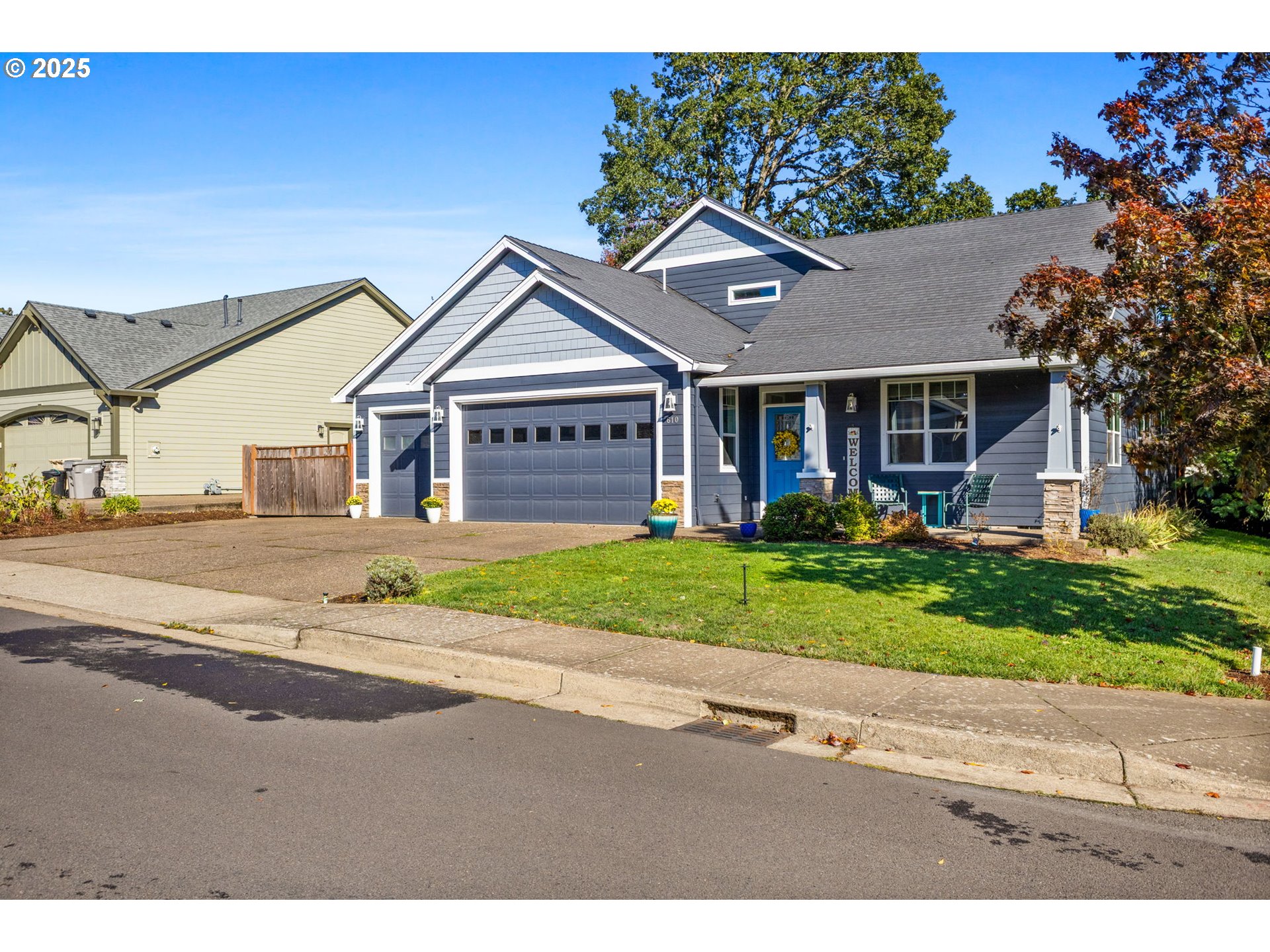 This truly unique, custom 2006 build is made for flexible, potential dual-living with primary suites with bathrooms and walk-in closets on both the main and second floors- the main level planned with ADA features/accessibility in mind. You’ll love the airy great room and open kitchen with quartz countertops. Soaring ceilings, engineered hardwood floors, and a cozy gas fireplace. New furnace 2024 and exterior paint 2021. 3rd car finished garage perfect for workshop/bonus space. Gated RV pad with plug-ins.Set on a large corner lot in a quiet, desirable neighborhood the backyard is perfect for entertaining or play with curated spaces, and a deck with entrances to bedroom and kitchen. Close to Salem and 40 minutes from the coast. 2 bedrooms upstairs and 2 bedrooms on the main floor with 3 full baths.