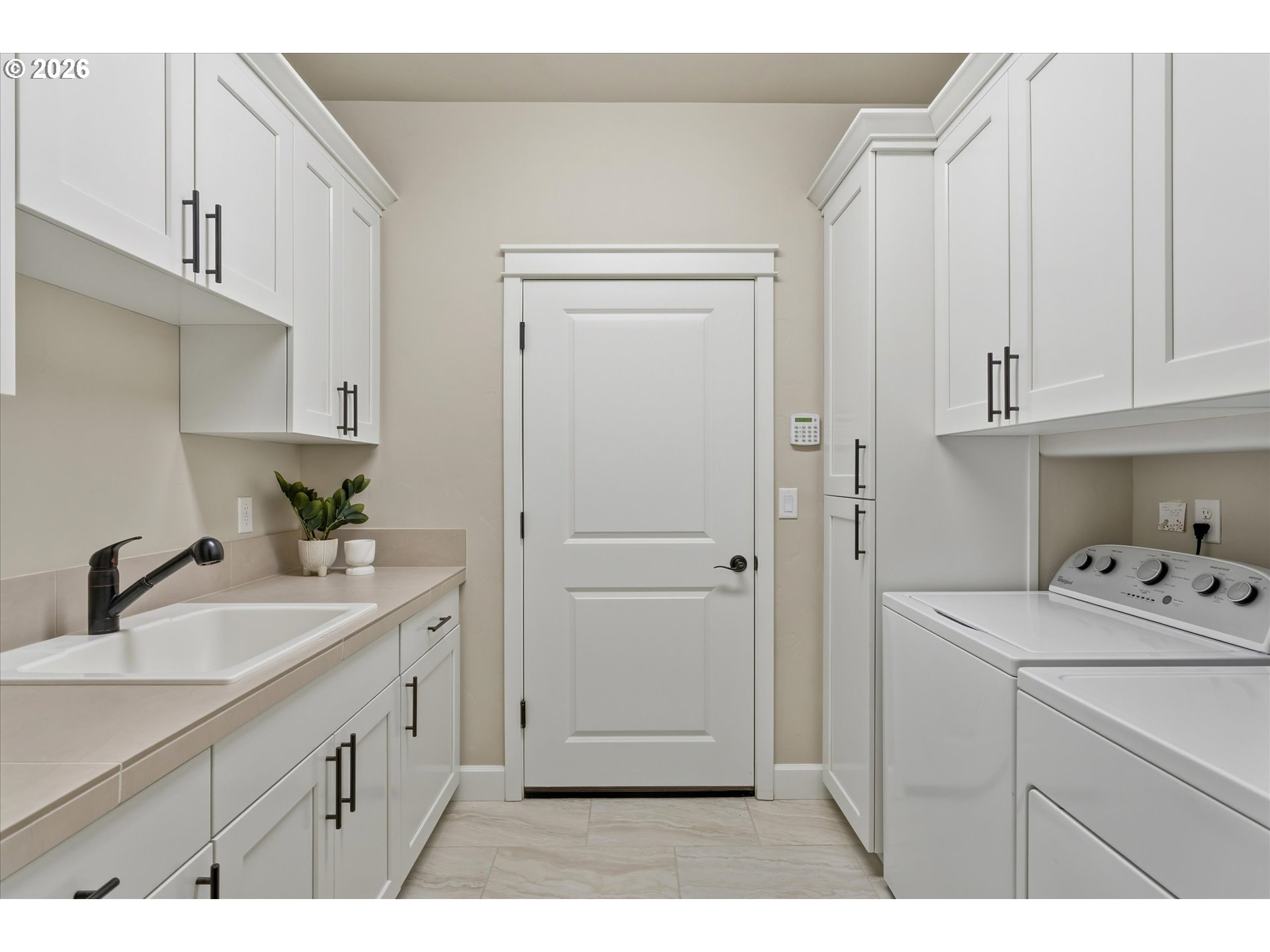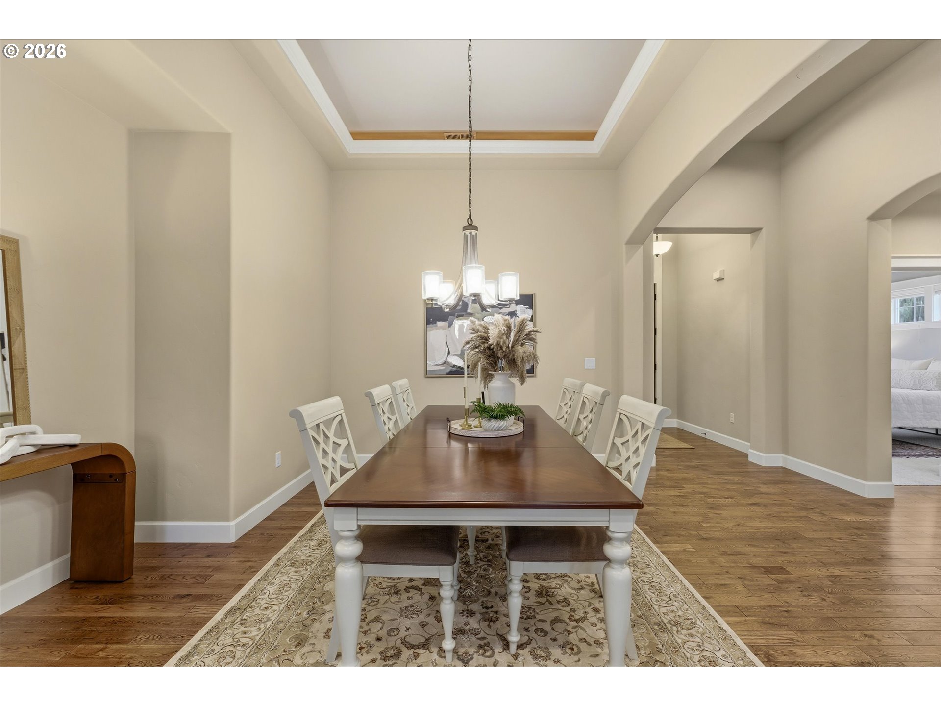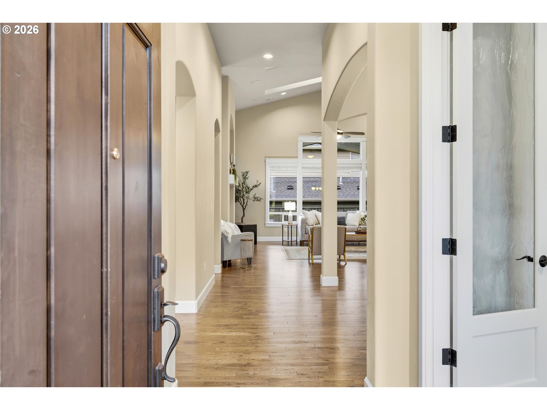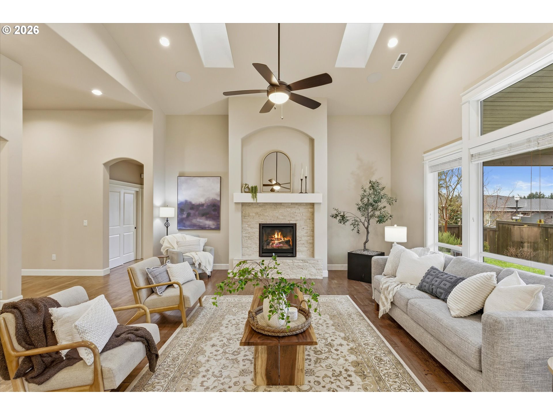 Step into this meticulously maintained single-level home featuring 9-foot ceilings throughout and pride of ownership at every turn. The entry welcomes you with a private office behind glass French doors and a formal dining room highlighted by soaring 12-foot ceilings and elegant inset ceiling details. The heart of the home opens to a vaulted family room with 14-foot ceilings, hardwood floors, a gas fireplace with stone hearth, in-wall speakers, a whole-house sound system, and skylights that flood the space with natural light. The kitchen connects seamlessly to the living area and offers quartz countertops, tile backsplash, a gas cooktop, wall oven and microwave, stainless steel appliances, soft-close cabinetry, and a large buffet providing exceptional storage. Adjacent to the kitchen, the eating nook features a slider leading to the covered patio, fully fenced yard, established landscaping with a sprinkler system, and raised garden beds.The main primary suite is thoughtfully positioned on one side of the home for privacy and features a double inset ceiling, plush carpet, and a walk-in closet with built-ins. The primary bathroom includes a tile walk-in shower, quartz double vanity, and tile flooring. On the opposite side of the home, a second primary bedroom offers a private ensuite bath with a tub/shower combination, ideal for guests or multigenerational living. An additional bedroom and a third full bathroom with a walk-in tile shower complete the home, for a total of three bedrooms and three full bathrooms, including two primary suites. The laundry room includes a utility sink and abundant storage. Additional highlights include a three-car garage, security system, tankless water heater (recently serviced), and a roof that has been recently cleaned.