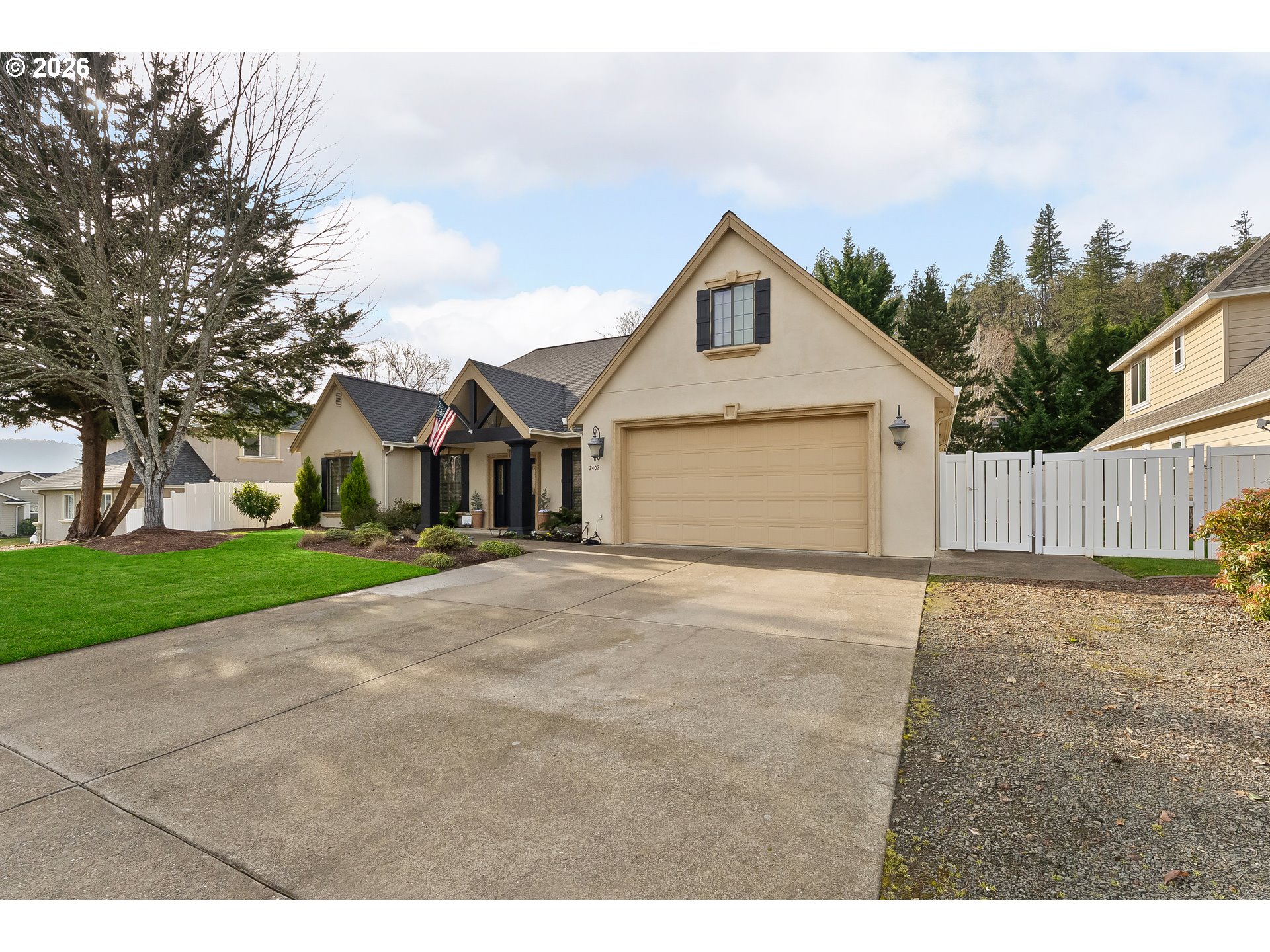 Welcome to 2402 Northwest Canterbury Dr, Roseburg, where luxury meets comfort! This remarkable property boasts three generous bedrooms, including a primary suite with an indulgent jet tub and separate tiled shower, perfect for unwinding after a long day. The versatile office space is ideal for remote work, while the theater room with surround sound invites you to enjoy movie nights at home. A charming den above the garage provides additional space for relaxation or hobbies. Step outside to discover a beautifully landscaped backyard featuring an outdoor gas fireplace, perfect for entertaining and enjoying cozy evenings under the stars. The living room features an electric fireplace, enhancing the home's inviting ambiance. With a small shop in the backyard for extra storage and located in the West hills of Roseburg, this property truly has it all. Don’t miss the opportunity to make this luxurious home your own!