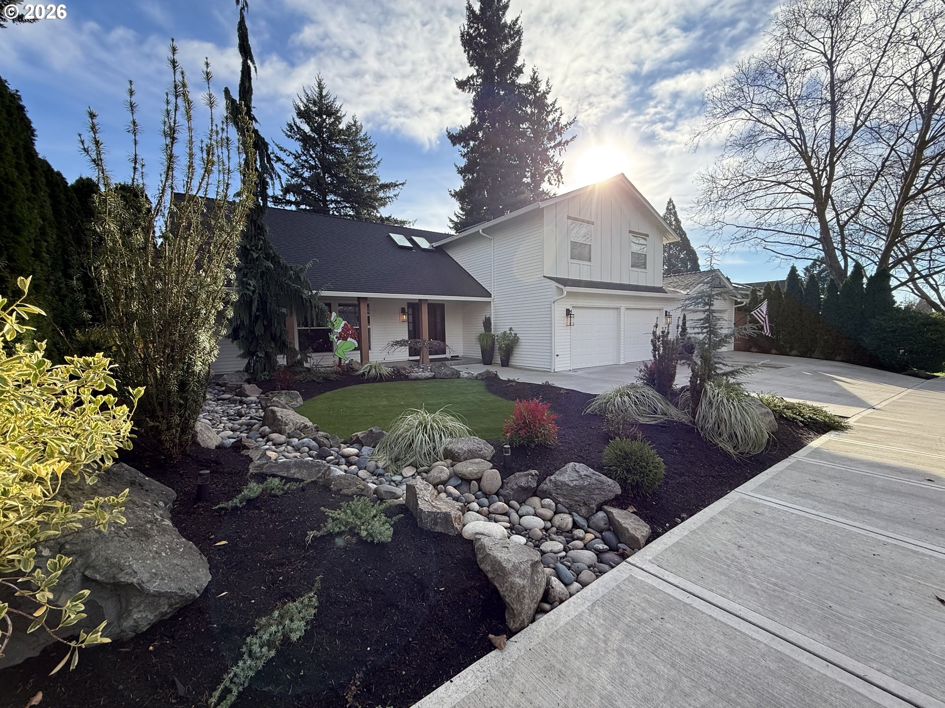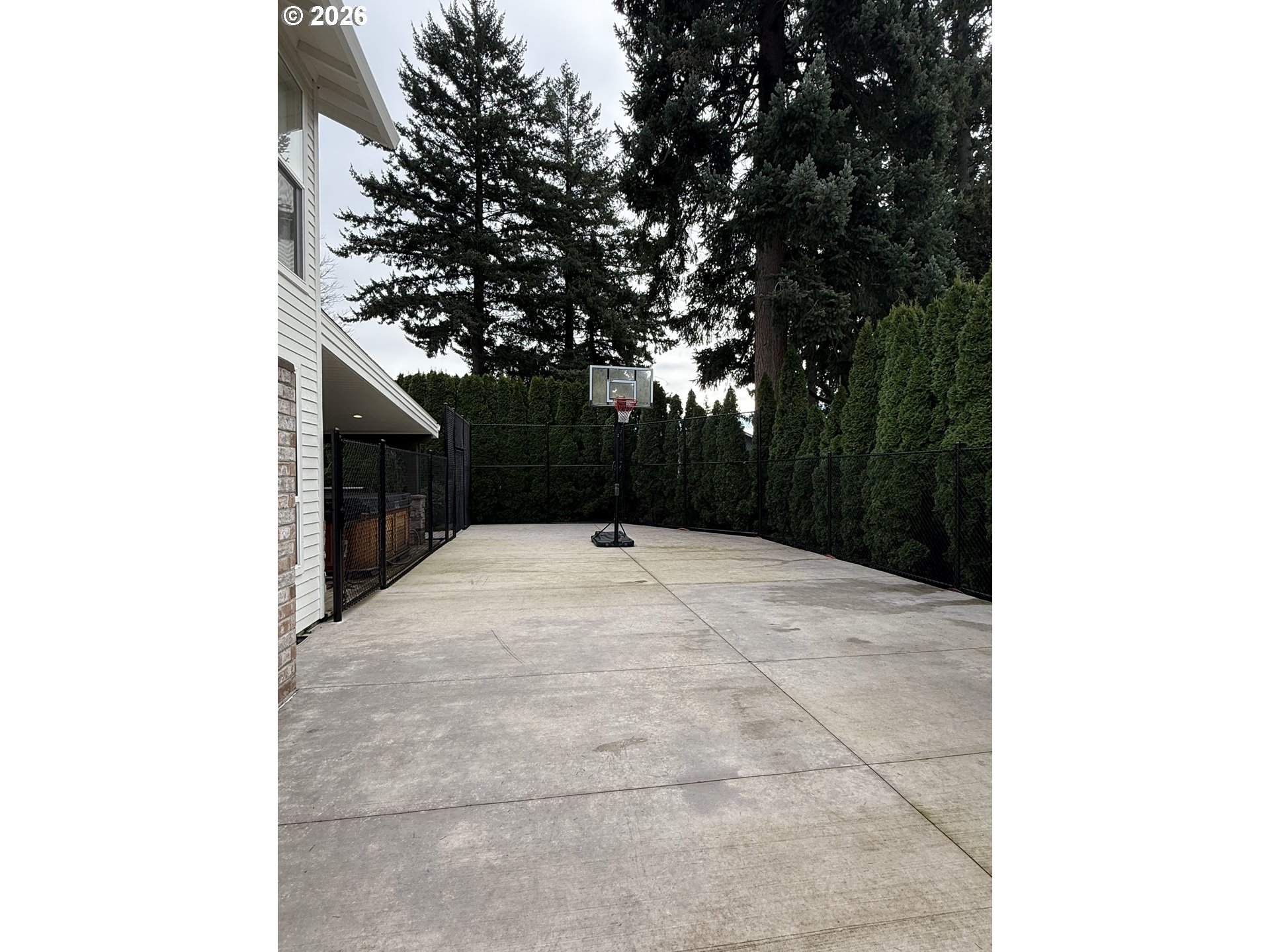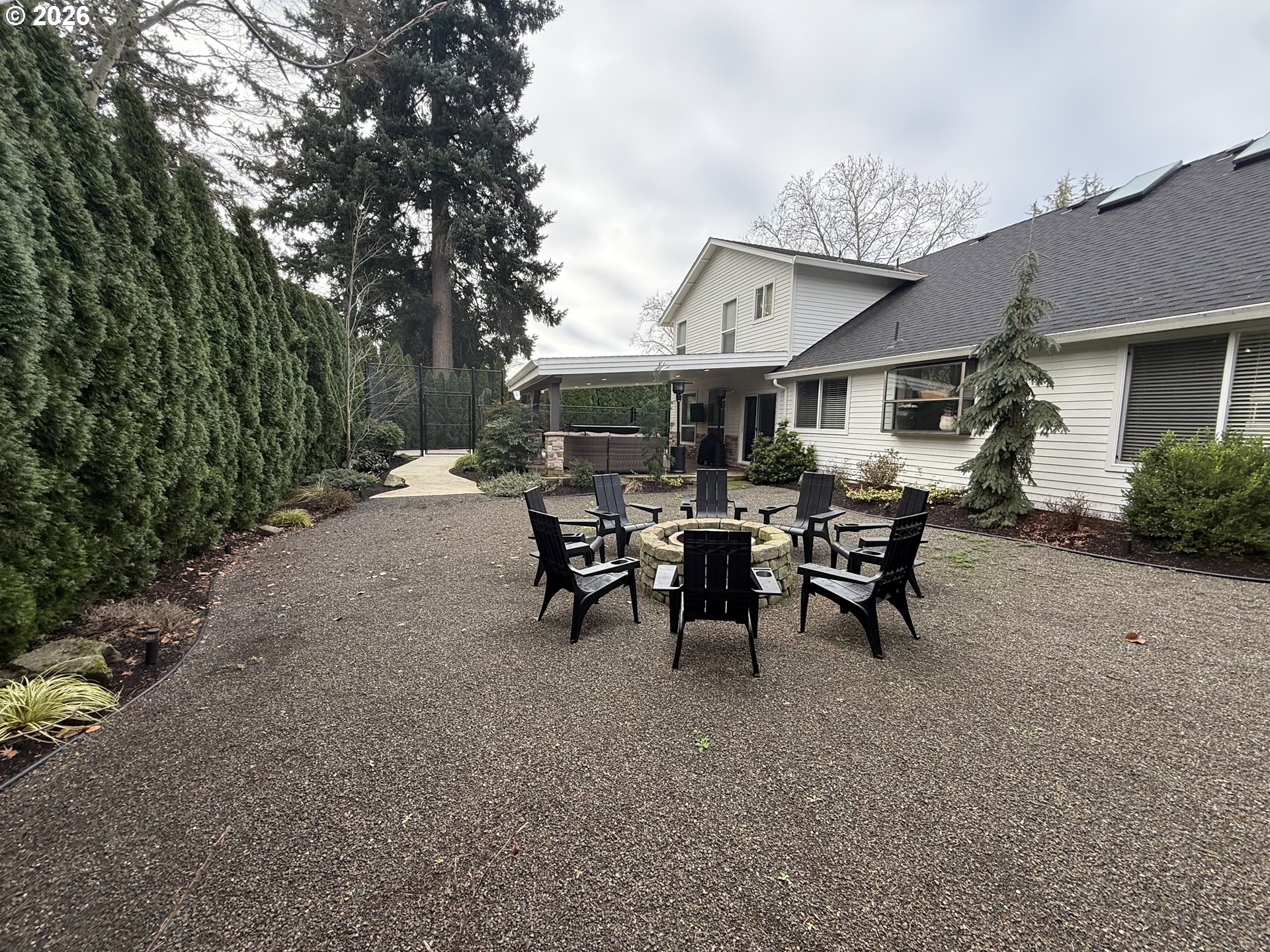 Exceptional curb appeal and standout outdoor living define this 2,958 sq ft two-story home on a private, fully finished quarter-acre lot. A wide 42’ driveway with 36’ approach, high-end professional turf, mature landscaping, low-voltage lighting on timer, and a welcoming covered front porch create an immediate sense of quality and presence. The exterior is further enhanced by new siding, fresh paint, new gutters, and full drip irrigation.Designed for both everyday living and entertaining, the outdoor spaces are exceptional. A 20’ x 25’ covered back deck, accessed by slider off the family room, provides year-round enjoyment and overlooks a professionally hardscaped seating area with a contained fire pit. The entire backyard is thoughtfully framed by 15’ mature arborvitae on drip irrigation, offering rare privacy and a true retreat-like setting.Inside, the main level features a living room, formal dining room, and a kitchen with granite countertops and stainless steel appliances that opens to a spacious family room. A half bath and utility room complete the lower level. Upstairs offers a primary suite with double vanity and walk-in tile shower, three additional bedrooms, a full bath with double vanity, and a large bonus room with walk-in closet. A fully finished four-car garage—configured as two separate two-car spaces—is a rare highlight. The newly added garage functions as a roll-through design with direct access to the 60’ x 24’ sport court enclosed with black chain-link fencing. A 10’ x 6’ storage shed adds convenient outdoor storage.Turn key! Extensive updates include furnace and heat pump (2010), full interior remodel (2012), new roof, skylights, vinyl windows and slider (2019), and major 2024–2025 improvements including garage addition, new driveway and sidewalks, hardscaping, irrigation, professional turf, 400-amp electrical service, new panels, and an 80-gallon commercial-rated hot water tank. dedicated hot tub electric connection.