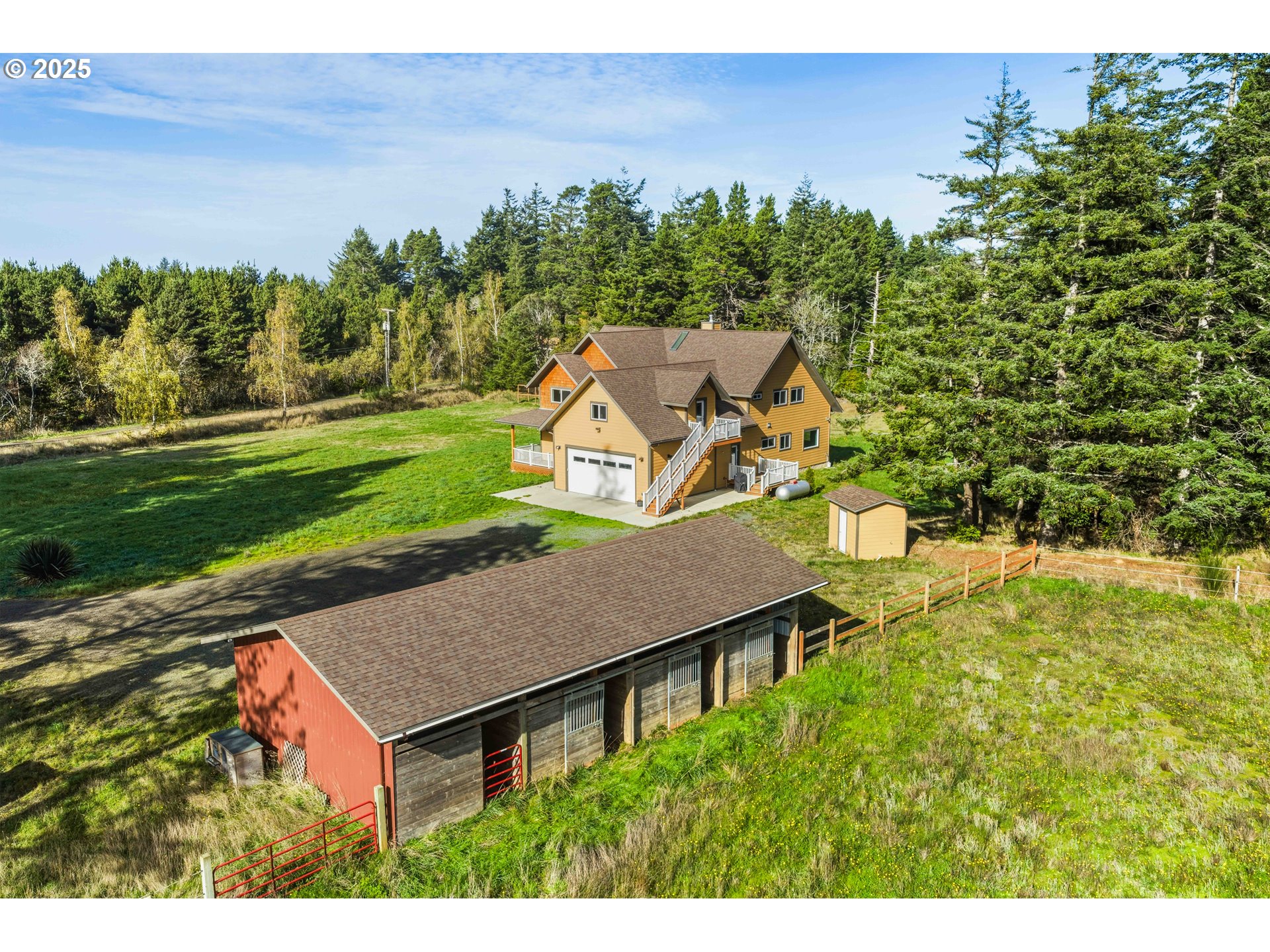 Just North of Bandon, this spacious custom home captures the timeless charm of warm and inviting living. Designed for gathering with five bedrooms, two full baths, and two half baths, the home flows effortlessly from its gourmet kitchen to its light-filled living spaces. A den and a private office tucked off the main-level primary suite gives you plenty of retreat room. Upstairs offers additional bedrooms and generous flex spaces. Set on a beautiful piece of land with pasture, a barn, and a cozy chicken coop, there's room here for everyone - family, friends, animals, and all the dreams you bring with you. A rare blend of coastal serenity and country comfort waits for you!
