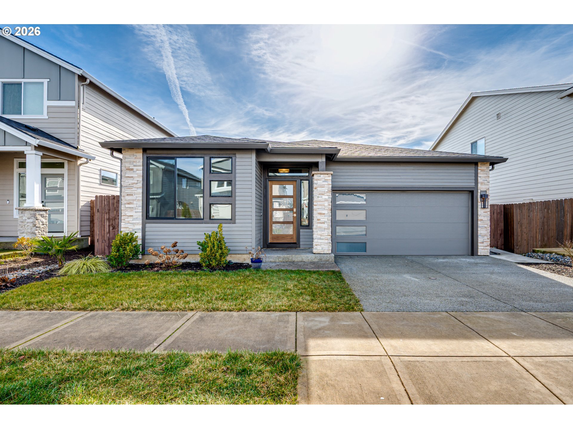 This beautifully designed single-level home blends modern style with everyday comfort in a light-filled, open-concept layout. The heart of the home features a stunning kitchen with quartz countertops, a large island with seating, custom cabinetry, stainless steel appliances, and designer pendant lighting—perfect for entertaining or daily living. The kitchen flows seamlessly into the dining and living areas, highlighted by wide plank flooring, abundant natural light, and a cozy fireplace. The exterior offers timeless curb appeal with stone accents, clean lines, and a welcoming entry, while the low-maintenance yard and fenced space provide room to relax or play. Thoughtfully finished throughout, this home offers style, function, and comfort in one inviting package