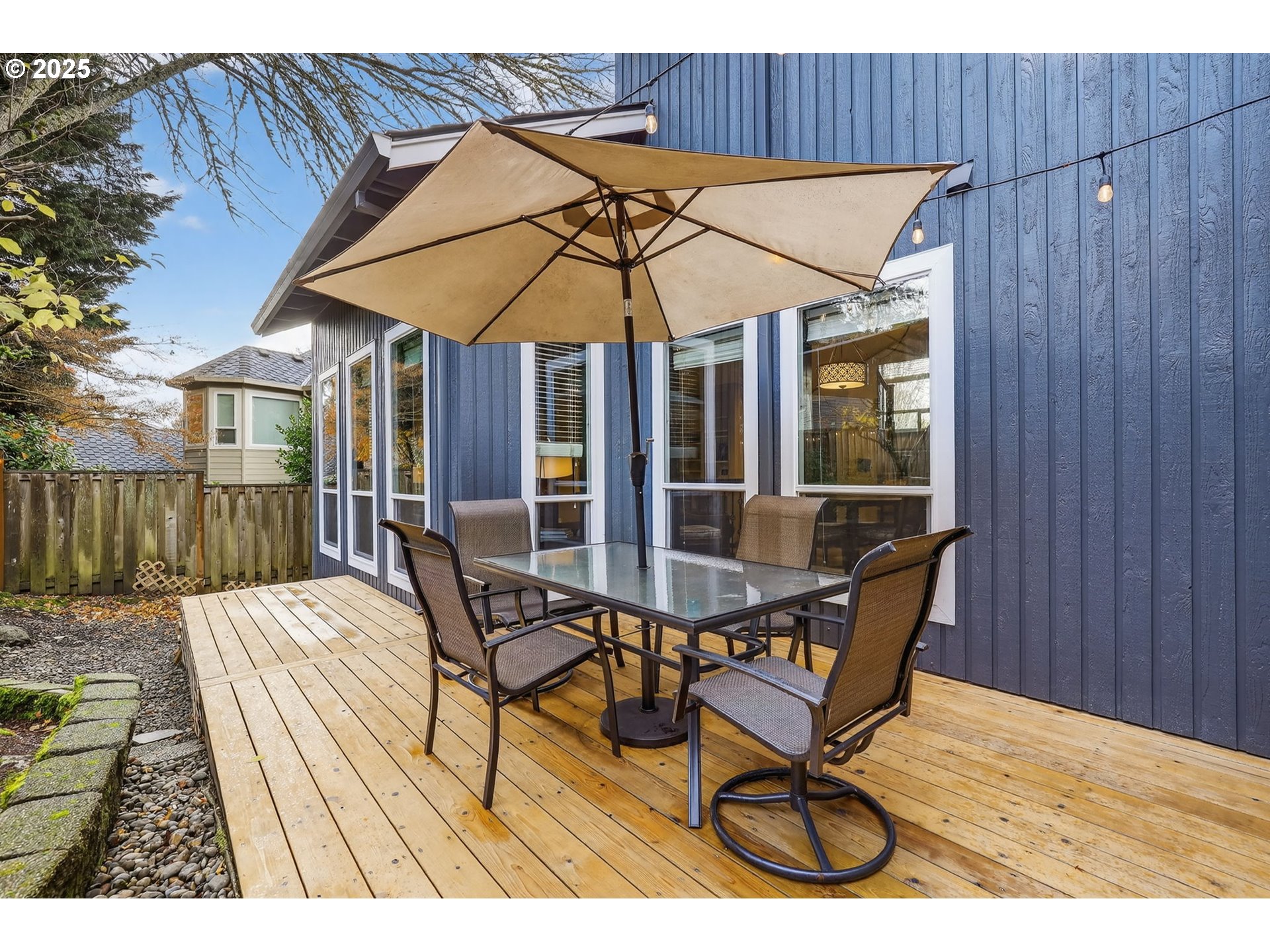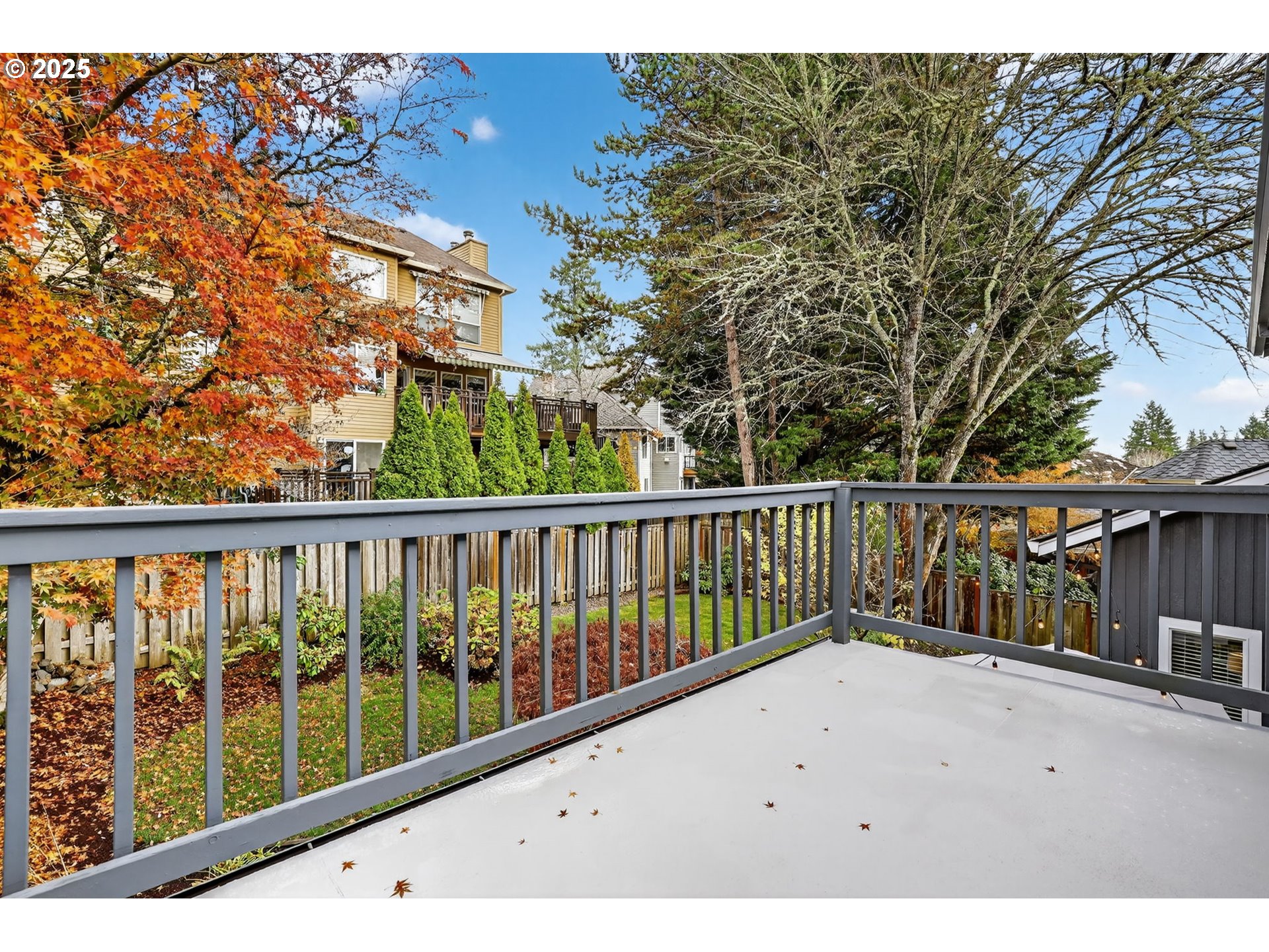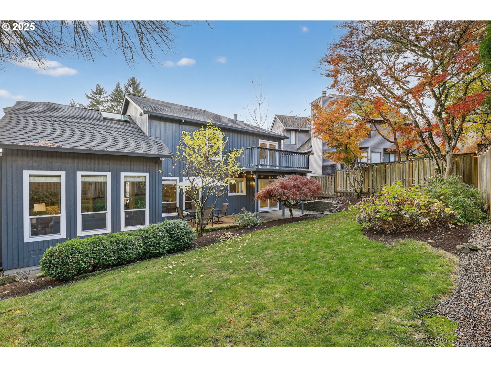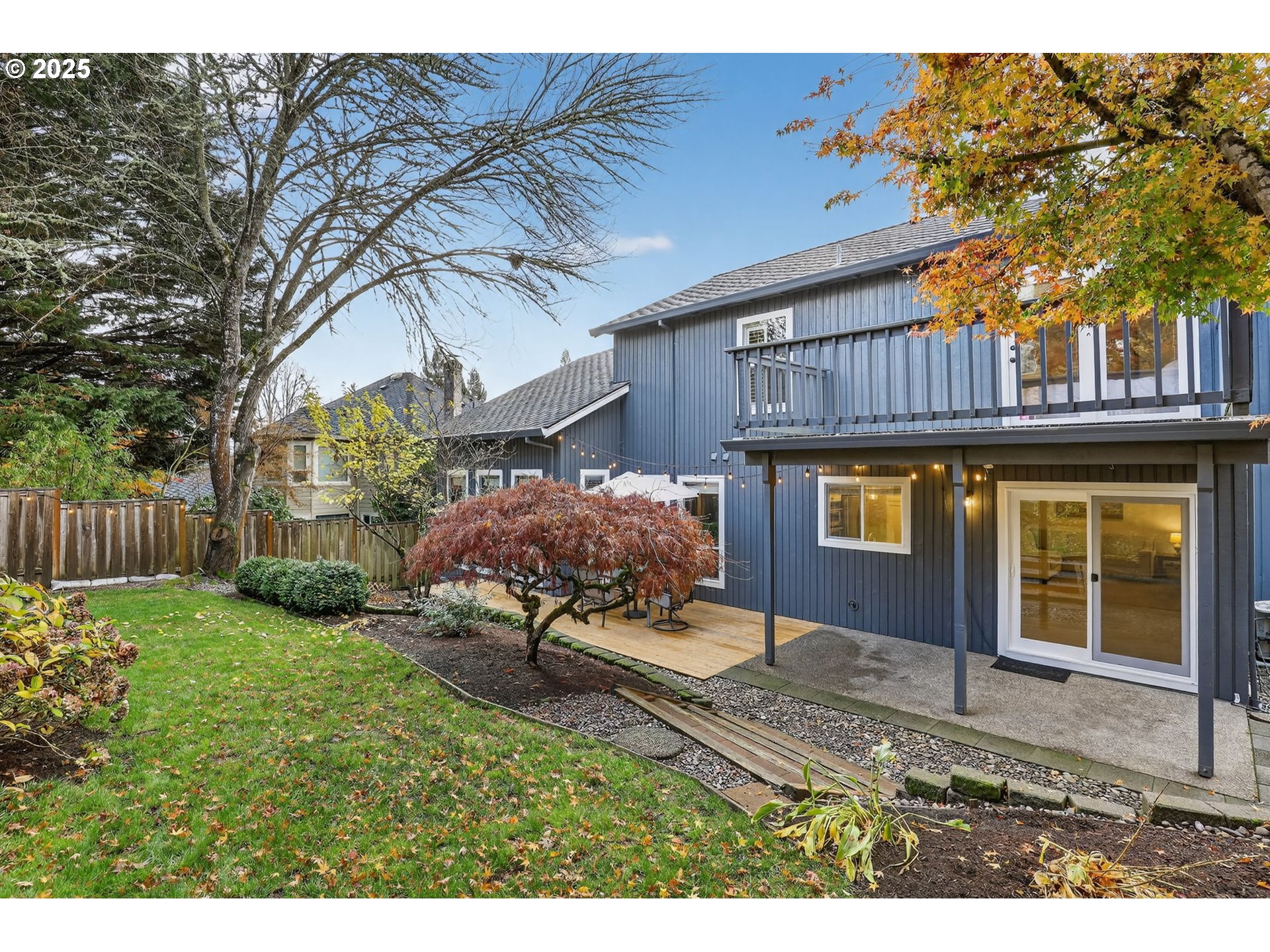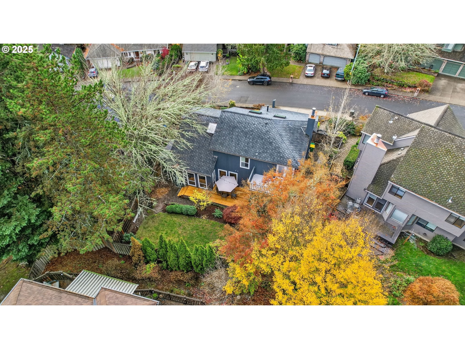 2 Story Beaverton Contemporary! Stunning stone steps lead to a covered front porch overlooking a beautifully landscaped front yard. A lofted entry features hardwood floors, a powder room with Quartz countertops, and coat closet. Hardwood floors flow into an open dining room with floor-to-ceiling windows and a decorative railing to the formal living room with vaulted ceilings, exposed beam, built-ins, and a wall of backyard-facing windows. The freshly remodeled kitchen offers an eat-in island with storage, stainless steel appliances, pantry-style cabinets, Quartz countertops, glass tile backsplash, beverage fridge, and dining nook with sliding door to the backyard oasis. Adjacent family room includes a fireplace, wet bar, and nearby laundry with built-ins. The main floor bedroom option/Den has a window seat, built-in desk, and closet nearby. Upstairs, a lofted landing with skylight leads to a spacious primary retreat with ceiling fan, private deck, and ensuite with dual-sink Quartz vanity, walk-in tile shower, tub with tile surround, built-in storage, and walk-in closet. 2 additional bedrooms up with new paint share a hall bath with skylight and Quartz countertops. Backyard retreat features covered patio, sunny deck, stone walkway, fenced yard, and mature landscaping. All of this near Westside Trail, Thornbrook Nature Area, and Mt. Williams Park. Don't miss this fantastic Mountainside district home!