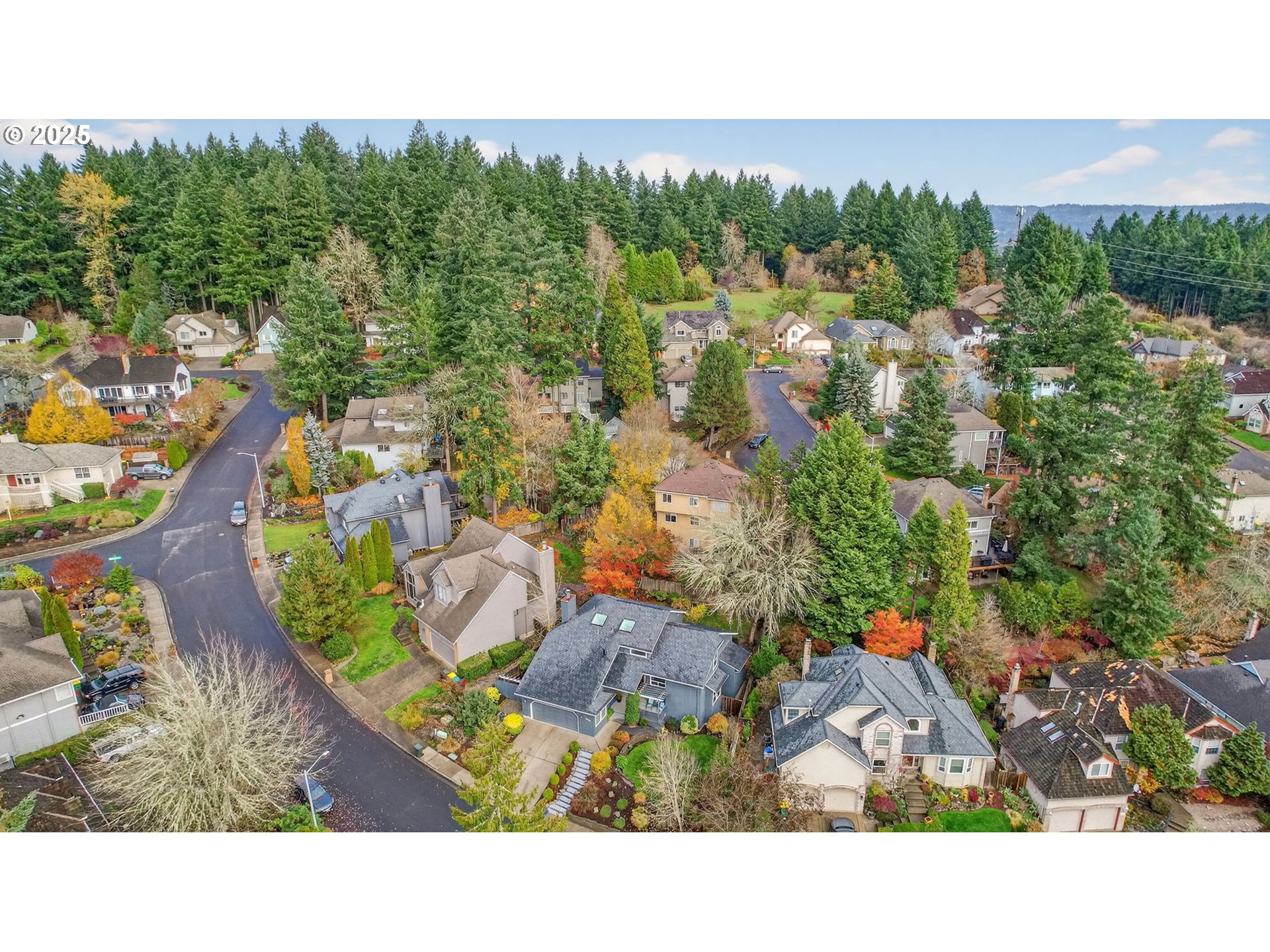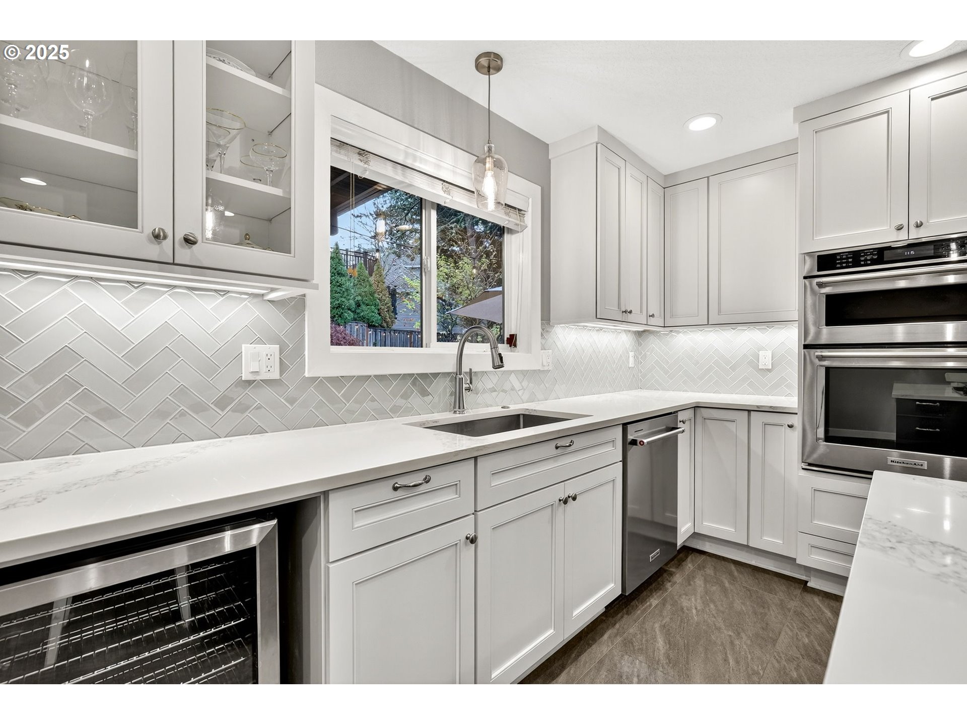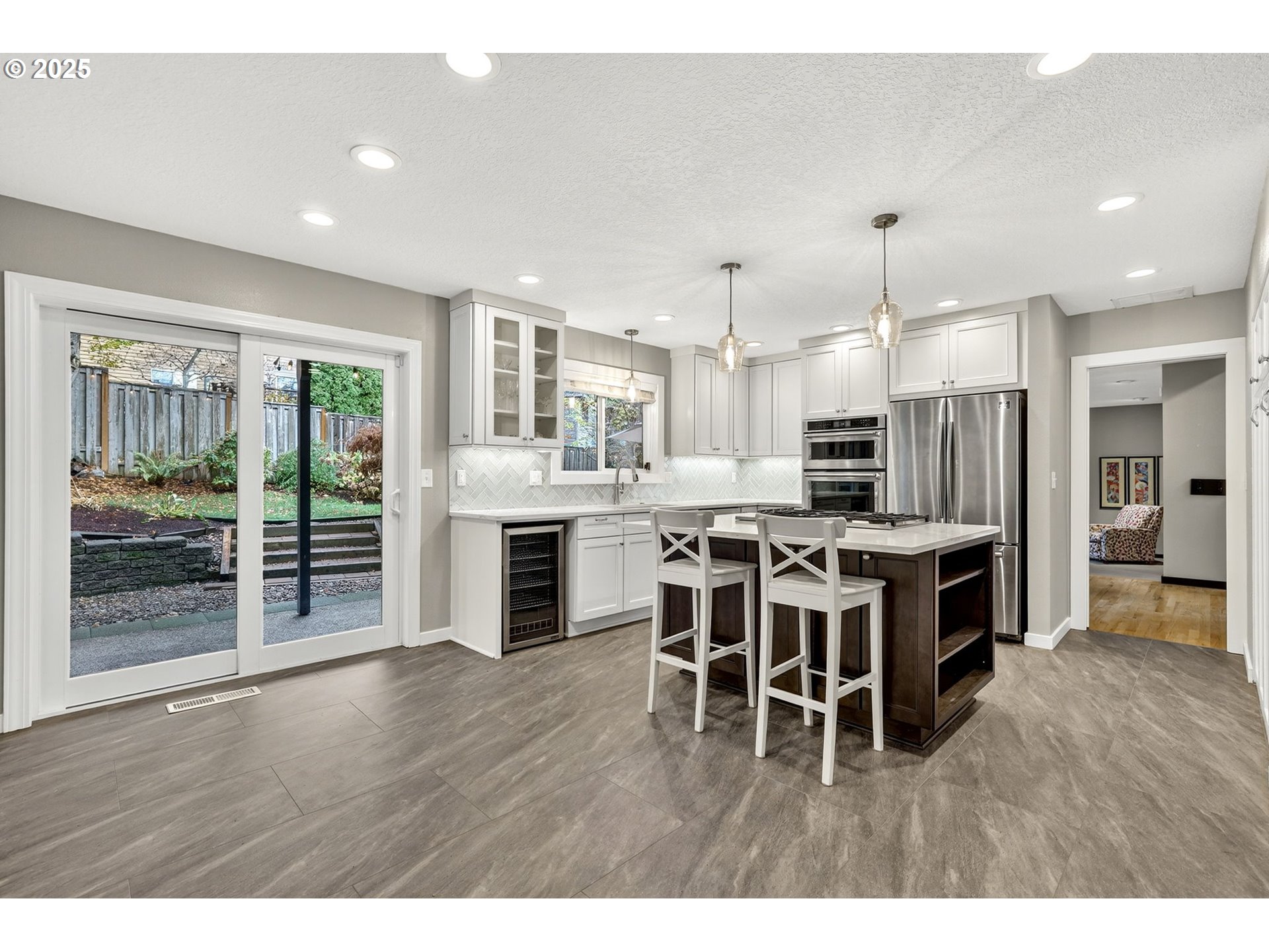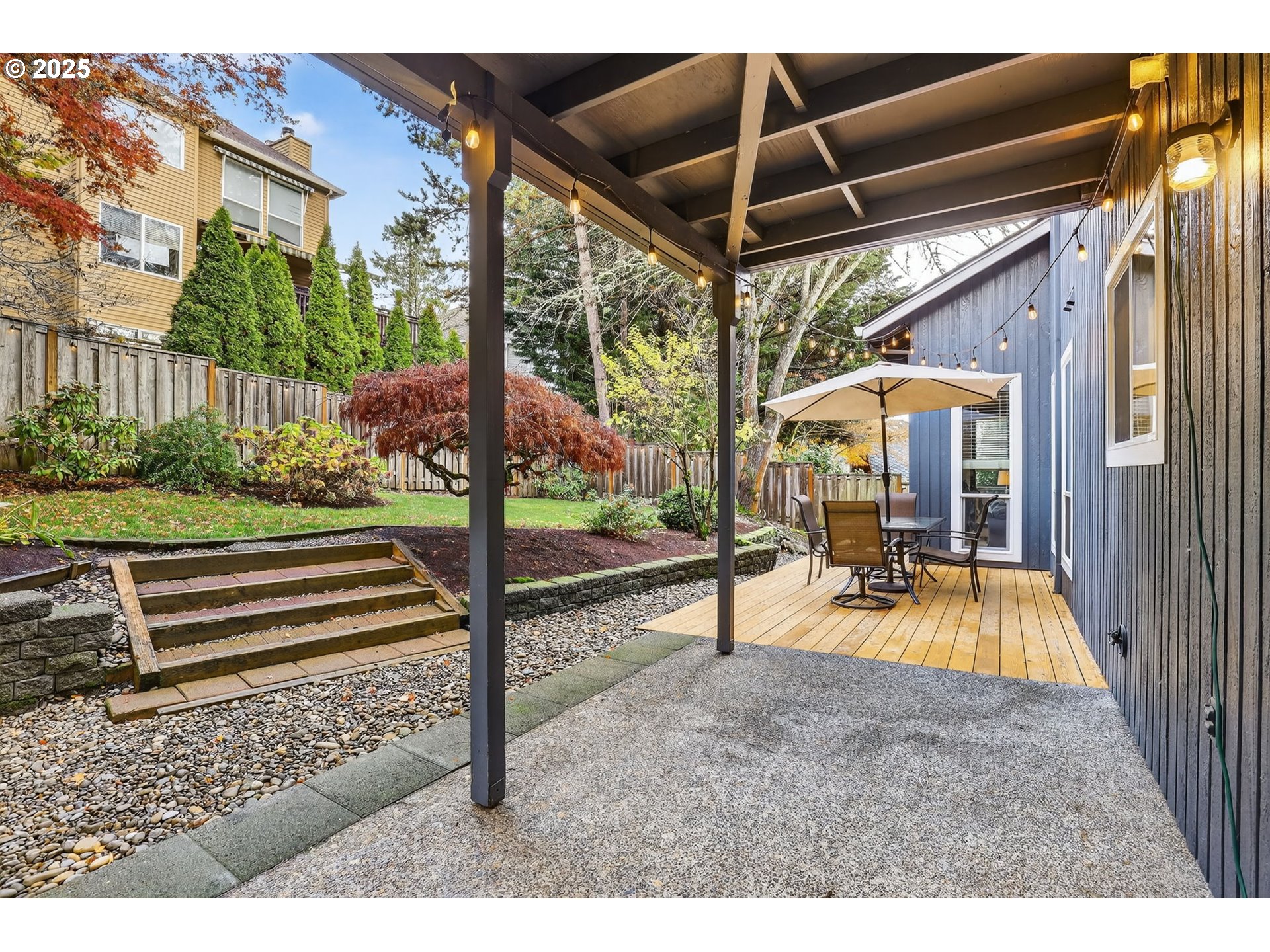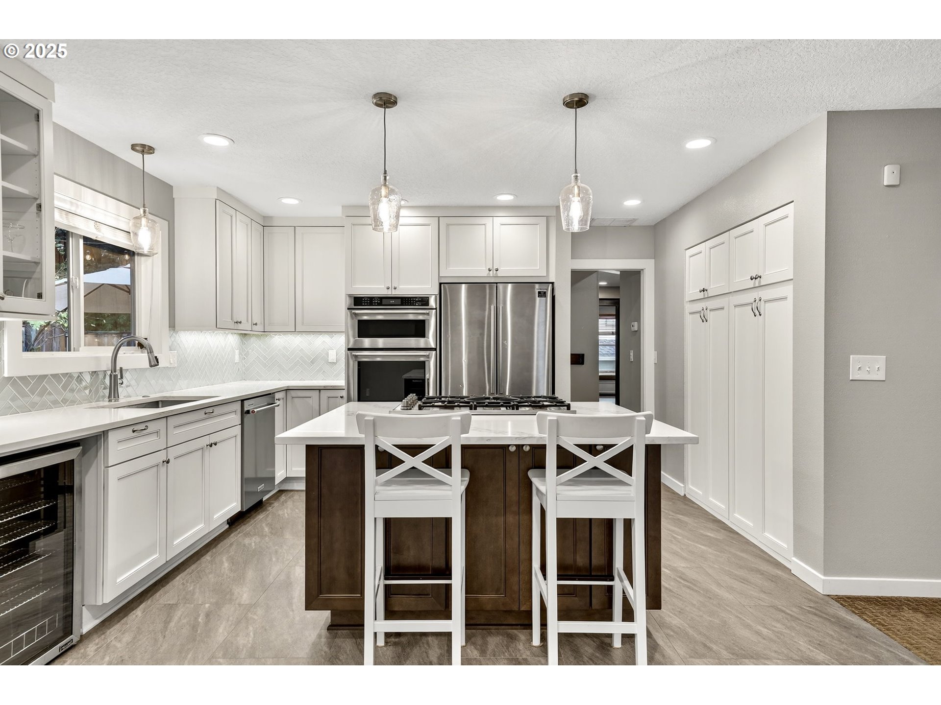 2 Story Beaverton Contemporary! Stunning stone steps lead to a covered front porch overlooking a beautifully landscaped front yard. A lofted entry features hardwood floors, a powder room with Quartz countertops, and coat closet. Hardwood floors flow into an open dining room with floor-to-ceiling windows and a decorative railing to the formal living room with vaulted ceilings, exposed beam, built-ins, and a wall of backyard-facing windows. The freshly remodeled kitchen offers an eat-in island with storage, stainless steel appliances, pantry-style cabinets, Quartz countertops, glass tile backsplash, beverage fridge, and dining nook with sliding door to the backyard oasis. Adjacent family room includes a fireplace, wet bar, and nearby laundry with built-ins. The main floor bedroom option/Den has a window seat, built-in desk, and closet nearby. Upstairs, a lofted landing with skylight leads to a spacious primary retreat with ceiling fan, private deck, and ensuite with dual-sink Quartz vanity, walk-in tile shower, tub with tile surround, built-in storage, and walk-in closet. 2 additional bedrooms up with new paint share a hall bath with skylight and Quartz countertops. Backyard retreat features covered patio, sunny deck, stone walkway, fenced yard, and mature landscaping. All of this near Westside Trail, Thornbrook Nature Area, and Mt. Williams Park. Don't miss this fantastic Mountainside district home!