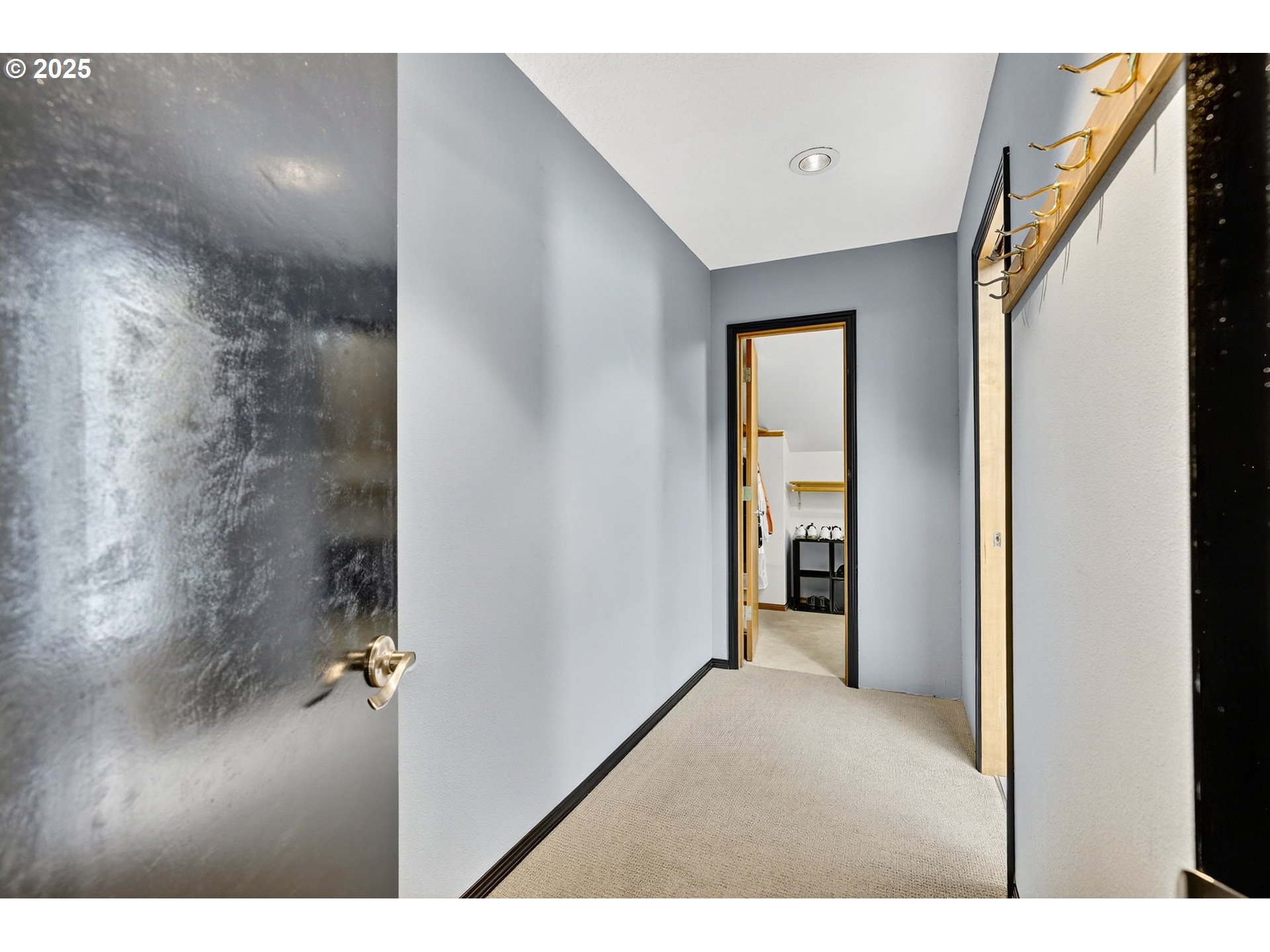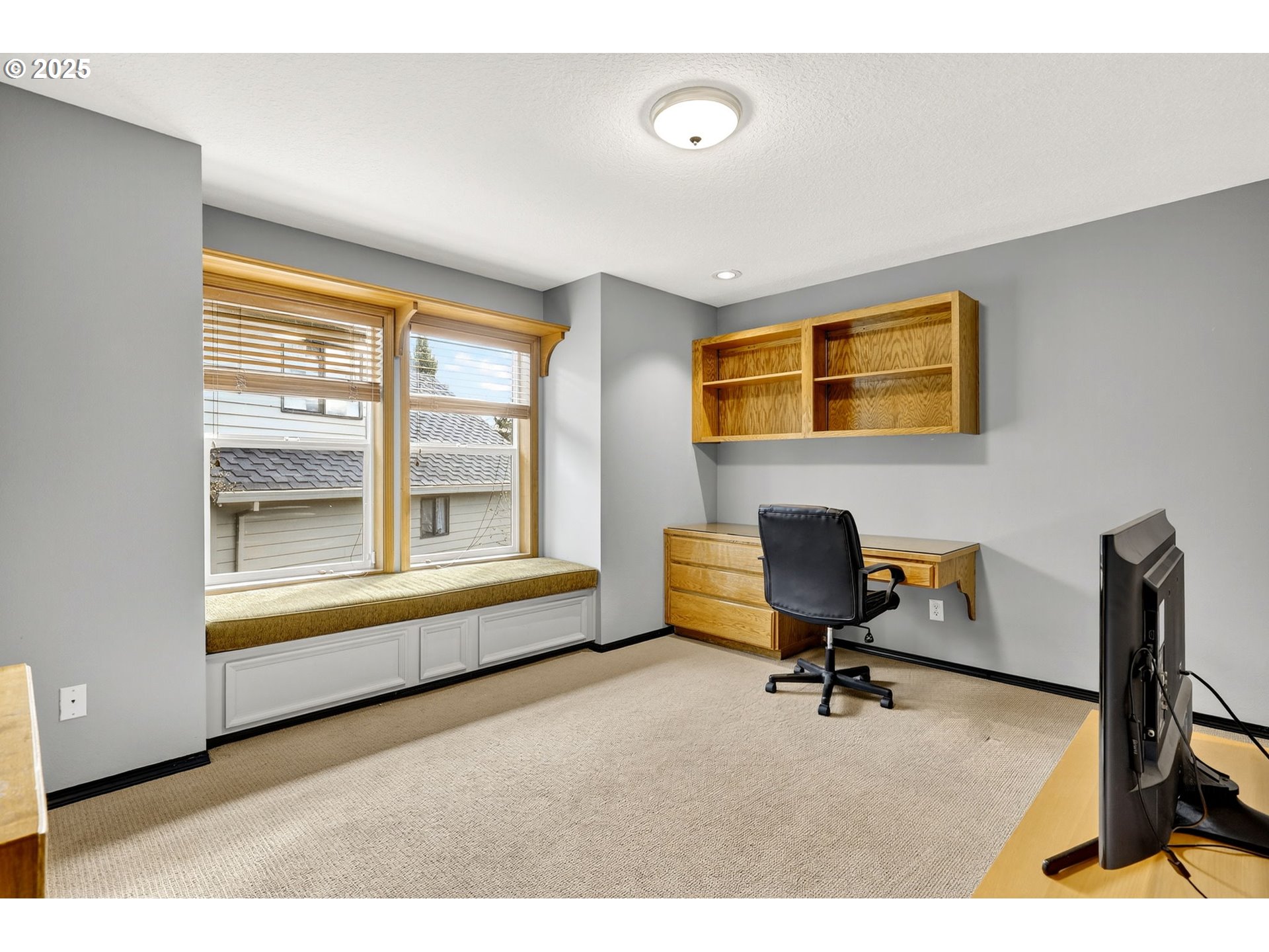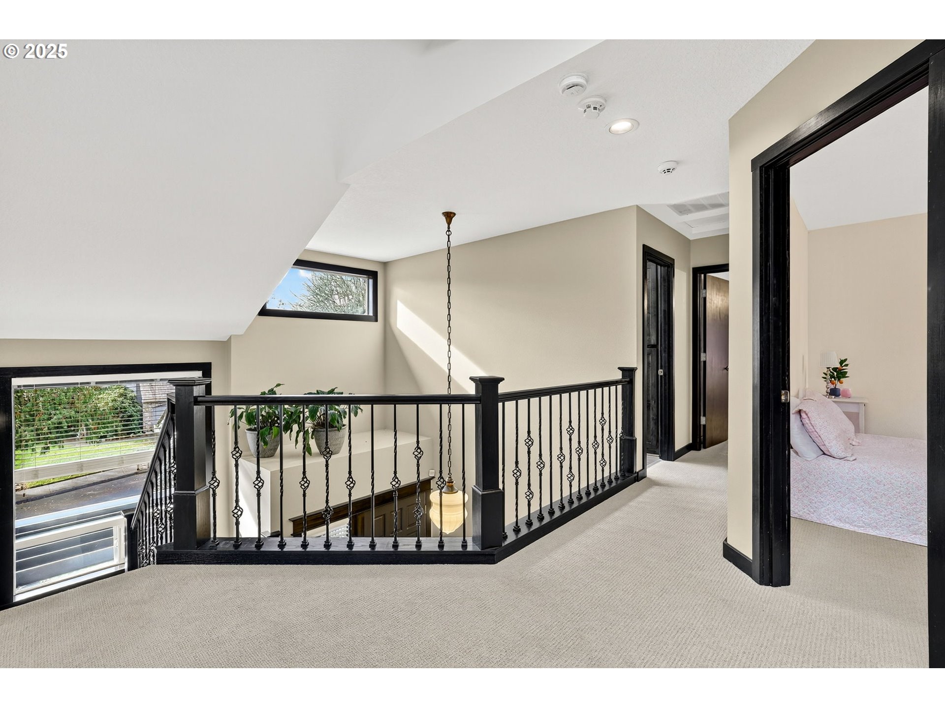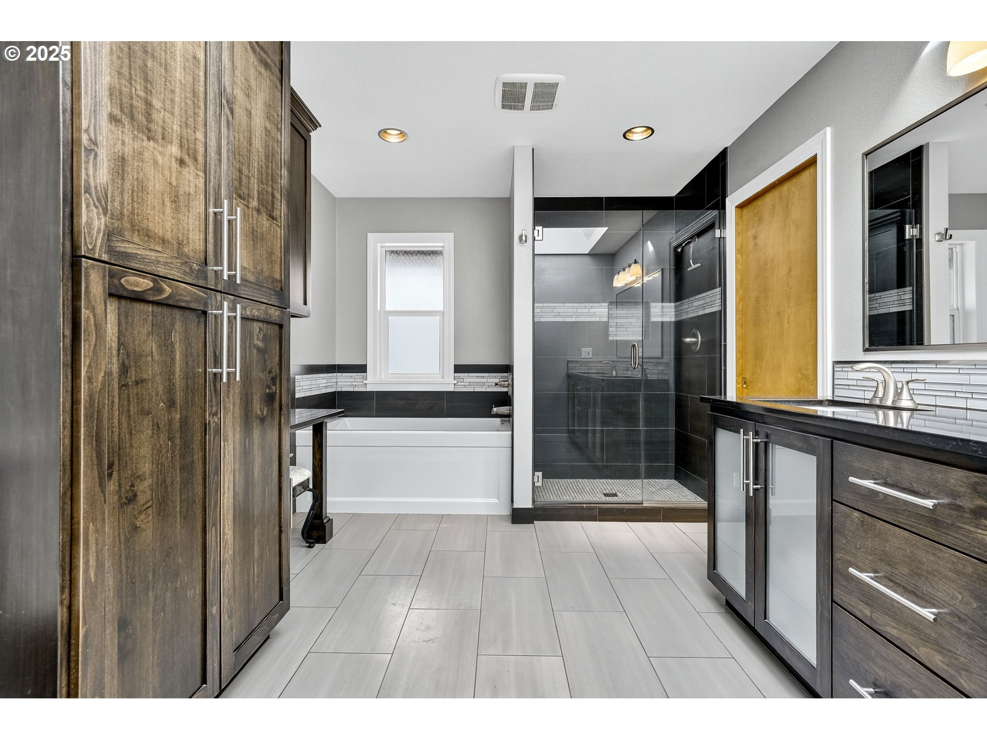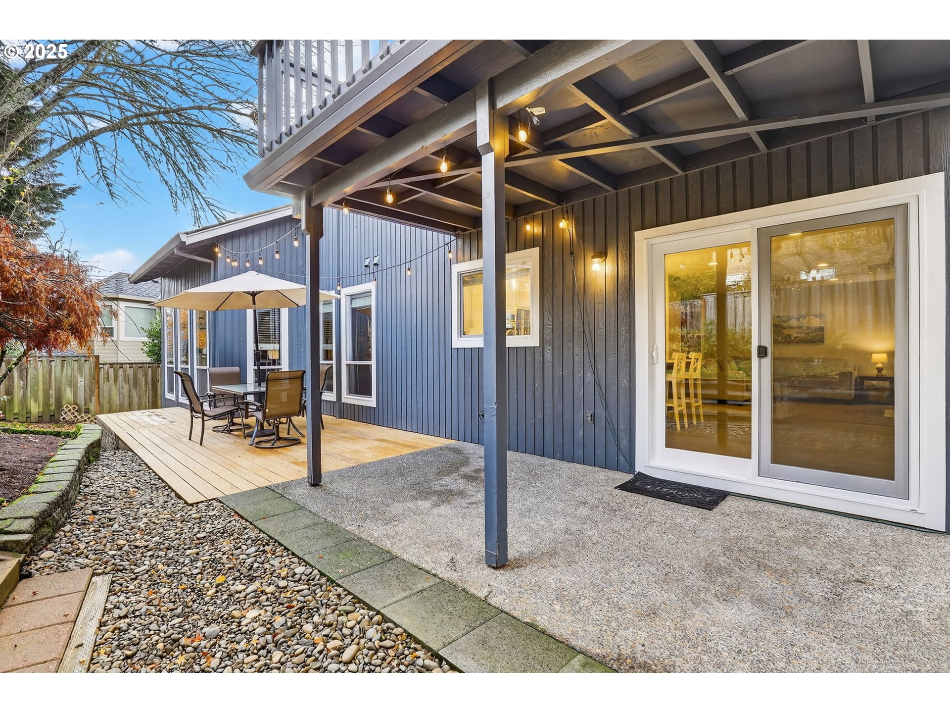 2 Story Beaverton Contemporary! Stunning stone steps lead to a covered front porch overlooking a beautifully landscaped front yard. A lofted entry features hardwood floors, a powder room with Quartz countertops, and coat closet. Hardwood floors flow into an open dining room with floor-to-ceiling windows and a decorative railing to the formal living room with vaulted ceilings, exposed beam, built-ins, and a wall of backyard-facing windows. The freshly remodeled kitchen offers an eat-in island with storage, stainless steel appliances, pantry-style cabinets, Quartz countertops, glass tile backsplash, beverage fridge, and dining nook with sliding door to the backyard oasis. Adjacent family room includes a fireplace, wet bar, and nearby laundry with built-ins. The main floor bedroom option/Den has a window seat, built-in desk, and closet nearby. Upstairs, a lofted landing with skylight leads to a spacious primary retreat with ceiling fan, private deck, and ensuite with dual-sink Quartz vanity, walk-in tile shower, tub with tile surround, built-in storage, and walk-in closet. 2 additional bedrooms up with new paint share a hall bath with skylight and Quartz countertops. Backyard retreat features covered patio, sunny deck, stone walkway, fenced yard, and mature landscaping. All of this near Westside Trail, Thornbrook Nature Area, and Mt. Williams Park. Don't miss this fantastic Mountainside district home!