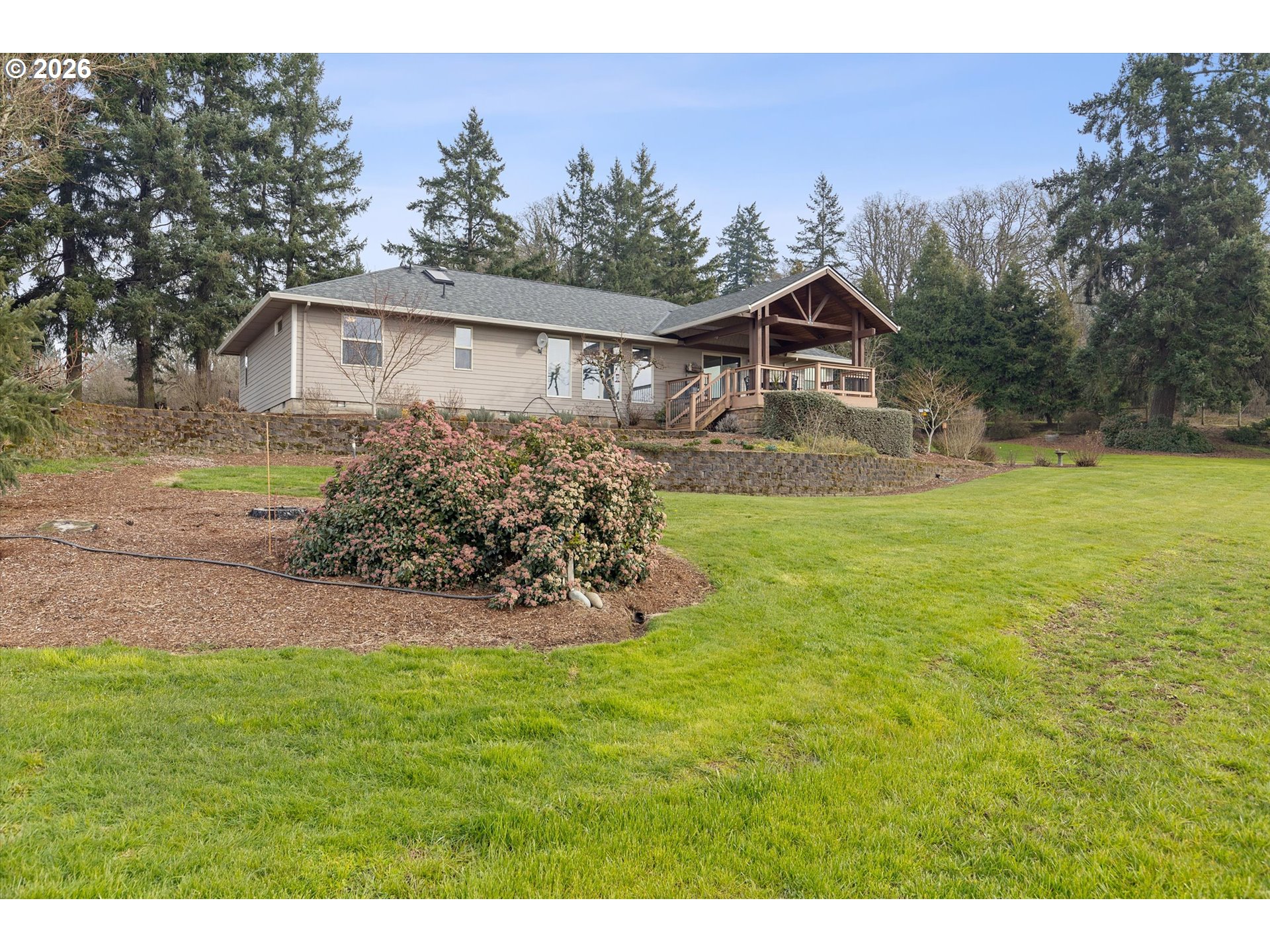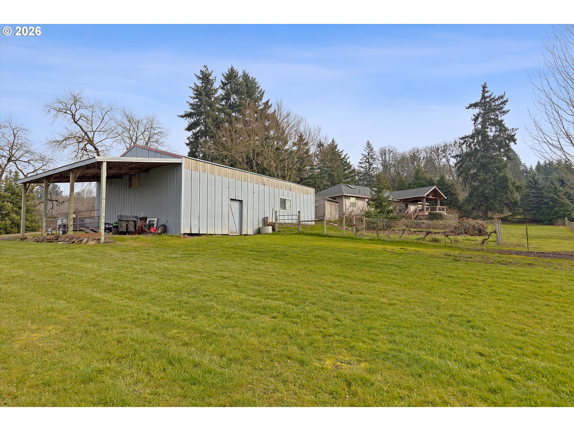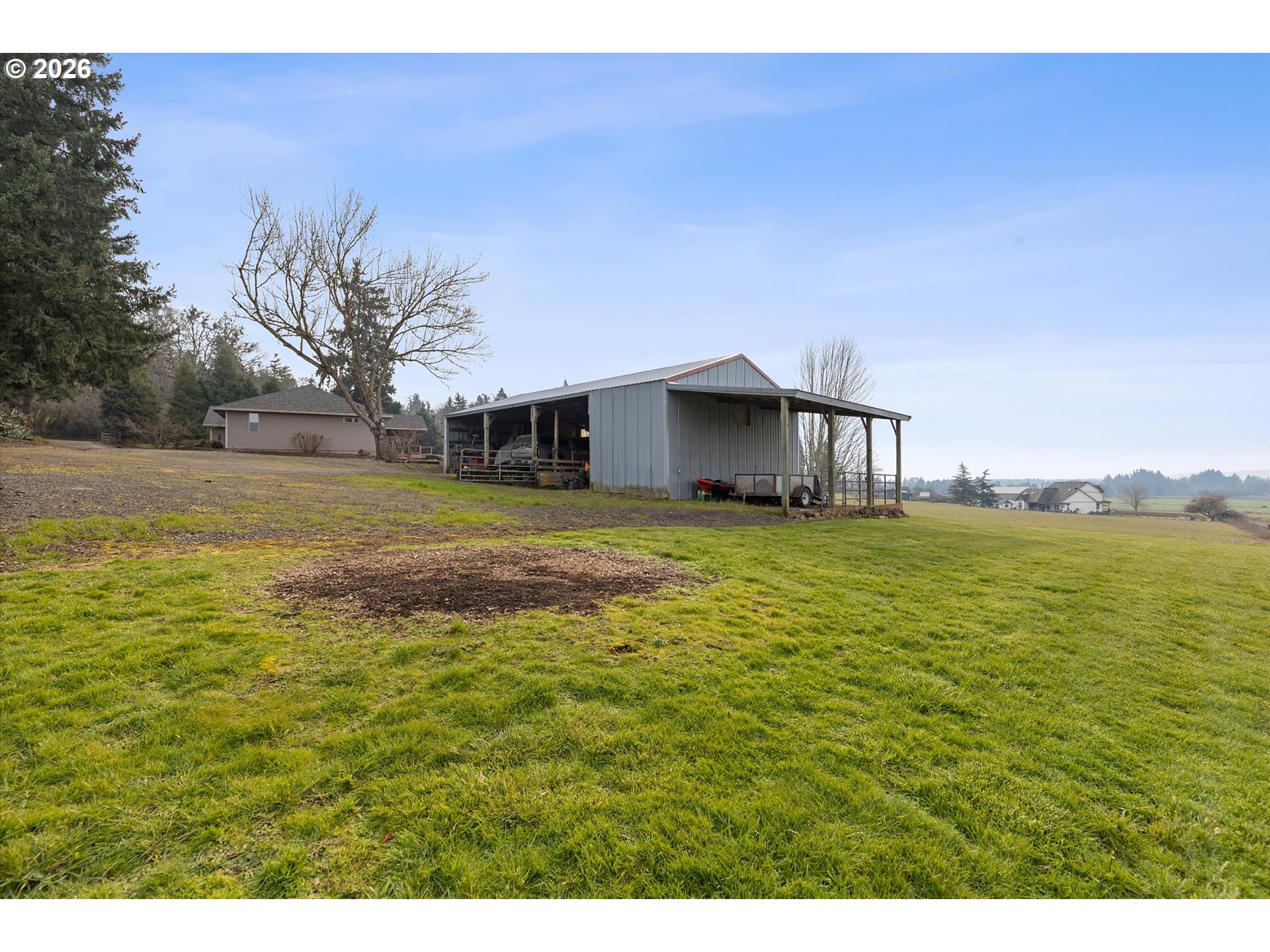 This charming single-level retreat sits on 5 acres of picturesque land in a setting complete with coast range sunsets! Welcome to this stunning home with open living spaces that seamlessly flow between the kitchen featuring stainless steel appliances and abundant counter space, the dining area, and the living room/sitting area with built-ins. This well-designed home offers a modern and spacious layout, perfect for entertaining and everyday living.The spacious en suite comes with a beautiful walk-in closet and well appointed bathroom. The garage has an abundance of storage and leads to a laundry room / mudroom with washer and dryer. An inviting covered deck area provides a contemplative view rain or shine and is perfect for entertaining in warmer months. Outside, you will also discover a spacious 48’ x 30’ open shop space with two bays to work or park your vehicles as well as two horse stalls and a tack room with an attached 14’ x 30’ covered space which will accommodate plenty of storage for your tractor, quad, or anything else you can imagine. The home includes a well system which is supported by a 1500 gallon storage tank to ensure an ample supply year-round. Ideally located near Newberg, Dayton, and McMinnville, this property offers both tranquility and convenience in a sought-after area.