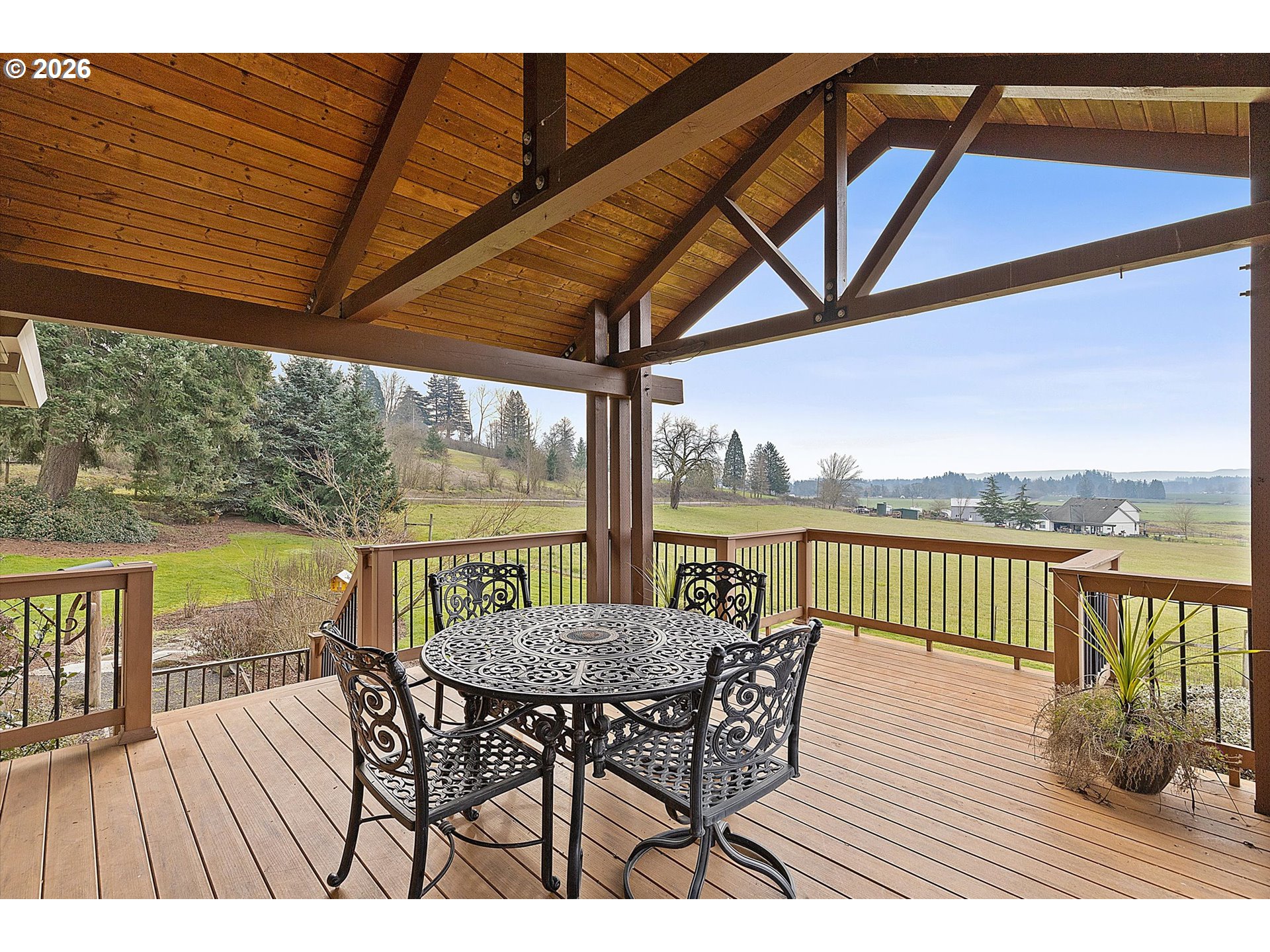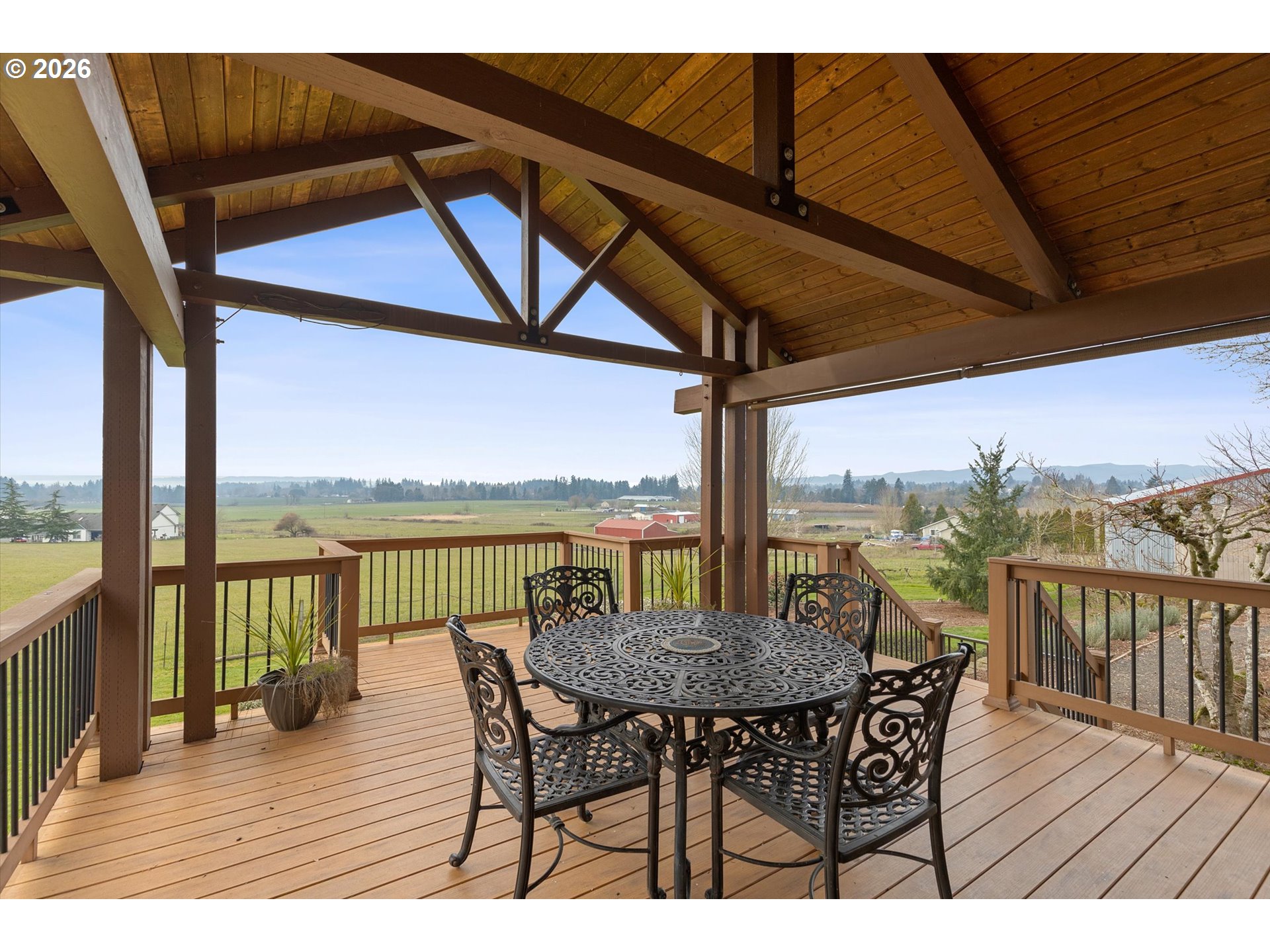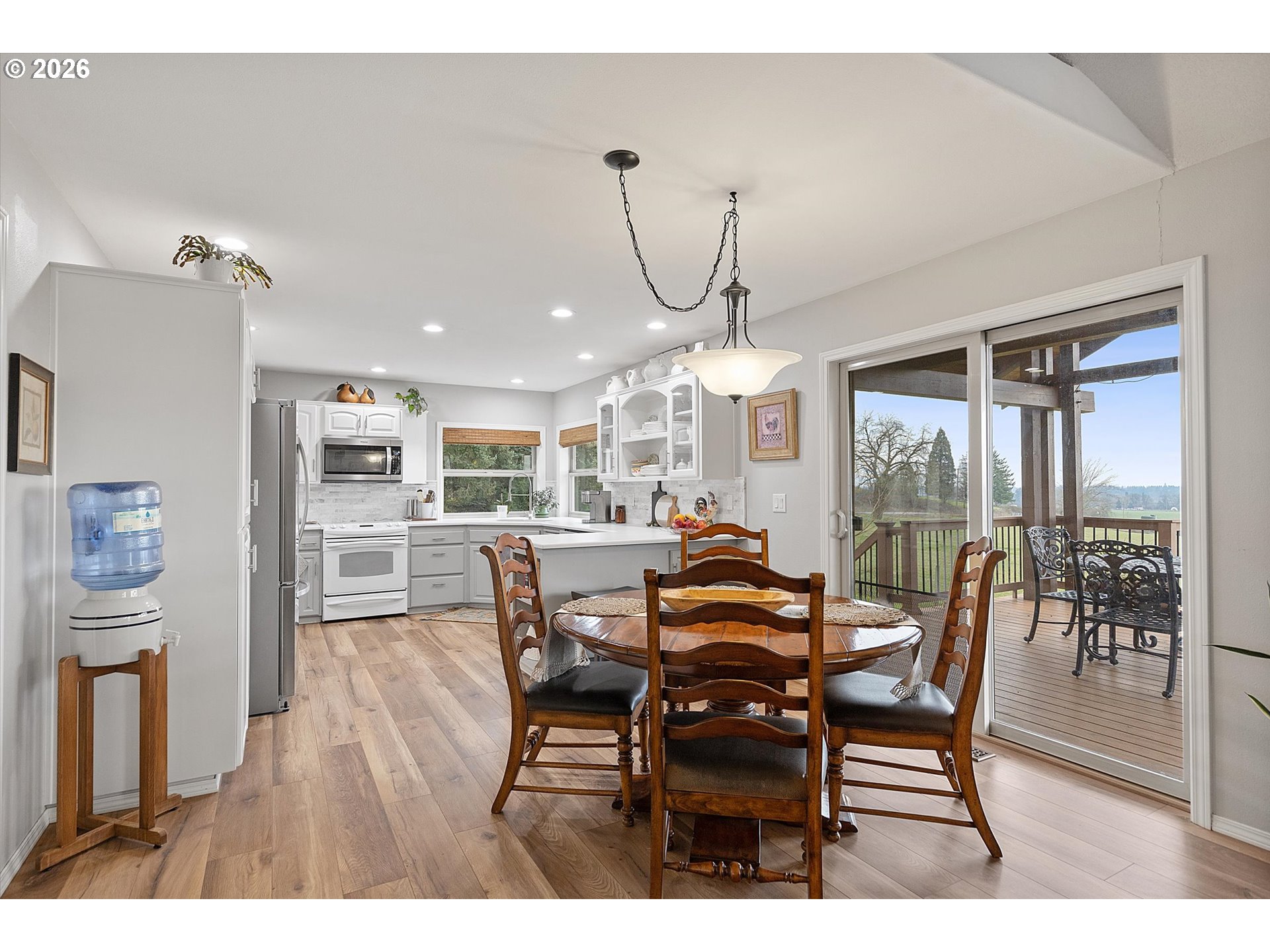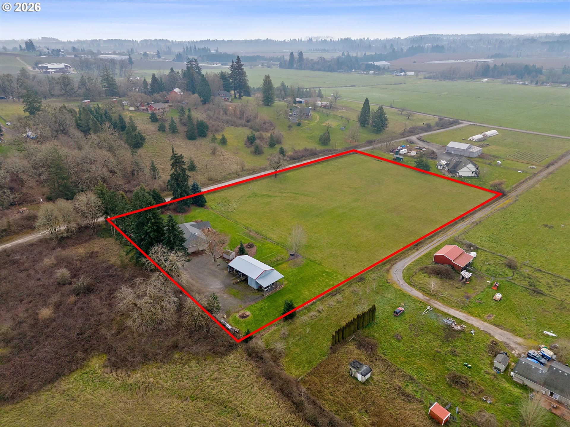 This charming single-level retreat sits on 5 acres of picturesque land in a setting complete with coast range sunsets! Welcome to this stunning home with open living spaces that seamlessly flow between the kitchen featuring stainless steel appliances and abundant counter space, the dining area, and the living room/sitting area with built-ins. This well-designed home offers a modern and spacious layout, perfect for entertaining and everyday living.The spacious en suite comes with a beautiful walk-in closet and well appointed bathroom. The garage has an abundance of storage and leads to a laundry room / mudroom with washer and dryer. An inviting covered deck area provides a contemplative view rain or shine and is perfect for entertaining in warmer months. Outside, you will also discover a spacious 48’ x 30’ open shop space with two bays to work or park your vehicles as well as two horse stalls and a tack room with an attached 14’ x 30’ covered space which will accommodate plenty of storage for your tractor, quad, or anything else you can imagine. The home includes a well system which is supported by a 1500 gallon storage tank to ensure an ample supply year-round. Ideally located near Newberg, Dayton, and McMinnville, this property offers both tranquility and convenience in a sought-after area.