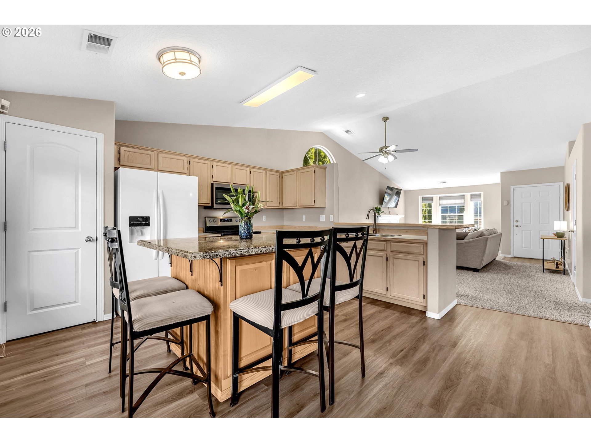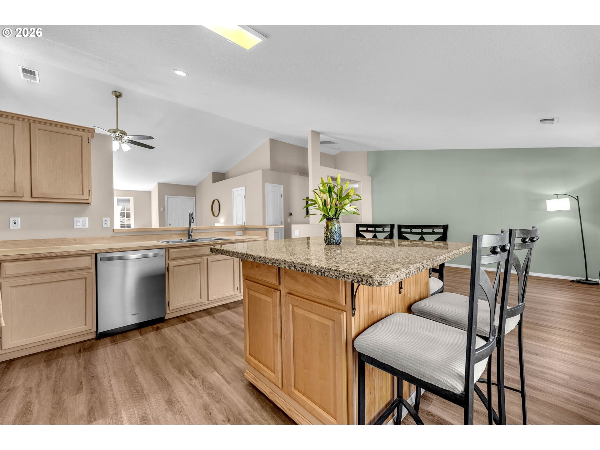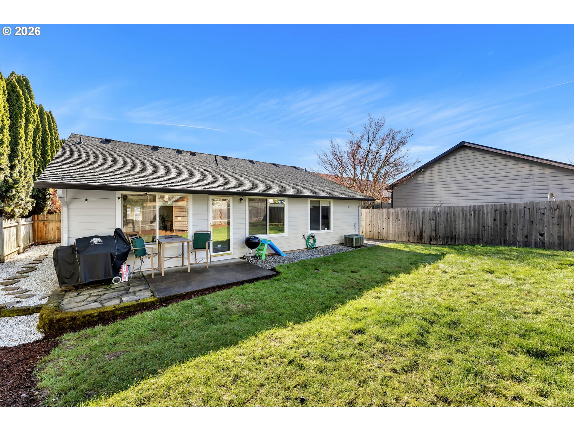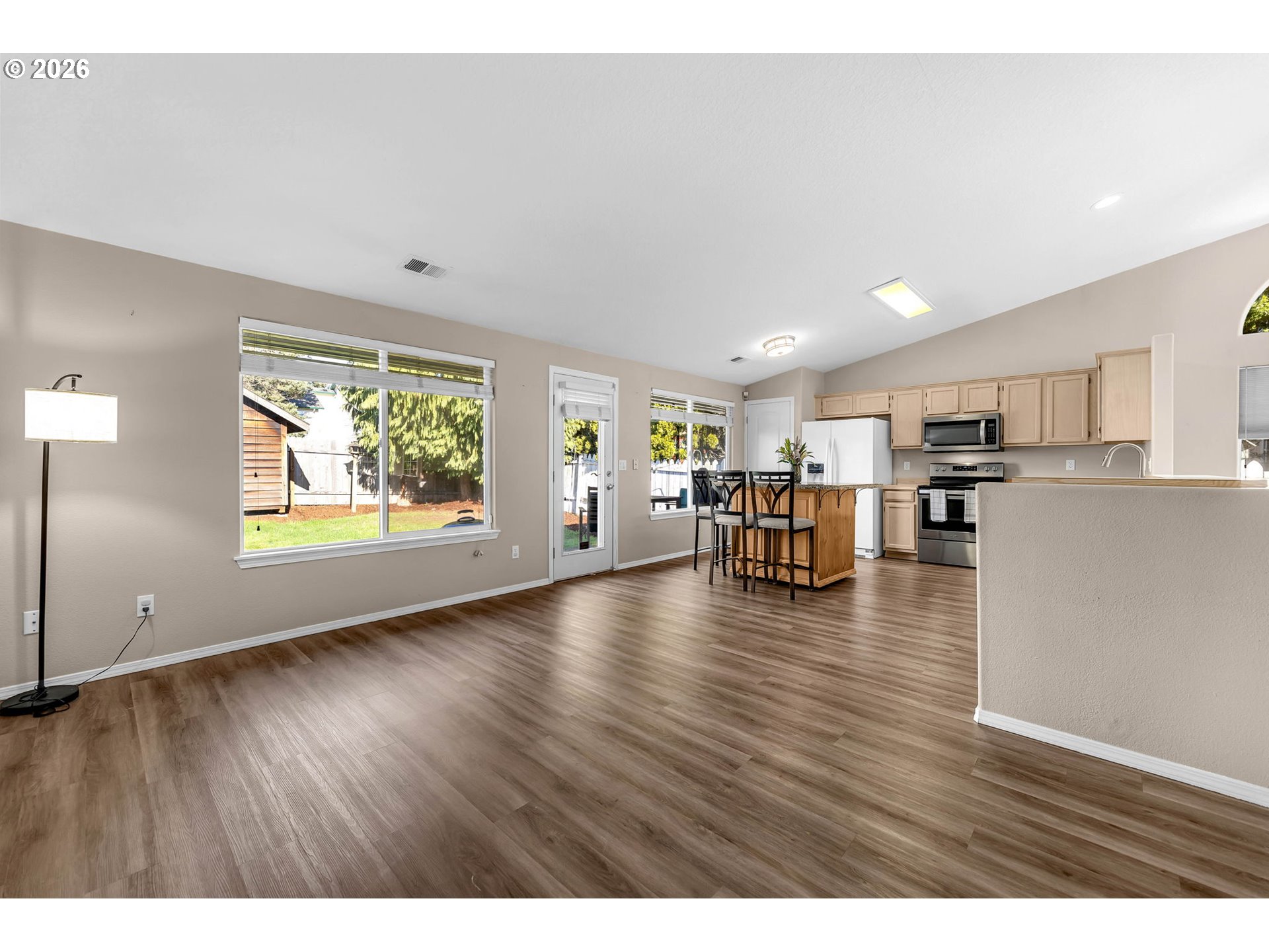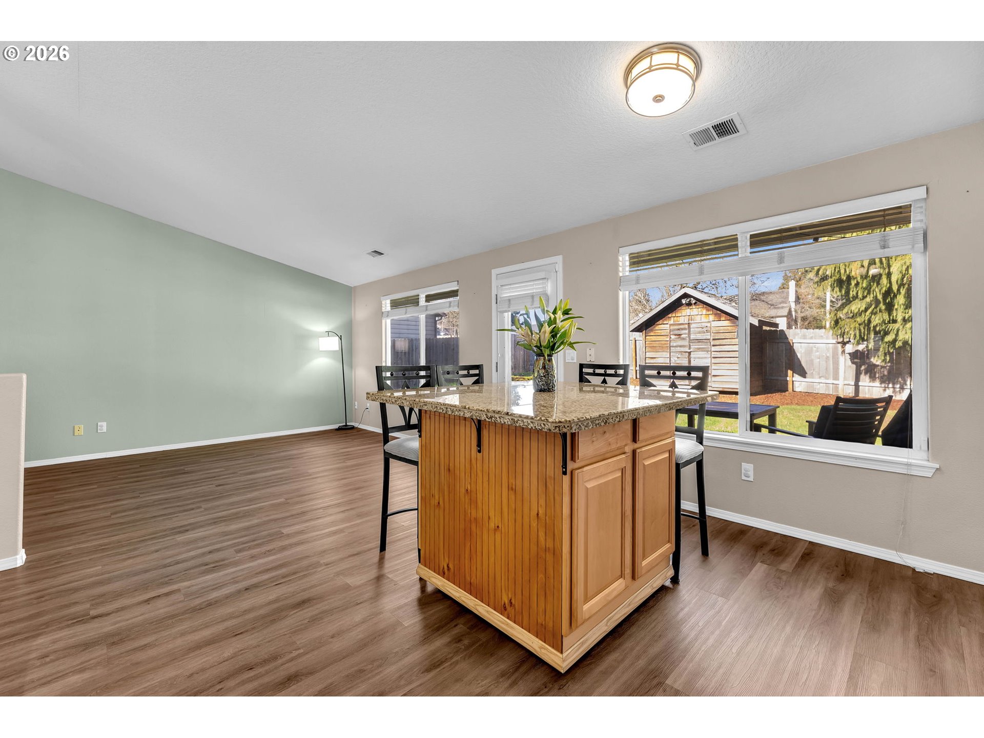 This is it! Updated and move-in ready! Open floorplan. One level featuring 3 bedrooms and 2 baths. Ranch-style home. Very spacious layout. Vaulted ceilings in the living room, kitchen, and dining areas. New Hardie plank siding installed in 2023. Kitchen has a dining island with granite countertops & a pantry. Updated stainless steel appliances. Walk-in closet in the primary bedroom. Large, fenced, and private yard with a sprinkler system. Shed with electricity in the backyard. Wood-burning fireplace in the living room. Air Cleaner Attached to Heating & Cooling System. Very convenient location. No HOA. See 3D tour and schedule a showing today!