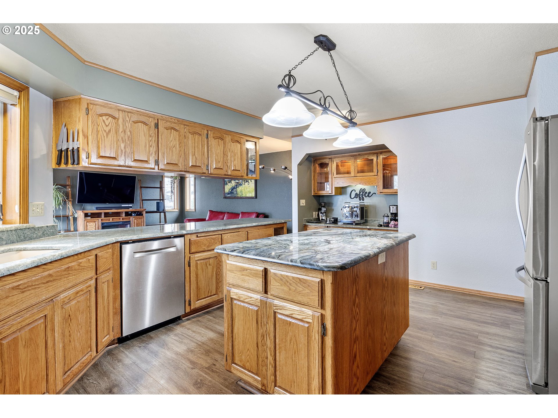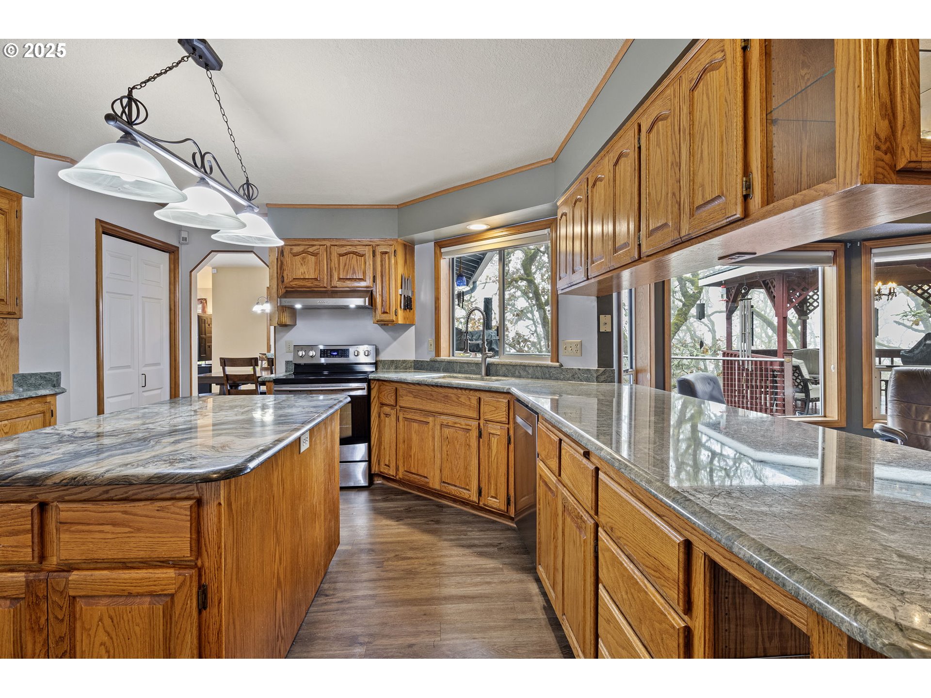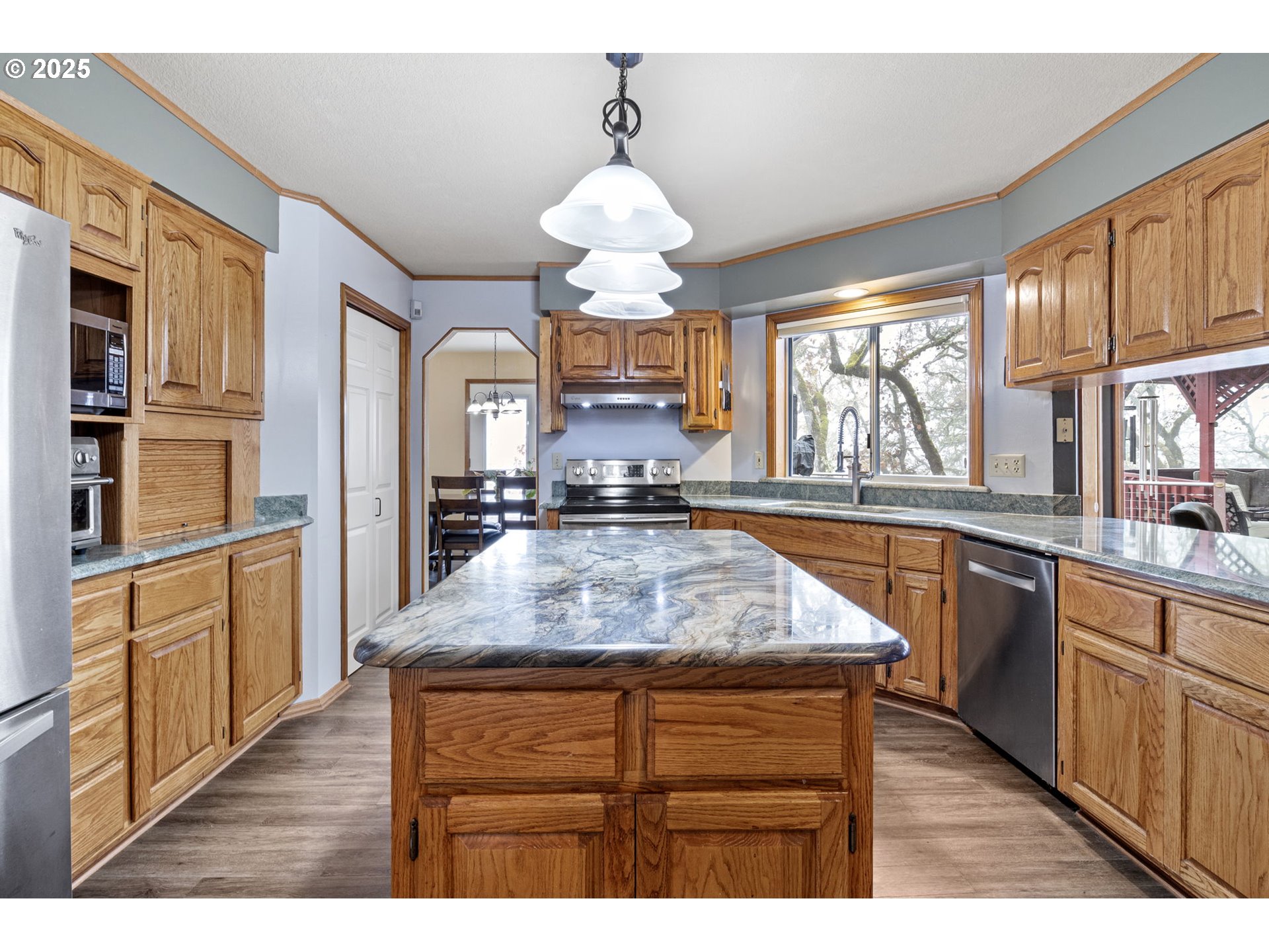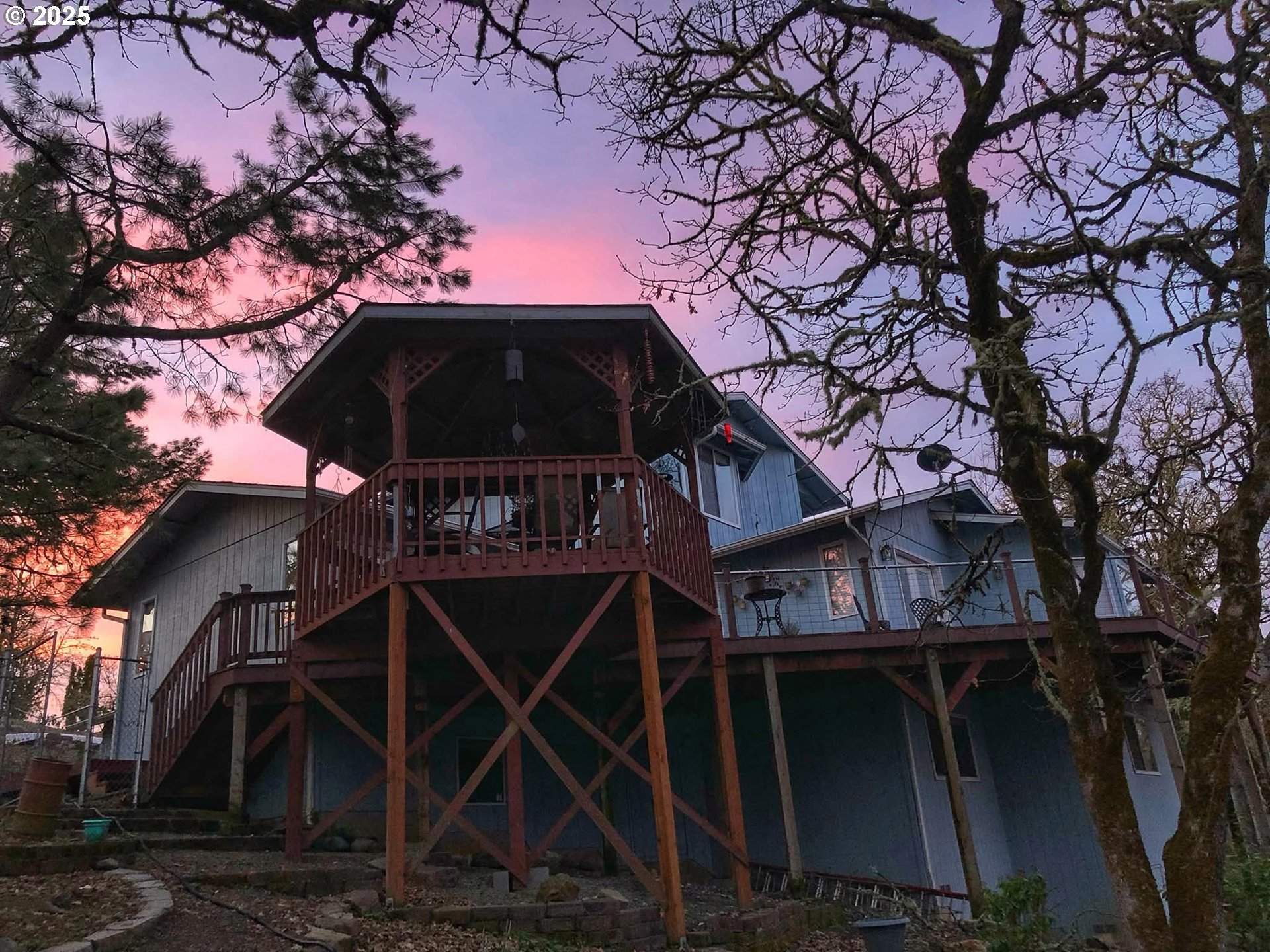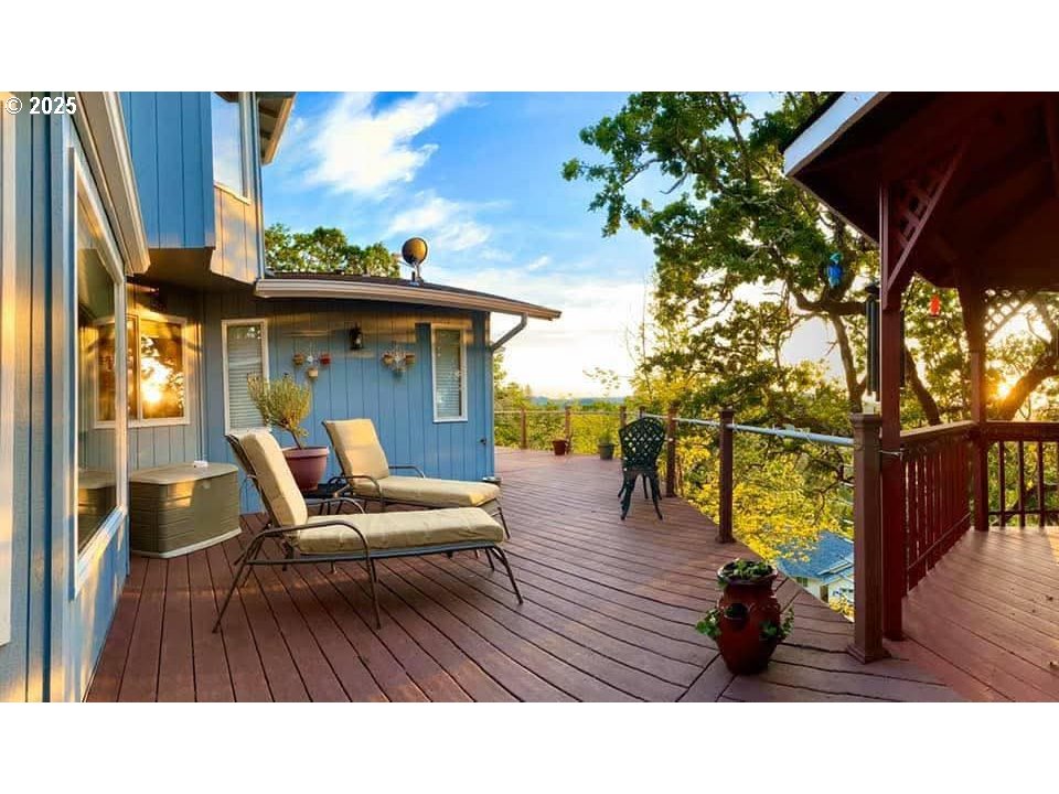 Tucked in a serene neighborhood, this home offers an “out-of-town” feel while just a few minutes from Roseburg’s shops and dining. Main level features a living room, dining room, family room, large laundry room with a sink, a full bathroom, and half bathroom. Step outside onto the balcony to enjoy the stunning views, equipped for rain or shine with the attached covered gazebo. The kitchen has custom granite countertops with a large island, as well as a coffee bar. Upstairs, the large primary suite features a walk in closet, a purse closet, bathroom, and views of the valley. Downstairs is another full bathroom, 2 bedrooms, and access to under the house storage area. There's an attached three car garage, and a place for RV Parking! The low maintenance yard has stair access from the balcony. Outdoor living shines with a large Trex deck, gazebo, and hot tub, perfect for entertaining or unwinding as the sun sets. Established gardens with roses, rhododendrons, and grapes, along with regular visits from deer, turkeys, and songbirds, complete the picture of peaceful hillside living. Whether it’s summer sunsets over the valley, misty winter mornings with fog rolling through the hills, or dramatic storm light breaking through clouds, the views here feel like living in a painting. Make this dreamy home yours!