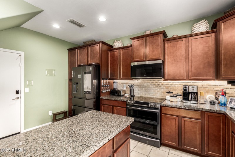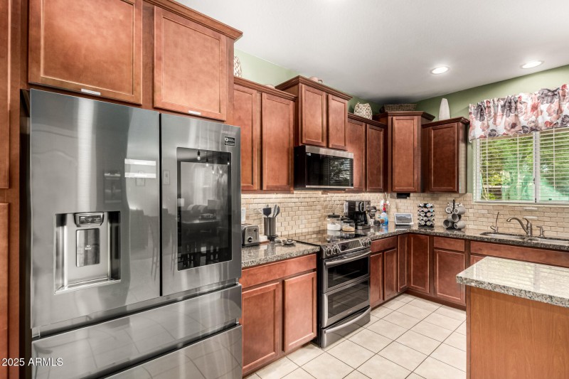 The heart of the home is the spectacular gourmet kitchen, an entertainer's dream. It boasts granite countertops, extensive cabinetry with crown moulding, and a large central island. The high-end, Wi-Fi-enabled stainless steel appliance suite includes a double oven, a whisper-quiet dishwasher, a smart microwave, and a Samsung refrigerator with a smart display.