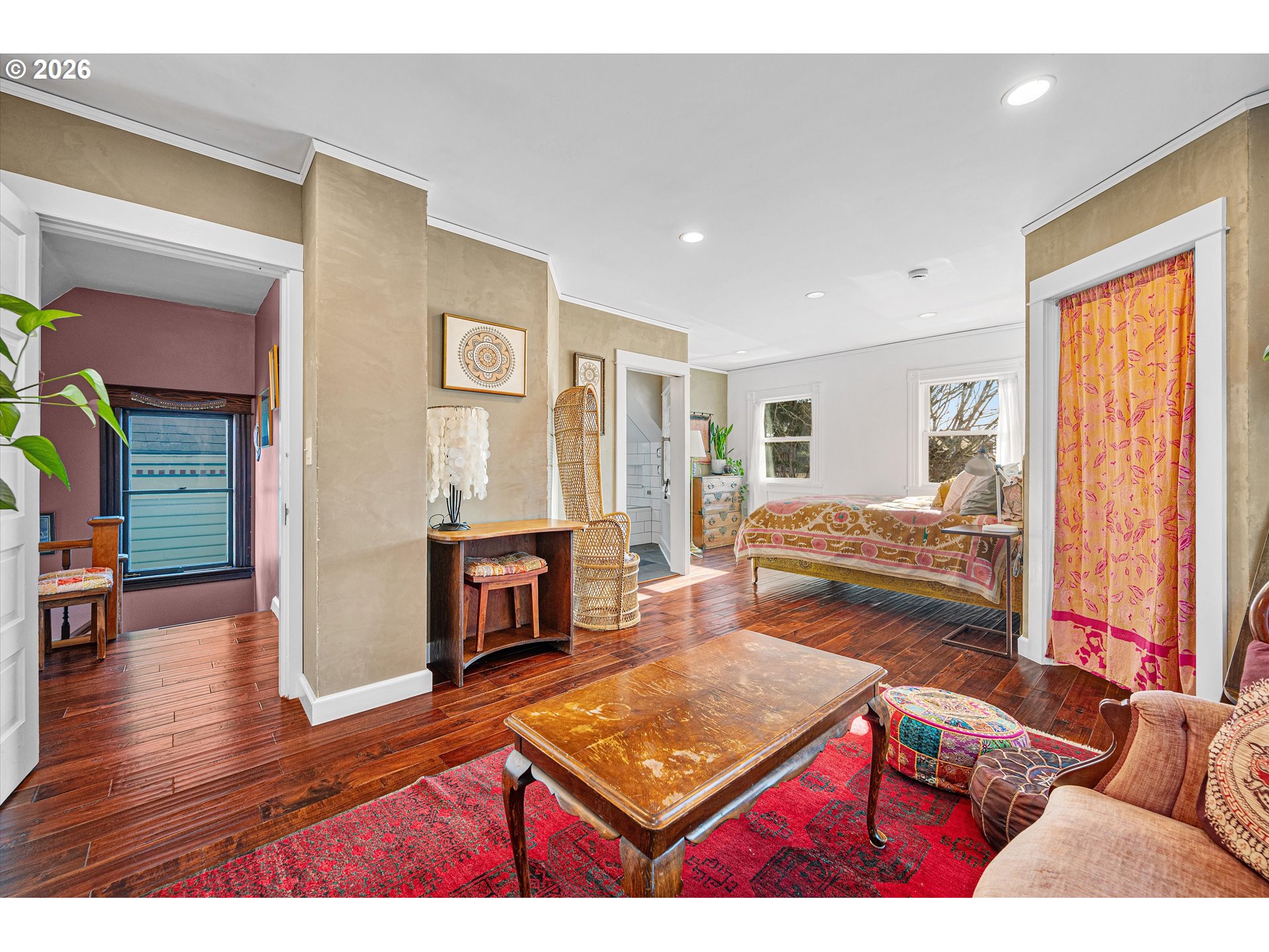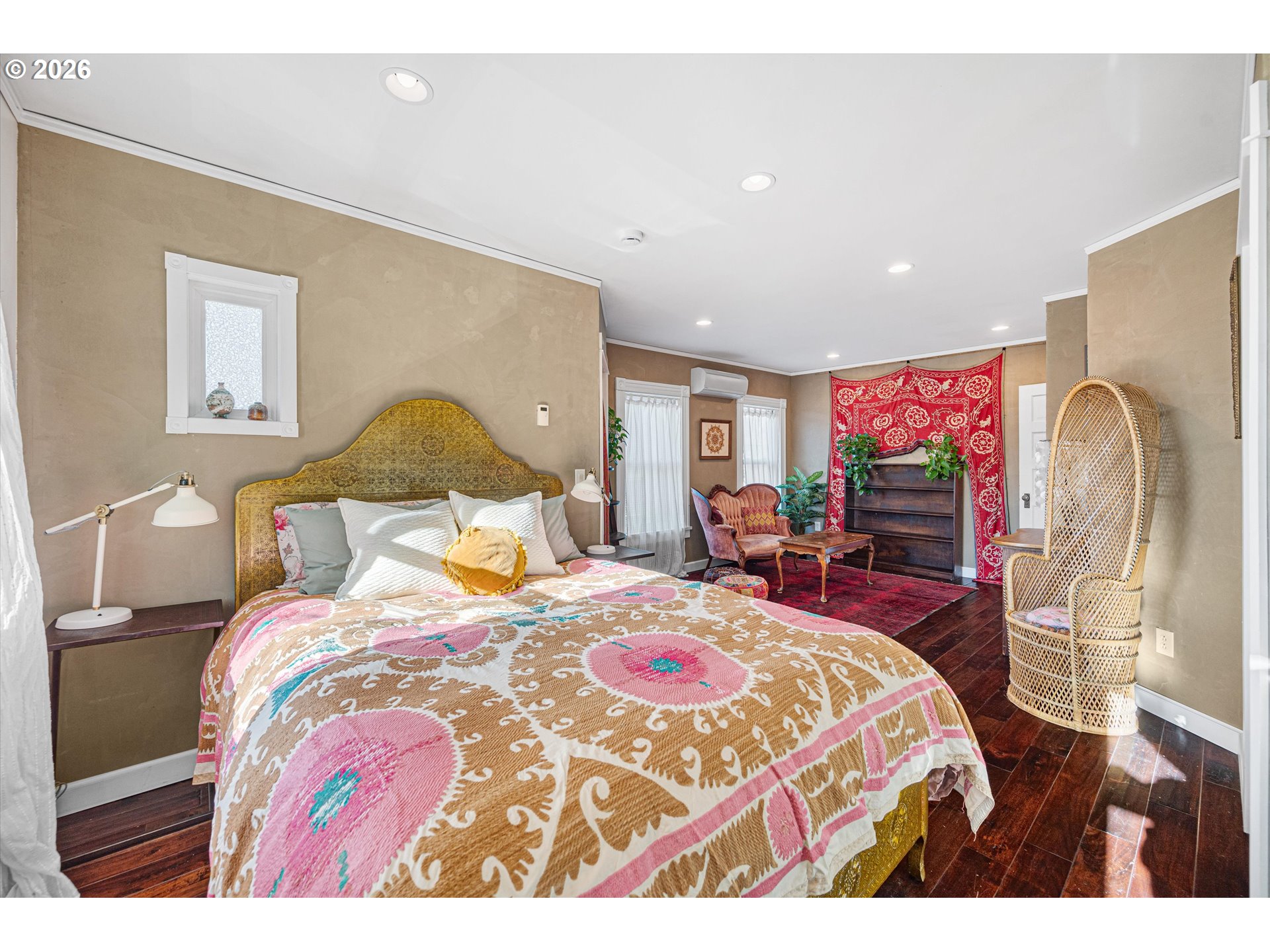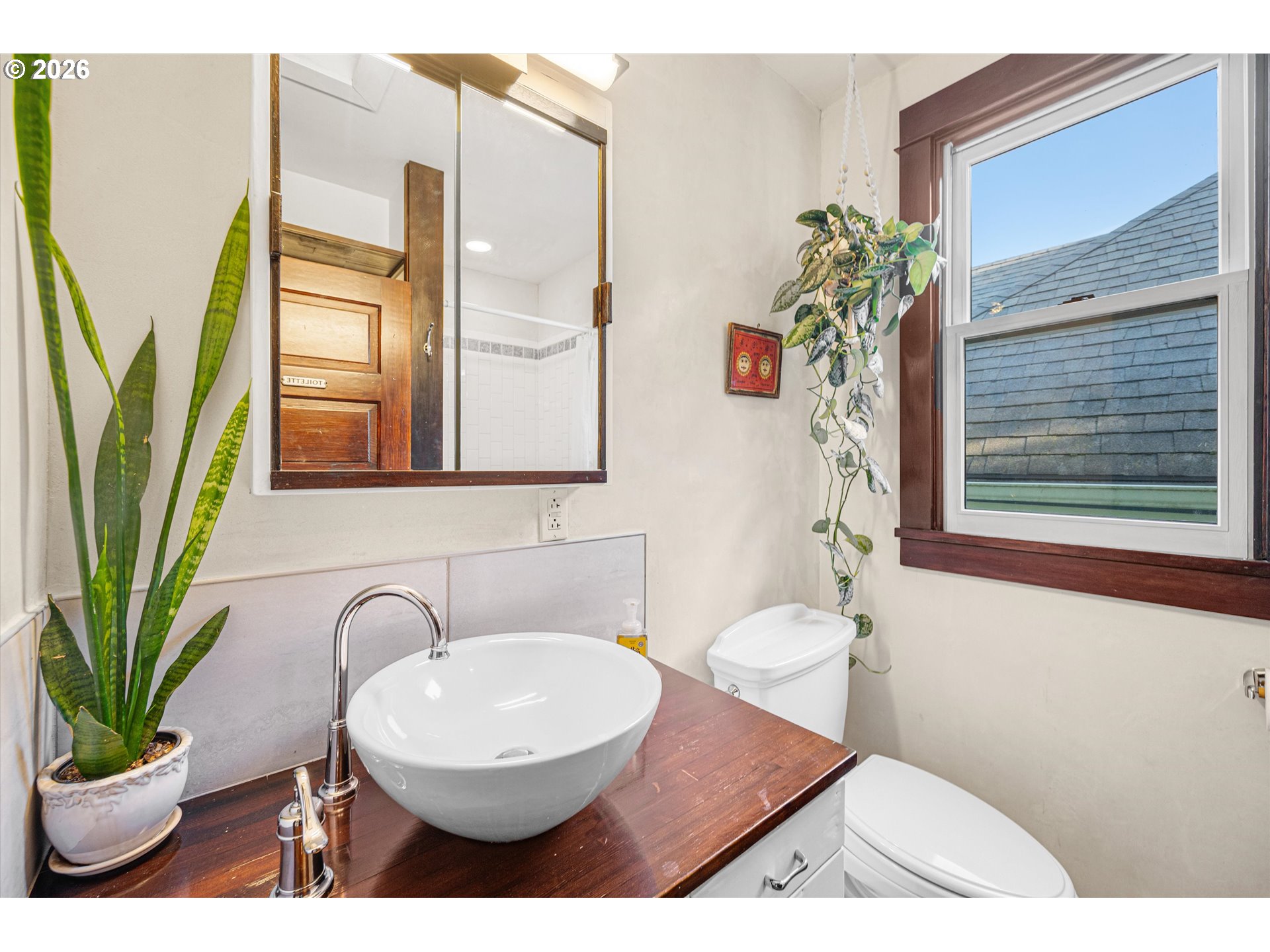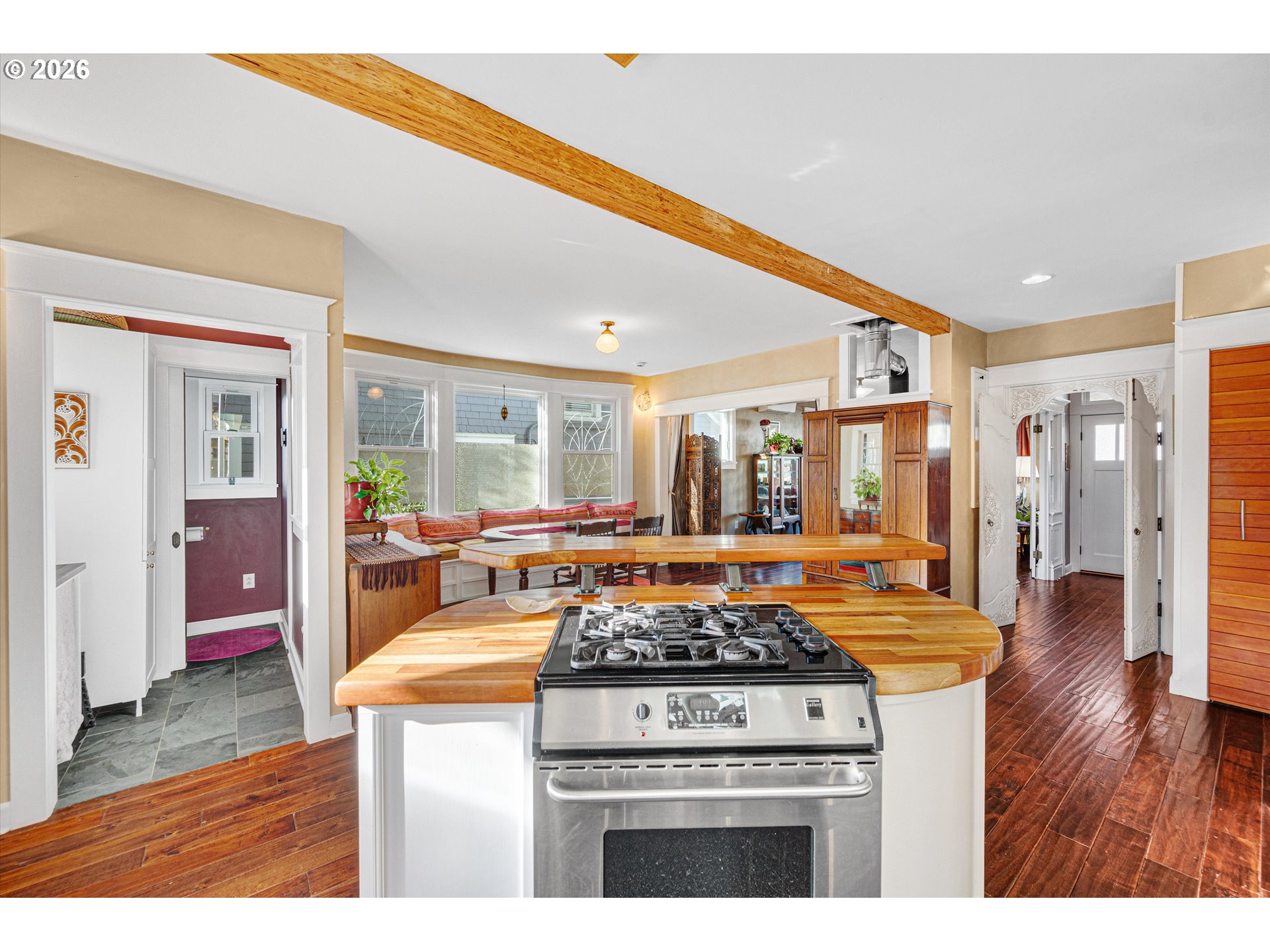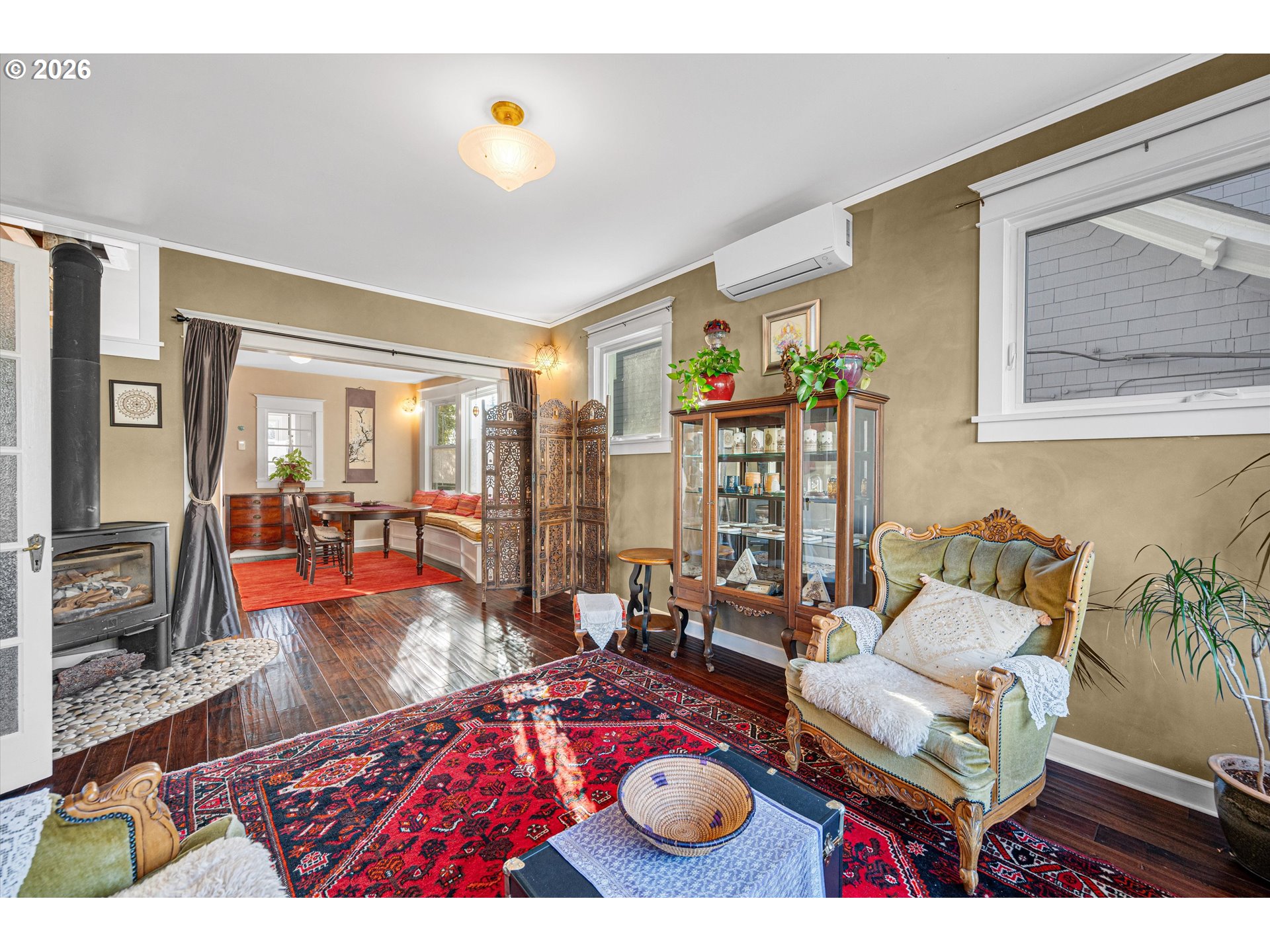 Get ready to fall in love with this dreamy one-of-a-kind beauty. This Buckman charmer blends gracious, formal rooms with an open, airy flow that feels equal parts soulful and effortless. Light pours in, rooms connect just right, and the house beckons you to relax and just enjoy. Details make the difference here... velvety American Clay walls, radiant floor heat on both levels and a striking Scandinavian woodstove is both stylish and functional. From the formal entry the custom Balinese doors lead you into the open kitchen and dining room. The stunning and bright kitchen is full of well thought out touches like the handmade wood island and smart yet hidden pantry storage. Lots of room to create amazing dishes and convene with your people! French doors open to the peaceful backyard that has a covered brick patio with seating and still plenty of room to imagine your own sanctuary space. A convenient half bath and lovely formal dining with cedar lined built in benches round out the main floor. Upstairs, the primary suite is truly unique with a fully remodeled bathroom, large scale subway tile, and a new Dolomite soaker tub ready for luxurious unwinds. A guest bedroom with a huge walk-in closet and a second full bath complete the upper level. The basement adds more flexibility with a third bedroom, bonus/flex room and loads of storage. This meticulous owner has lovingly cared for this home and has upgraded it with a seismic retrofit, newer electrical panel and windows plus a new roof and solar installed in 2024. All of this is tucked onto a quiet street in a coveted location where the best of inner SE Portland, coffee shops, restaurants, parks and culture are just a stroll away. Commercial overlay zoning opens up a multitude of possibilities. This isn't just a house. It's a vibe. A true Portland Boho Victorian at it's best... Come feel the magic within!