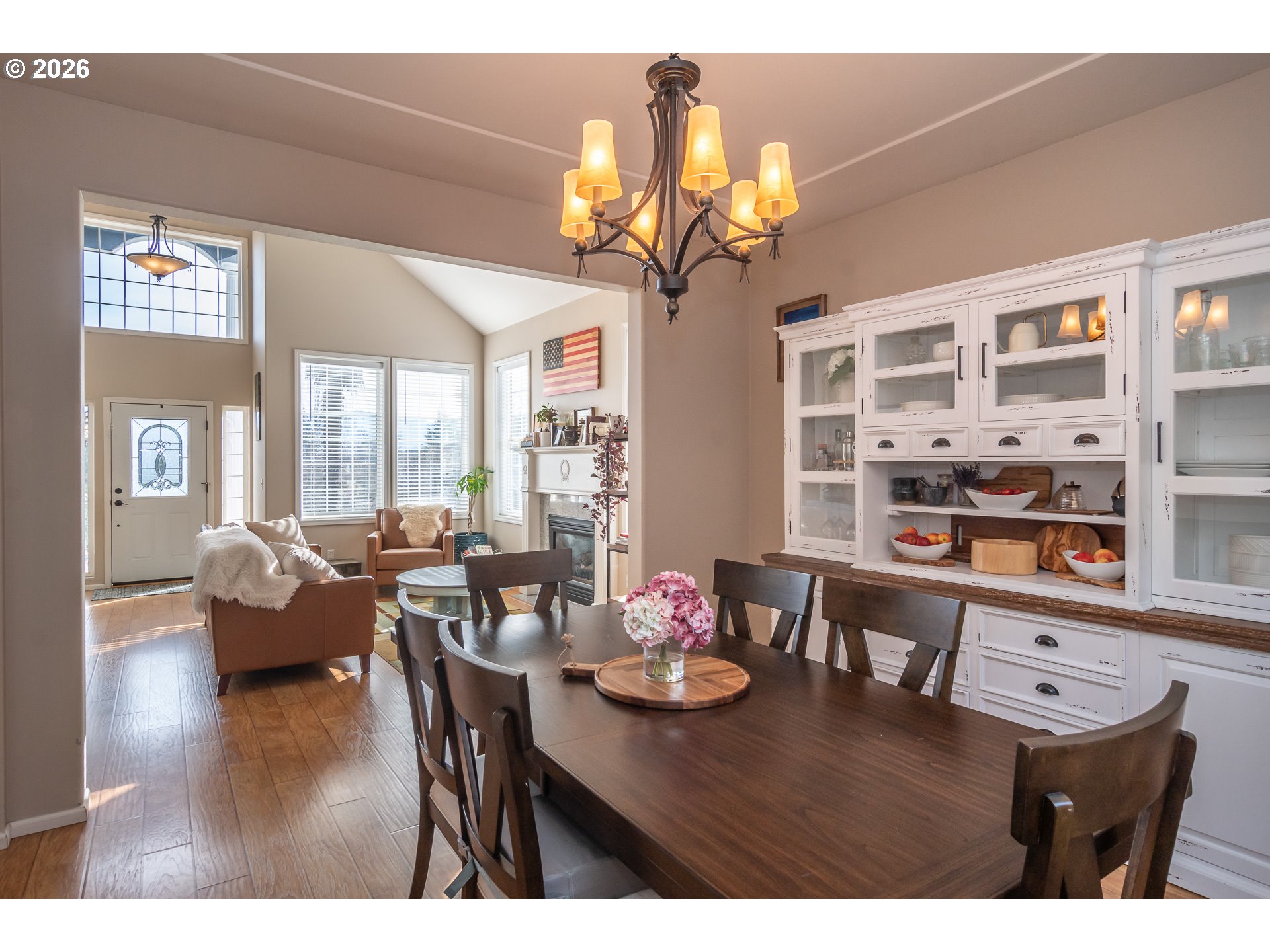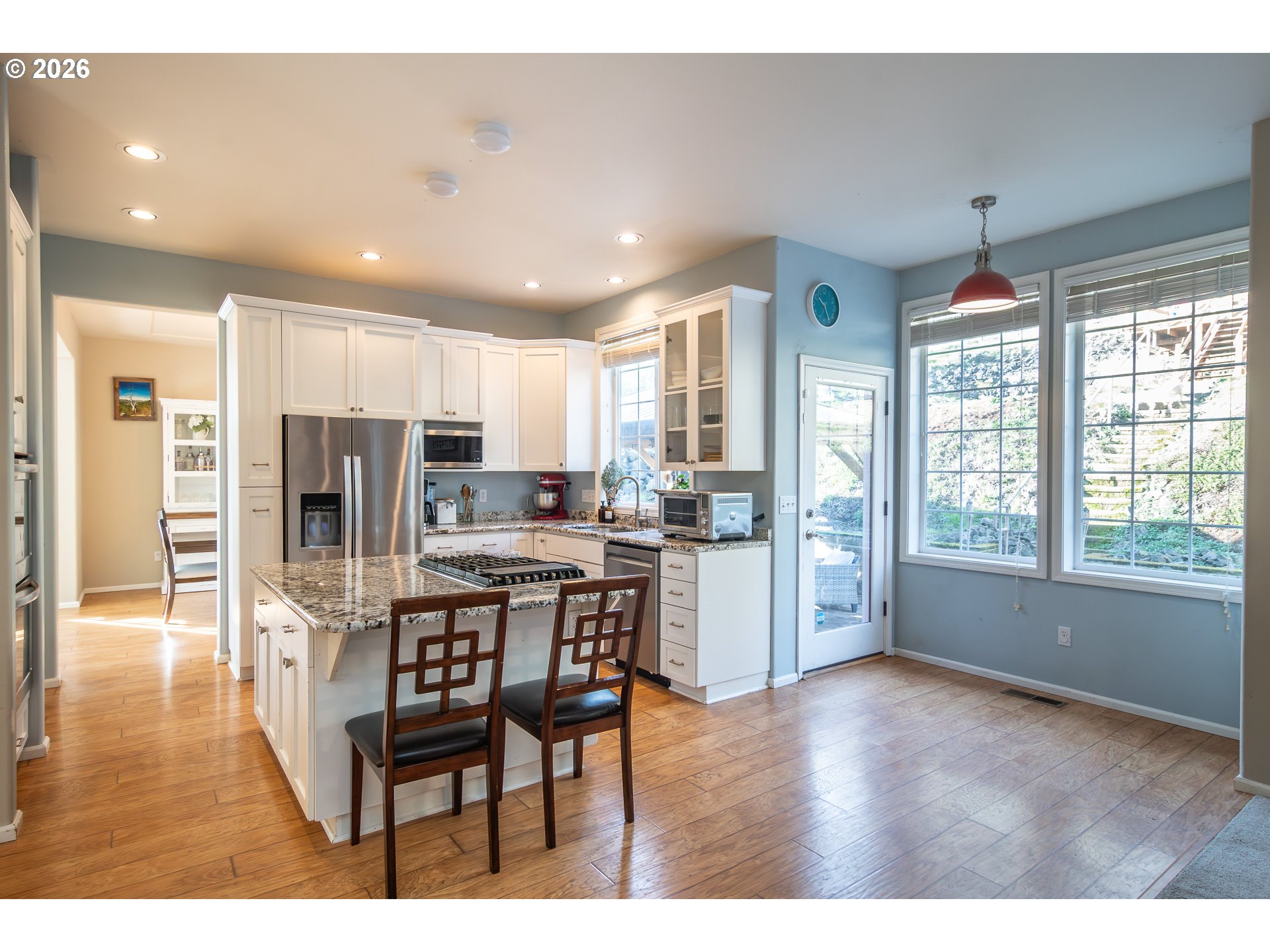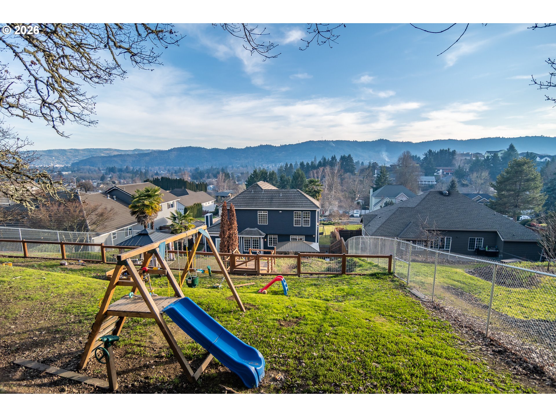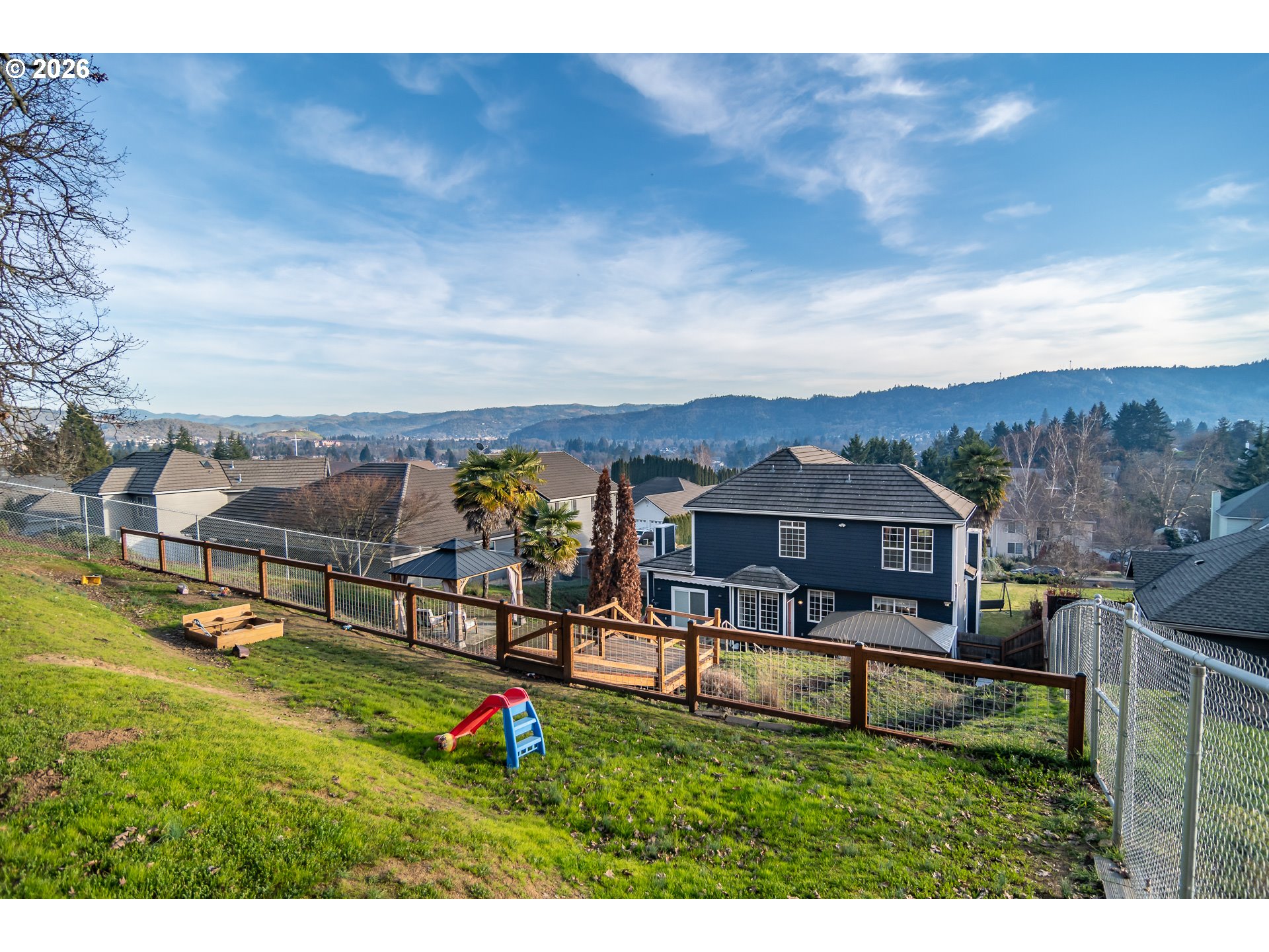 Welcome to this spacious, move-in ready home in the desirable Hucrest neighborhood, offering comfort, functionality, and stunning hillside views. Large windows throughout flood the home with natural light, highlighting the high ceilings and beautiful wood floors. This thoughtfully designed floor plan features a separate living room and dining room, with the dining area flowing into a well-appointed kitchen that opens to the family room—ideal for both daily living and entertaining. The living room includes a second gas fireplace, creating a warm and inviting space, while the family room also features its own cozy gas fireplace. The kitchen is designed for both style and efficiency with granite countertops, double ovens, a large gas cooktop, and a walk-in pantry. The primary suite serves as a peaceful retreat filled with natural light and includes an oversized walk-in shower, soaking tub, and generous walk-in closet space. Outdoor living is a highlight of this property, featuring a beautiful concrete patio with gazebos, perfect for gatherings. Terraced yard areas offer room for swingsets, horseshoes, or gardening, and the fully fenced and cross-fenced backyard adds flexibility and convenience. Additional features include RV parking with hookups, generator wiring for the home, and plenty of usable outdoor space. Located in one of Roseburg's most sought-after areas, this home blends scenic views, modern amenities, and thoughtful upgrades. Come see this exceptional property and experience everything it has to offer!