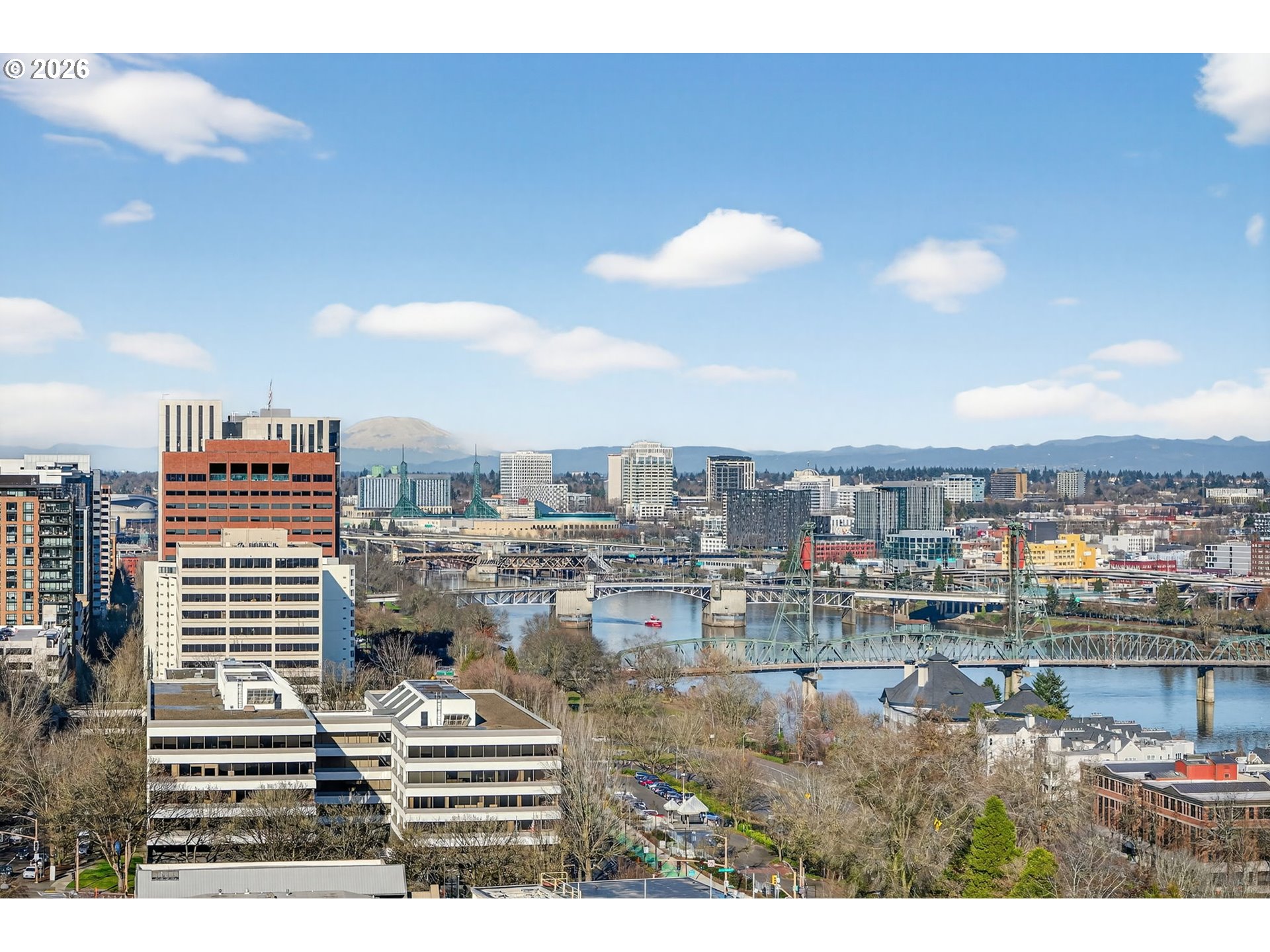 This two bedroom and one and a half bath condo is centrally located in South Downtown Portland. This bight and light condo with a great room concept has been recently refreshed with all new Luxury Plank vinyl flooring thoughout, new paint and baseboards. Kitchen has been opened up to Living and dinning area to create an open and light floorplan great for entertaining. Views of the Willamette River and Mt. St Helens from the dining area. Twinkling City lights and West hills views from the living room and the covered balcony great to enjoy peaceful sunsets. . New cozy electric fireplace, new hot water heater. Primary bedroom with bath right across the hall. The second bedroom is versatile and can serve as a guest room, home office, or cozy den. A convenient half bath completes the layout, ideal for guests. This condo also offers access to fantastic amenities, including 2 workout rooms, 2 community lounges. Enjoy the indoor saltwater pool with jacuzzi and sauna or take dip in the outdoor pool during summer months. 53 Guest parking spaces unheard of downtown. Light rail and bus line outside your door, the street car is one block north. Stroll the Halprin sequence to dining, and entertainment just steps away, you’ll enjoy all that city living has to offer. Don’t miss your chance to own this stylish urban retreat! Close to OHSU and Portland state