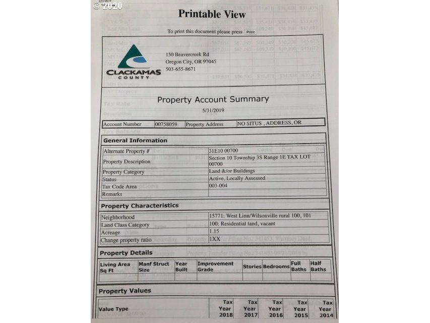 - This rare Stafford 1.15 acre undeveloped lot has a dramatic 450ft driveway that crests atop a magnificent Mt Hood view and build site. Exceptional opportunity to own in Stafford’s most coveted neighborhood located at the top of Petes Mountain in West Linn with $1million-$15million dollar properties throughout the private hills of Stafford. Adjacent to Oregon Golf Club private property, between famous Tumwater Vineyard & Petes Mountain Vineyard & Winery and only 1 mile to Oregon Equestrian Center. This vacant land is surrounded by large natural acreage properties with hidden estates, and rolling hills, the privacy and Mountain view is beyond relaxing on all sides, with beautiful southern sunlight exposure, & only a few minutes to I-205 10th street exit and the adorable Willamette Falls main street full of shops and restaurants. PGE, NW Gas, & cable on property at top Driveway, (county pre-approved 75’ x 50’ build site/driveway upgrade/well/septic/fire truck turnaround & fuel break in 2021) Survey, soil test, and template test filed with county. Seller licensed Broker/Buyer to perform their own due diligence to verify with Clackamas County AGF zoning many options. Includes a no value 35’ x35’ barn with horse stall and loft, buyer options to tear down or rebuild, exceptional opportunity investment. Property corners and boundaries are flagged and NW Gas underground runs to top of driveway and is marked in orange.