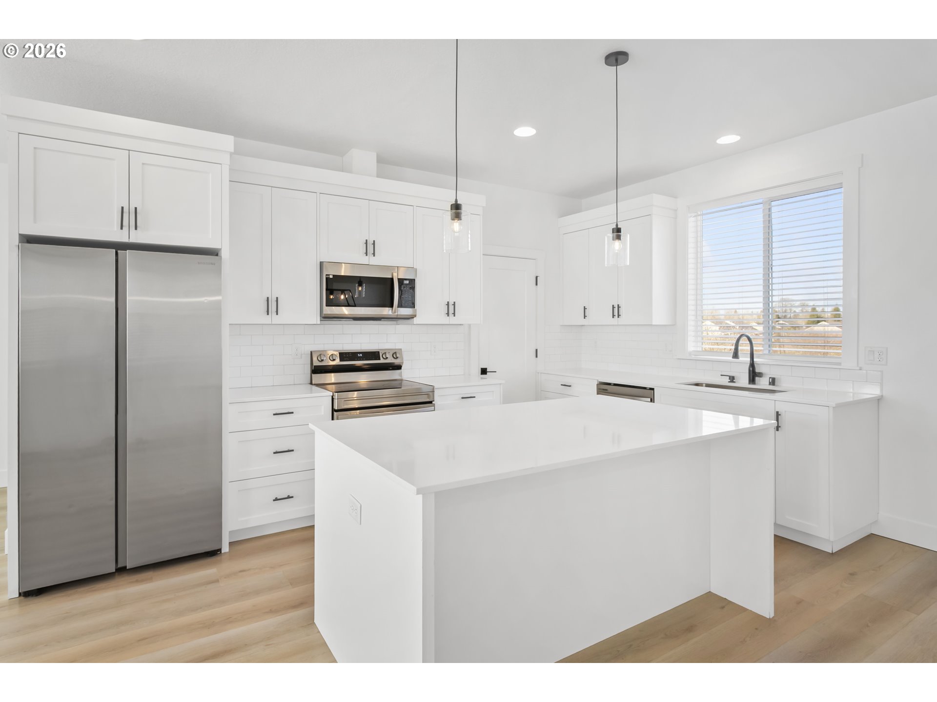 This stunning, large tri-level townhome offers 2,201 square feet of thoughtfully designed living space and was built in 2022, providing a modern layout with like-new finishes throughout. The home features luxury vinyl plank flooring, quartz countertops, and stylish tile, creating a clean and contemporary feel from top to bottom.The first floor includes one bedroom and one full bathroom, offering an excellent option for a possible in-law quarters, guest suite, home office, or separate living area. This flexible space is ideal for multigenerational living or anyone needing privacy from the main living areas.The second level serves as the heart of the home, featuring an open-concept great room, kitchen, and dining area designed for both everyday living and entertaining. The kitchen offers ample counter space, modern cabinetry, and quality finishes, while the adjacent dining and living spaces create a seamless flow. A convenient half bathroom is also located on this level. Large windows provide abundant natural light and showcase the peaceful greenbelt views behind the home.The third floor features three bedrooms and two full bathrooms, including a spacious primary suite with a walk-in closet and private bath. Two additional bedrooms and a full bathroom complete the upper level, providing plenty of room for family, guests, or work-from-home needs. With a total of 3.5 bathrooms, a two-car garage, and a desirable greenbelt lot, this townhome offers space, flexibility, and comfort in a prime Battle Ground, Washington location.