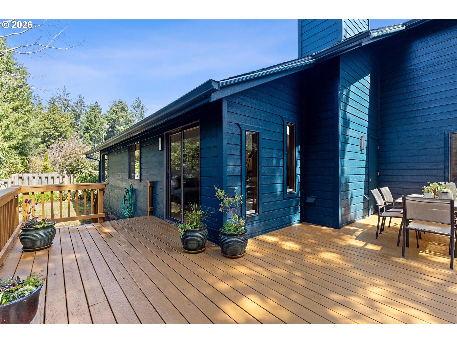 The epitome of cool is found in this renovated contemporary home in the heart of Waldport! Dramatic design abounds in the spacious living room, skylights, wood-burning fireplace, stunning hardwood flooring throughout, and vaulted ceilings. Enjoy the expansive, wrap-around entertaining deck and outdoor living space overlooking the private, fenced yard. The chef will revel in the updated kitchen with newer stainless-steel appliances and glass tile backsplash. Retreat to the upstairs bonus room - offering versatility with plenty of space for a third bedroom, a hobby room, or den/office! Main level living with primary bedroom and ensuite bath. Spacious guest bedroom and guest bath. 2 car attached garage. Private setting on an oversized (70 x 100) lot. Updates included new furnace, exterior paint, and new roof in 2022. Embrace the coastal lifestyle with the Alsea River and Beach accesses nearby. Conveniently located only minutes to grocery, bakery, dining and shopping!
