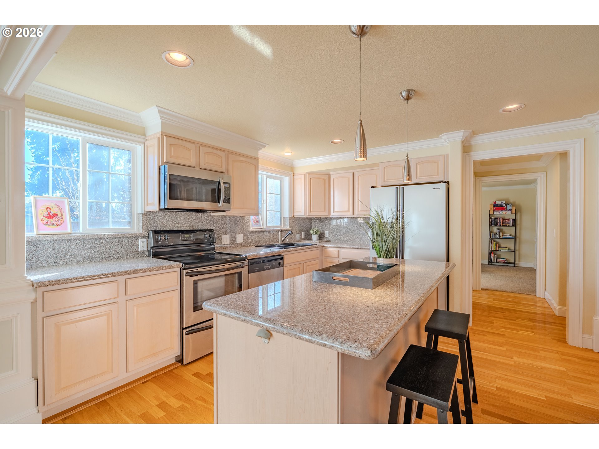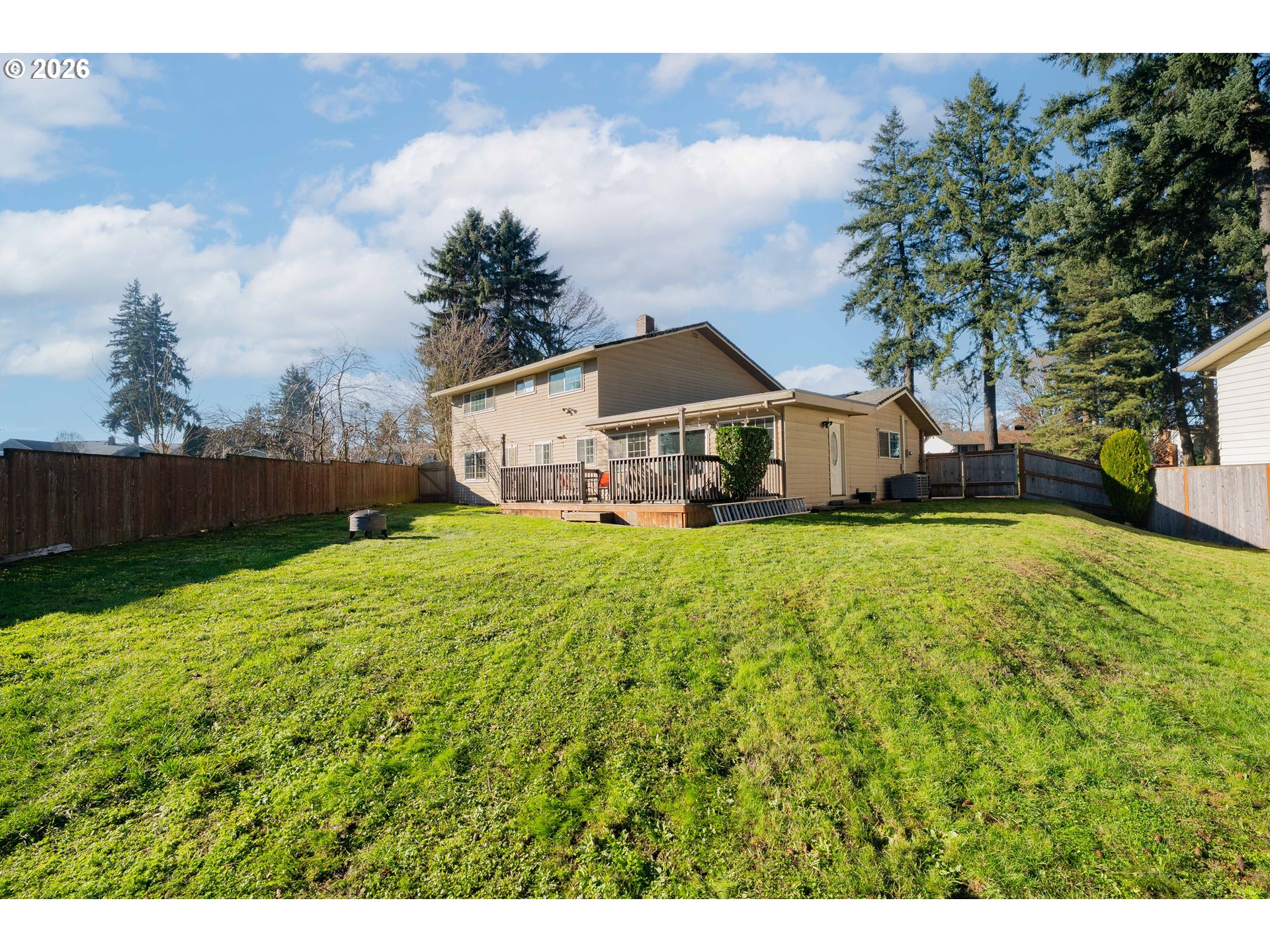 Set on a huge lot at the end of a quiet cul-de-sac, this beautifully remodeled and thoughtfully updated 4-bedroom, 2.5-bath elegant home offers a refined yet comfortable feel throughout. Rich hardwood flooring, crown molding, recessed lighting, and quality finishes set a warm, elevated tone. The kitchen is both stylish and functional, featuring gorgeous granite countertops with a full-height granite backsplash, stainless appliances, pendant lighting, and a breakfast bar. Dining options are plentiful, with the breakfast bar, formal dining area, or the bonus room that opens to the backyard, creating effortless indoor-outdoor access and an ideal setting for entertaining. Upstairs, plush upgraded carpet continues through the living spaces, including three bedrooms in addition to the primary suite. The primary includes recessed lighting and a beautifully finished, spacious ensuite showcasing marble tile and a soaking tub. The huge, fully fenced backyard offers abundant space for outdoor enjoyment, complete with a large deck, storage shed, and plenty of room to run and play. Convenient to shopping, dining, PeaceHealth, and numerous parks, with easy access to I-205 for commuting to Portland, this home blends timeless style, comfort, and everyday convenience.