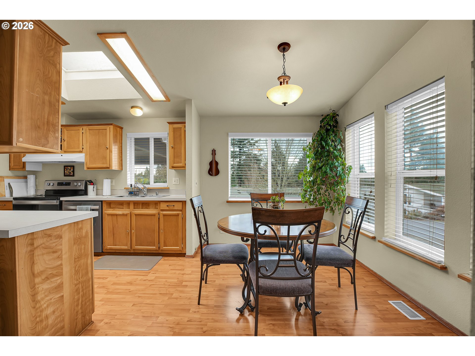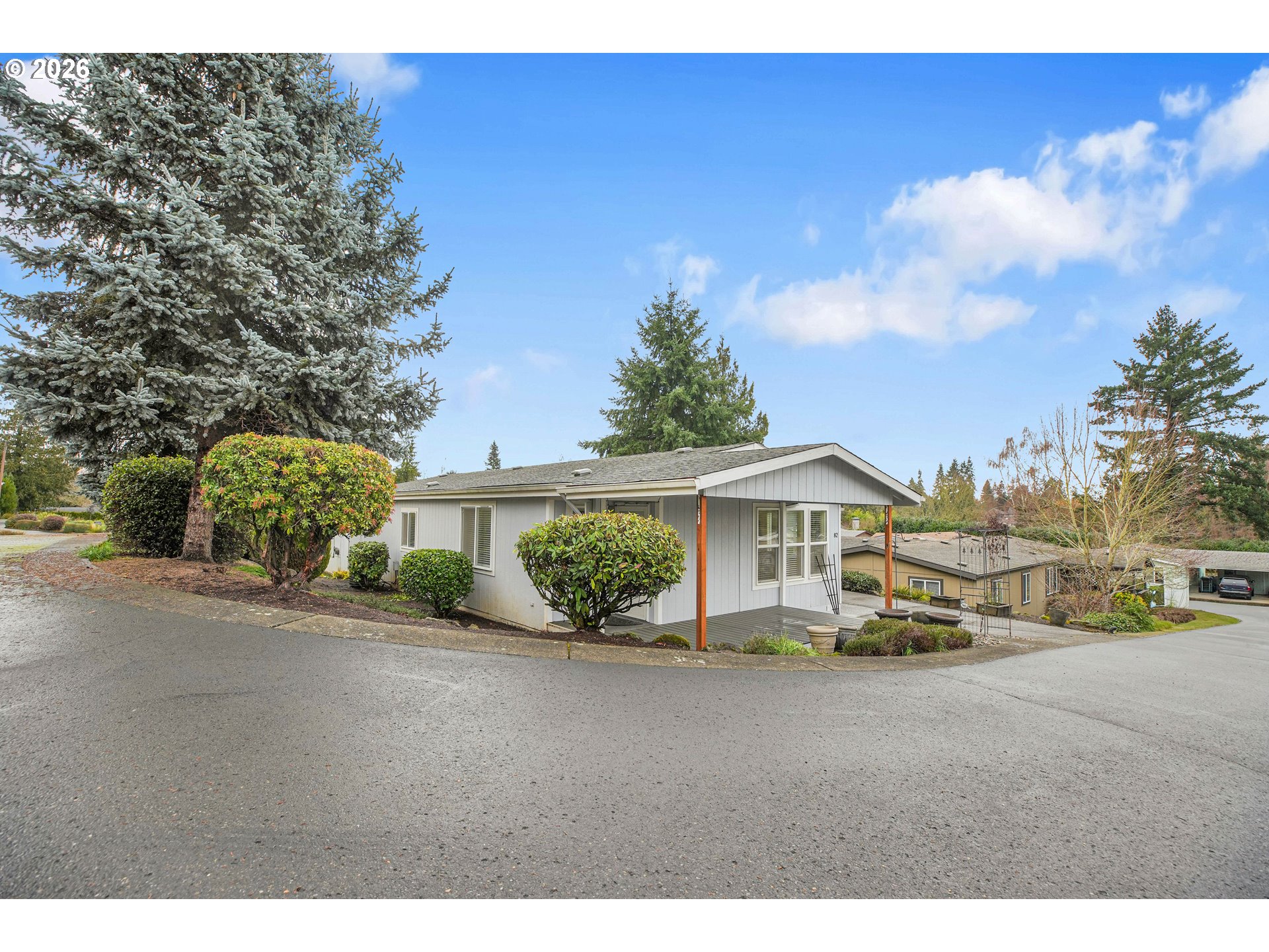 Welcome to this well maintained 1995 SilverCrest manufactured home located in the sought after Oak Haven 55+ community. This home is set on an elevated corner lot with a beautiful territorial view with added privacy. At 1,132 sq ft, this 2 bedroom, 2 bath home features vaulted ceilings in the living room, dining room, kitchen and primary suite creating a bright and open living environment. Abundant natural light pours through the dining area and skylit kitchen, which is equipped with stainless steel appliances. All appliances stay, including the washer and dryer. The spacious vaulted primary suite offers a large private en-suite bathroom with ample storage. Enjoy outdoor living from the covered front porch with Trex decking, perfect for relaxing and taking in the elevated setting. A new heat pump was installed in 2022 and the roof is approximately 10 years old. Additional features include a large driveway, covered carport, large attached storage room offering excellent functionality. The landscaped yard complements the home's bright, well-cared for condition. Oak Haven allows two small pets (up to 30 lbs, registration required). RV parking may be available for an additional monthly fee. Current space rent is $834.75/mo, with garbage/recycling/yard debris included. PARK APPROVAL REQUIRED PRIOR TO CLOSE. Select personal property items available for purchase separately.
