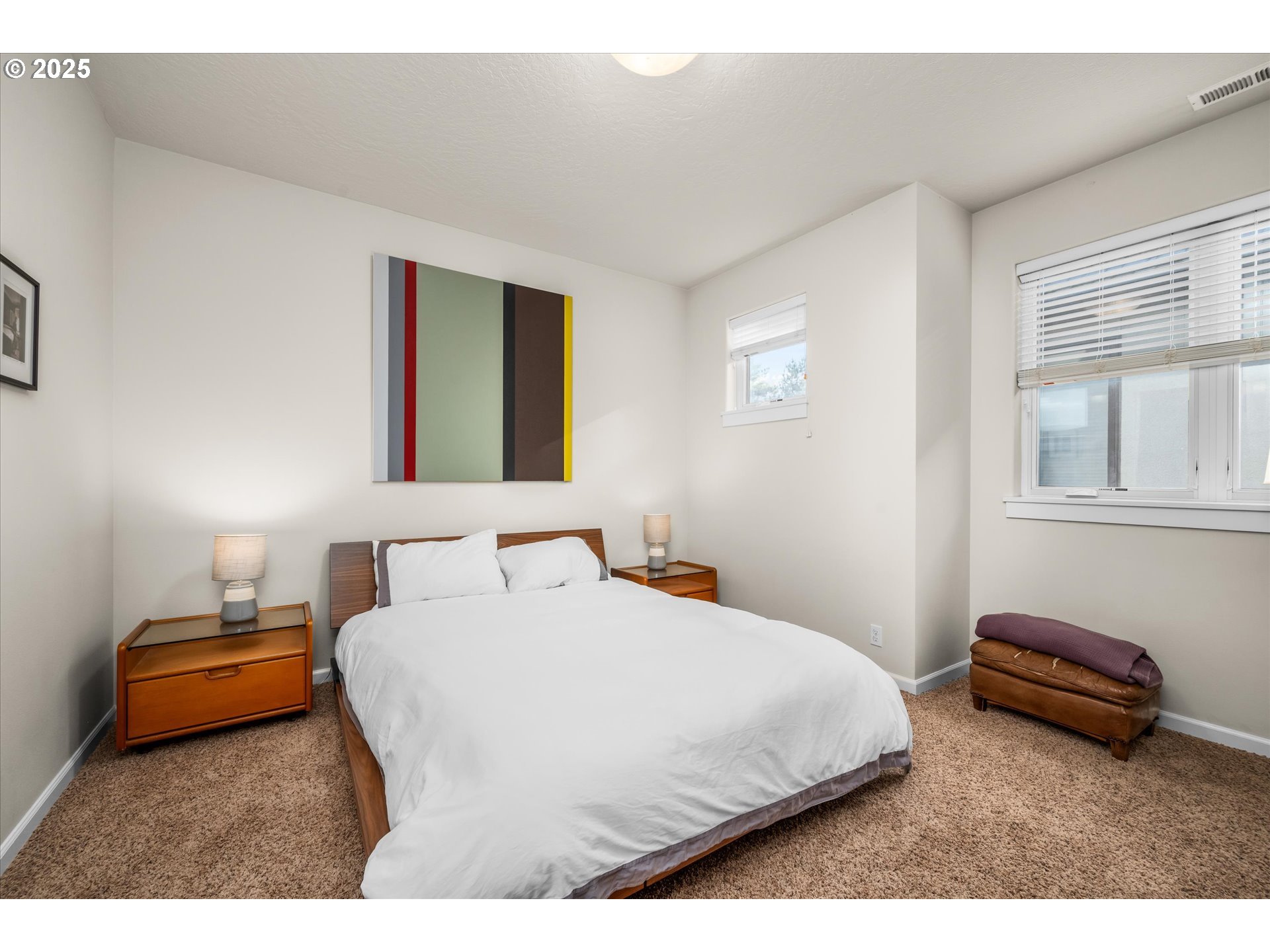 Crescent Village contemporary home with main level living! An accommodating floor plan with primary living on the main level. A designated office complete with wood built-in desks with an exterior access to the front porch via French doors. Great room living area has hand-scraped flooring, a gas stone fireplace adjoining the kitchen with a granite island, new Bosch and LG appliances. Laundry room with pantry closet, tile floors in bathrooms and Corian countertops in kitchen and bathrooms while the primary bedroom has a walk-in tile shower and dual sink stations. Upper level hosts a bonus room, with a ceiling fan and 2 bedrooms. One bedroom offers its own vanity with a private door to the full bath suite which can also be accessed via the bonus room. Multiple exterior gathering areas, a BBQ area off the kitchen and a garden with a flagstone patio. Enjoy the convenience and energy of this special location, in the community of Crescent Village, with dining, exercise, spa, and more! Nearby Umso City Park with trails, playground, and pickleball!